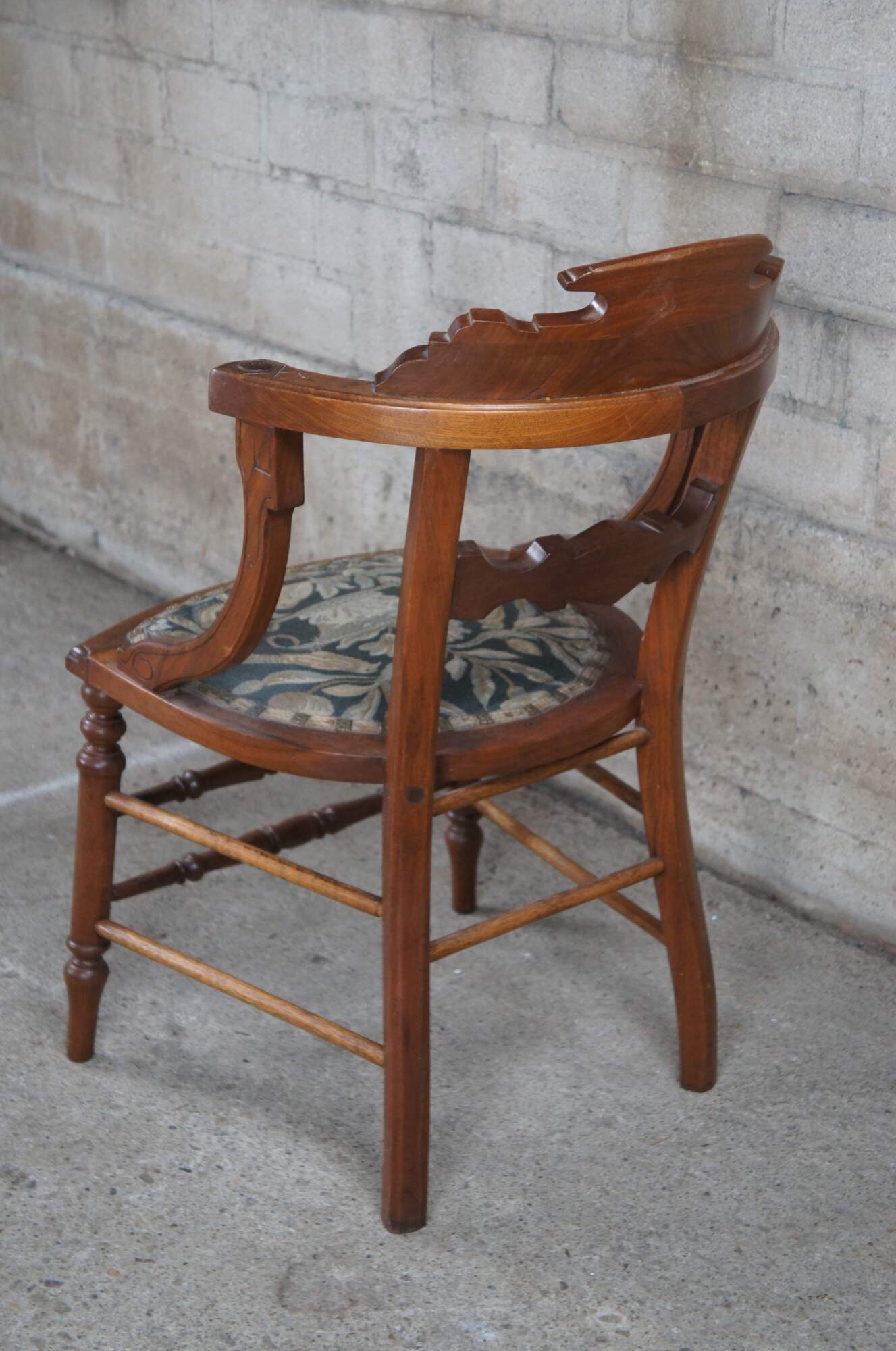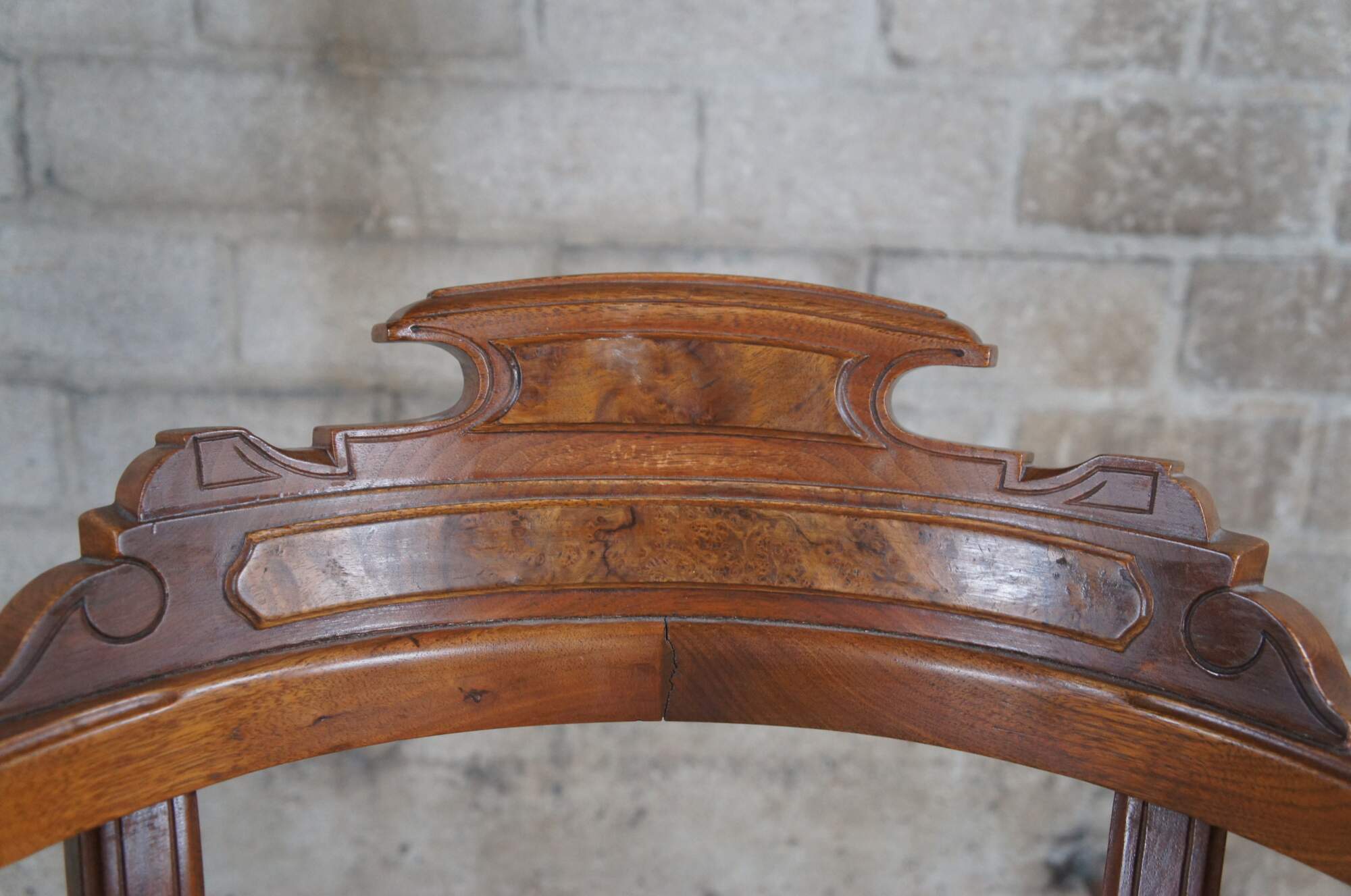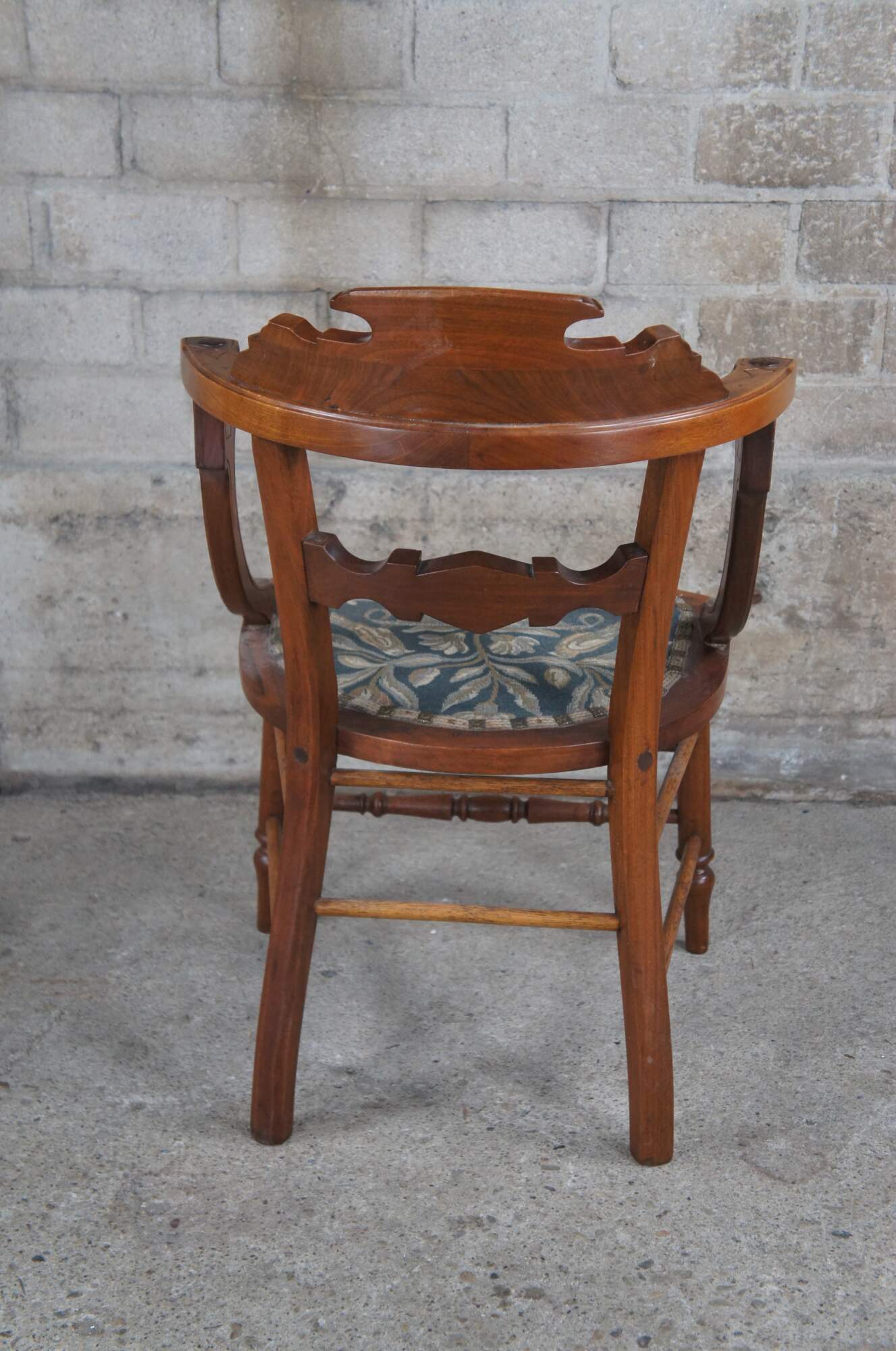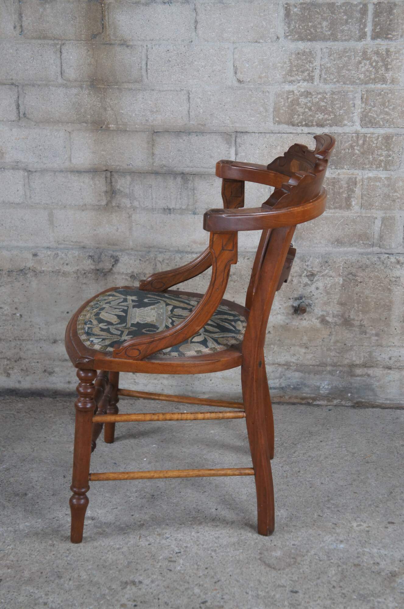 A quaint late 19th century Renaissance Revival side chair. Made from walnut with burled panels. Features a curved back with downswept arms and embroidered seat. Seat features a scene of birds and flowers with ornate metal fasteners on the cording. The chair is supported by turned legs along the front with turned stretchers.
