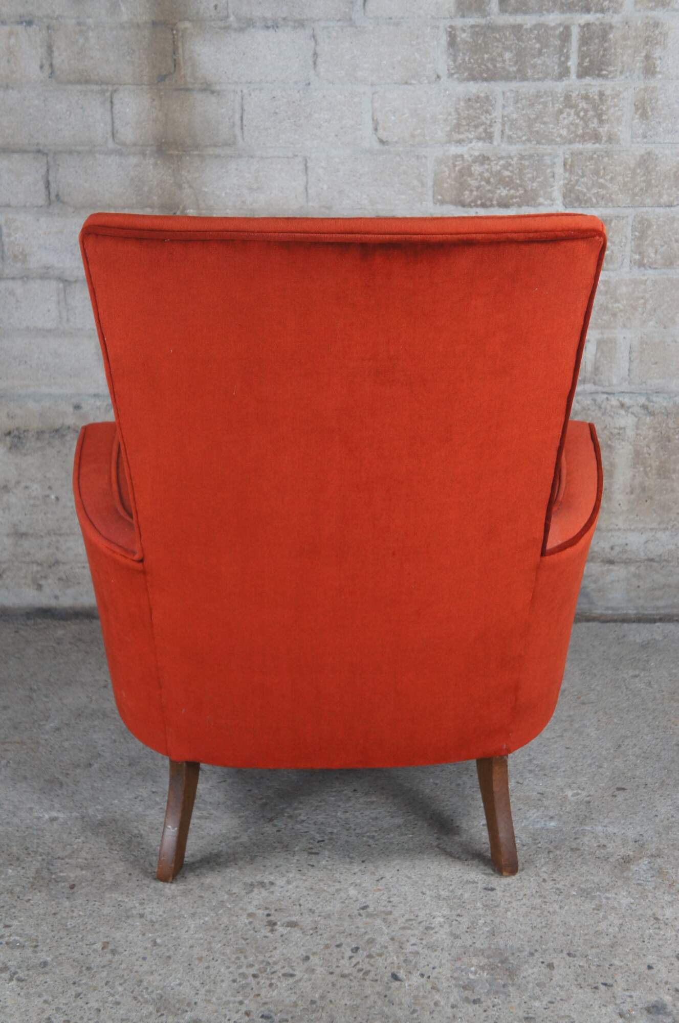 Red velvet highback lounge chair. Features a high padded back and low arms over distressed walnut turned feet.
