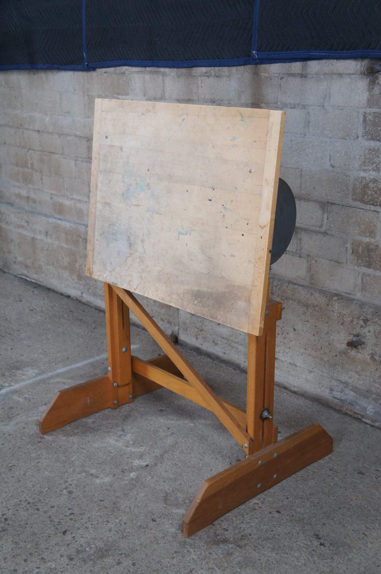 Vintage H. E. Smith Company industrial drafting table or architectural desk with wooden trestle legs, surface adjustable from 90 degrees vertical to 90 degrees horizontal, and horizontal straight edge slide. Drawing Room Furniture from Adrian Michigan.