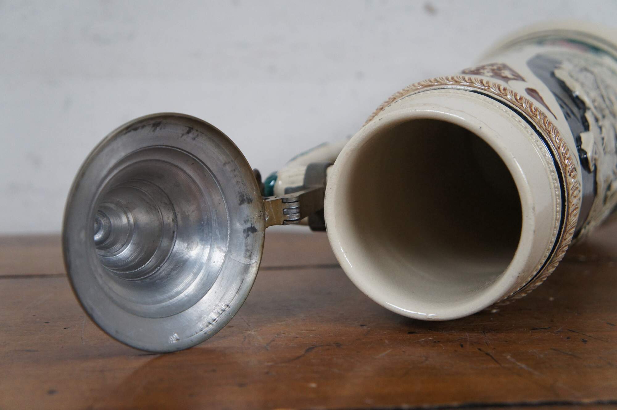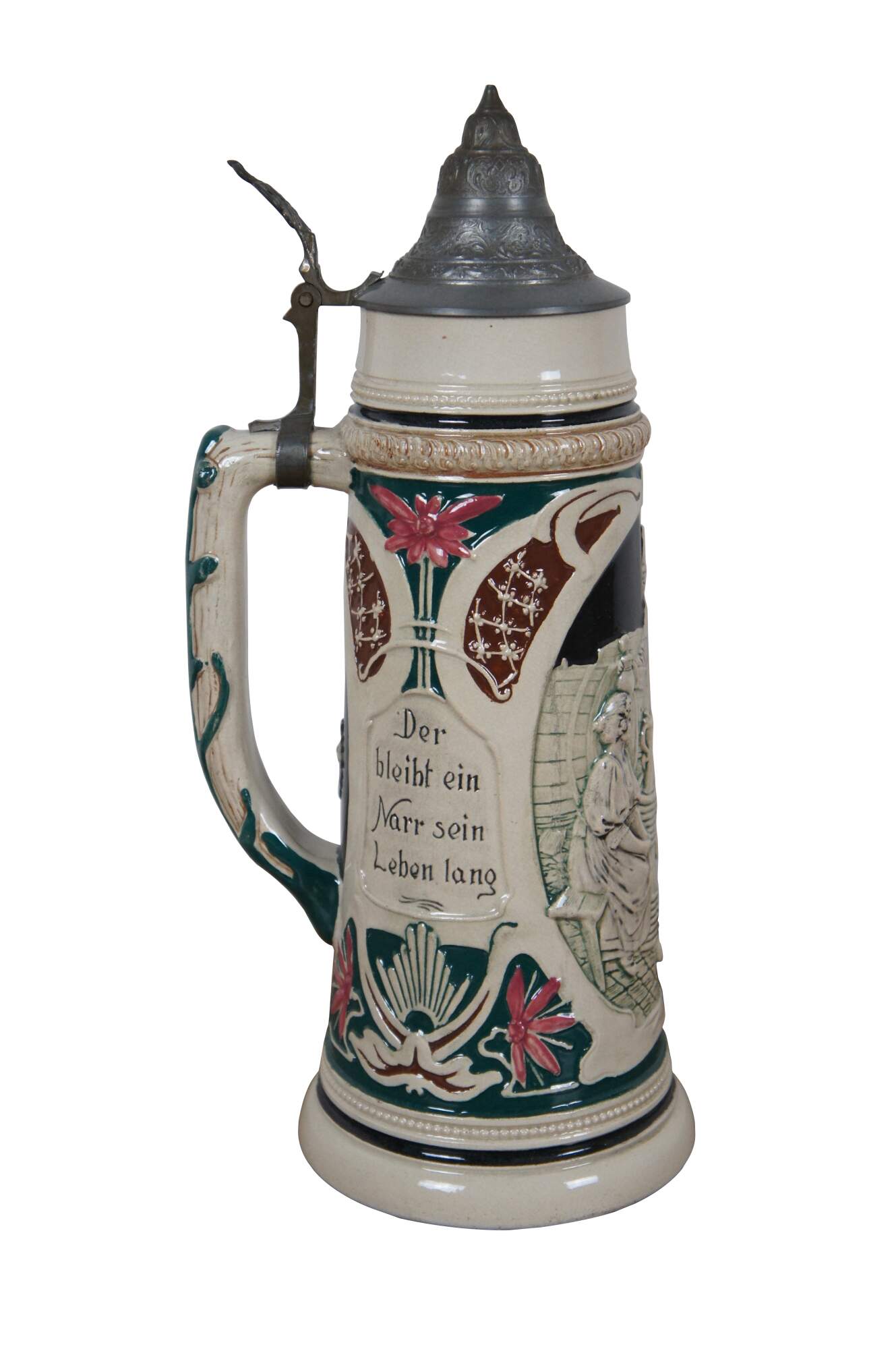 Circa mid 20th century 1 1/2 liter German stoneware stein decorated in green, brown, pink and black with flowers and figures seated at a tavern table, one playing a mandolin. Panels on either side read "Der bleiht ein Narr sein Leben lang" (He'll be a fool all his life) and "Wer nicht leibt Wein Weib un Gesang" (Who doesn't love wine, women and singing). Marked "Germany" on base. Patterned tin lid. Marked Germany on base.