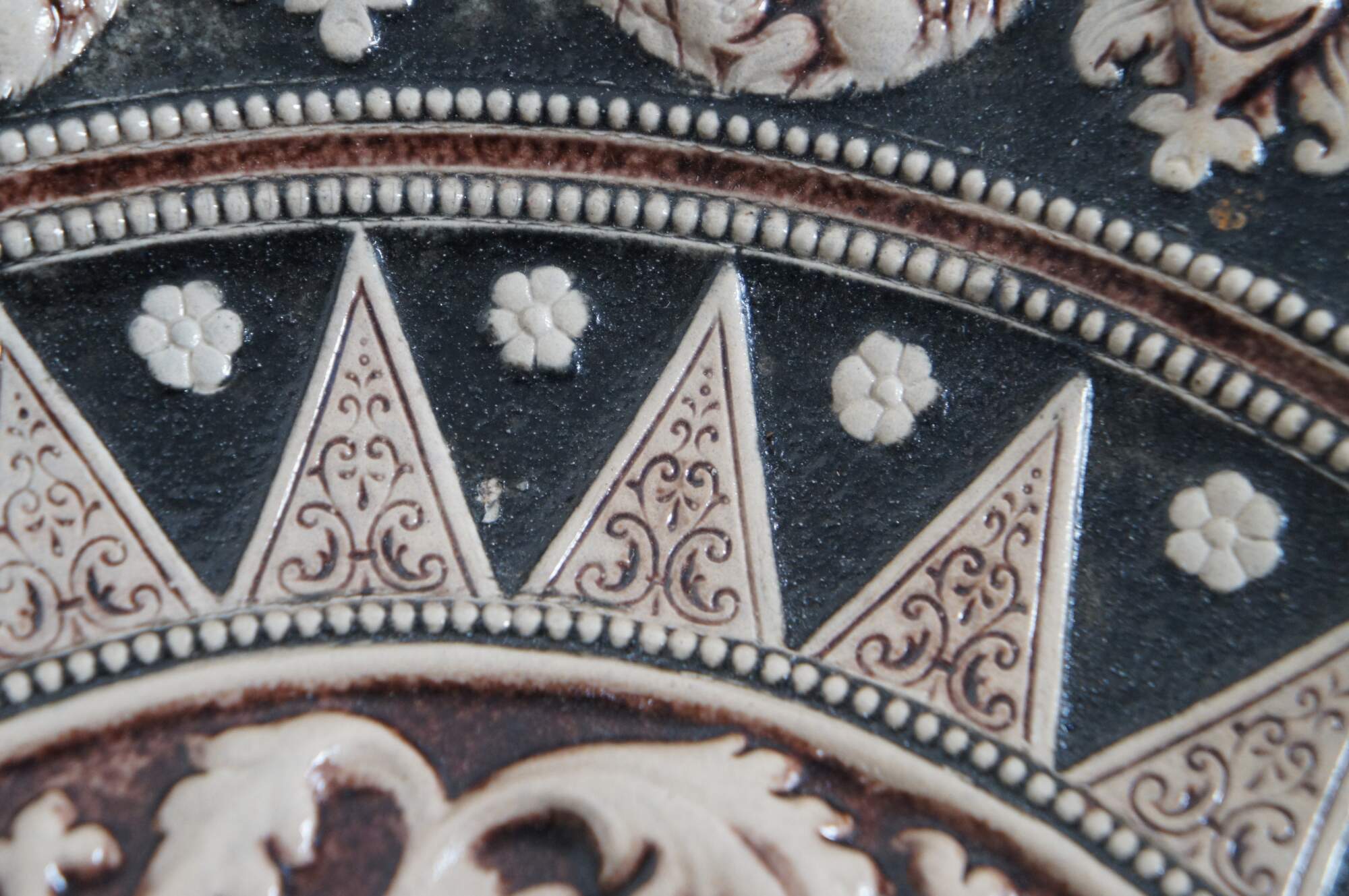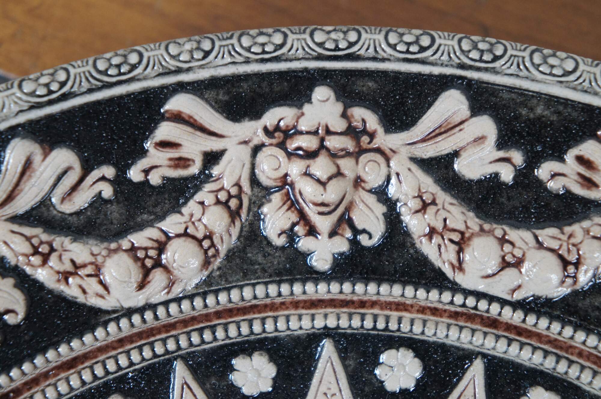 Mid to late 20th century German Westerwald salt glaze stoneware wall hanging plate / charger accented with deep charcoal and brown glaze, featuring a heraldic design in relief depicting an elaborate coat of arms festooned with plumed helmets, foliage, and the head of a jester flanked by the date 1588. Around this central motif is a decorative sunburst, patterned bands, and a garland of fruited swag and forest spirt / Green Man type faces. No maker's marks.