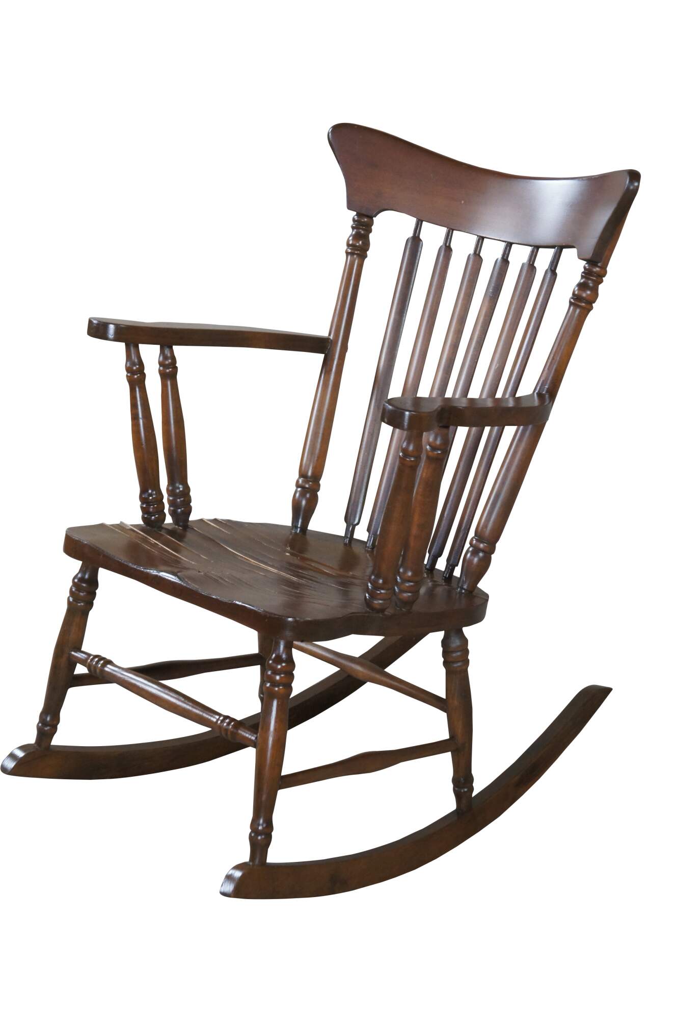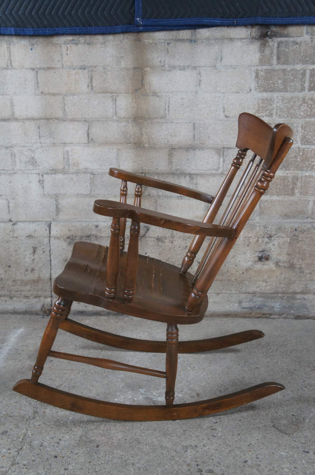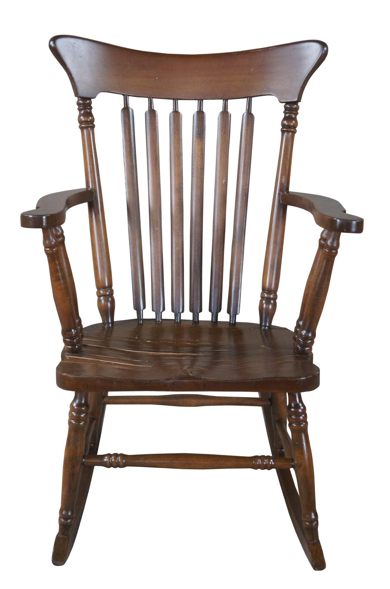A lovely rocking chair from the first half of the 20th century. Made from maple with a combination of Windsor and farmhouse styling. Features a contoured crest rail, slat back and saddle seat. Features turned arm supports and stretchers. Includes Cushion