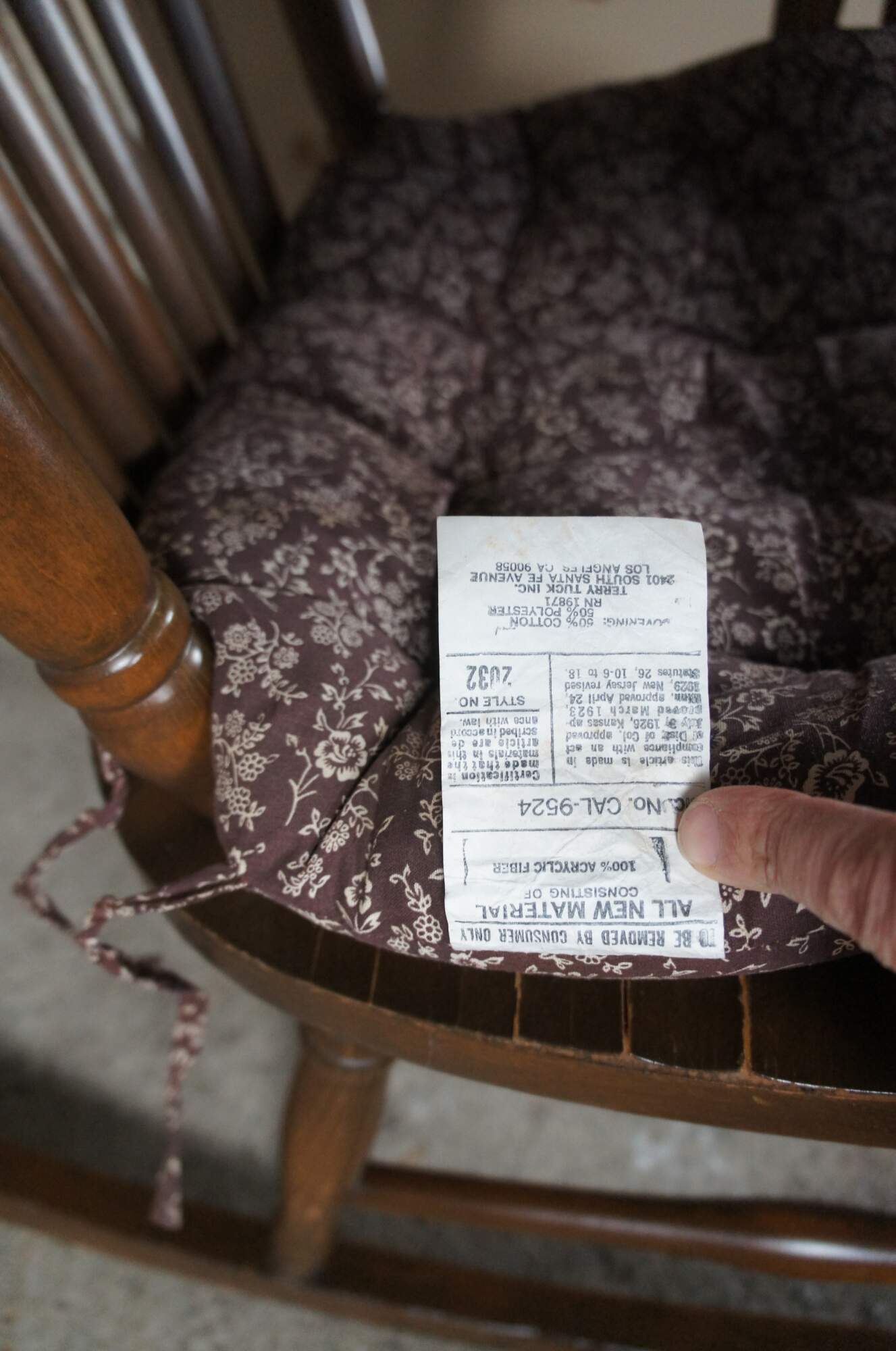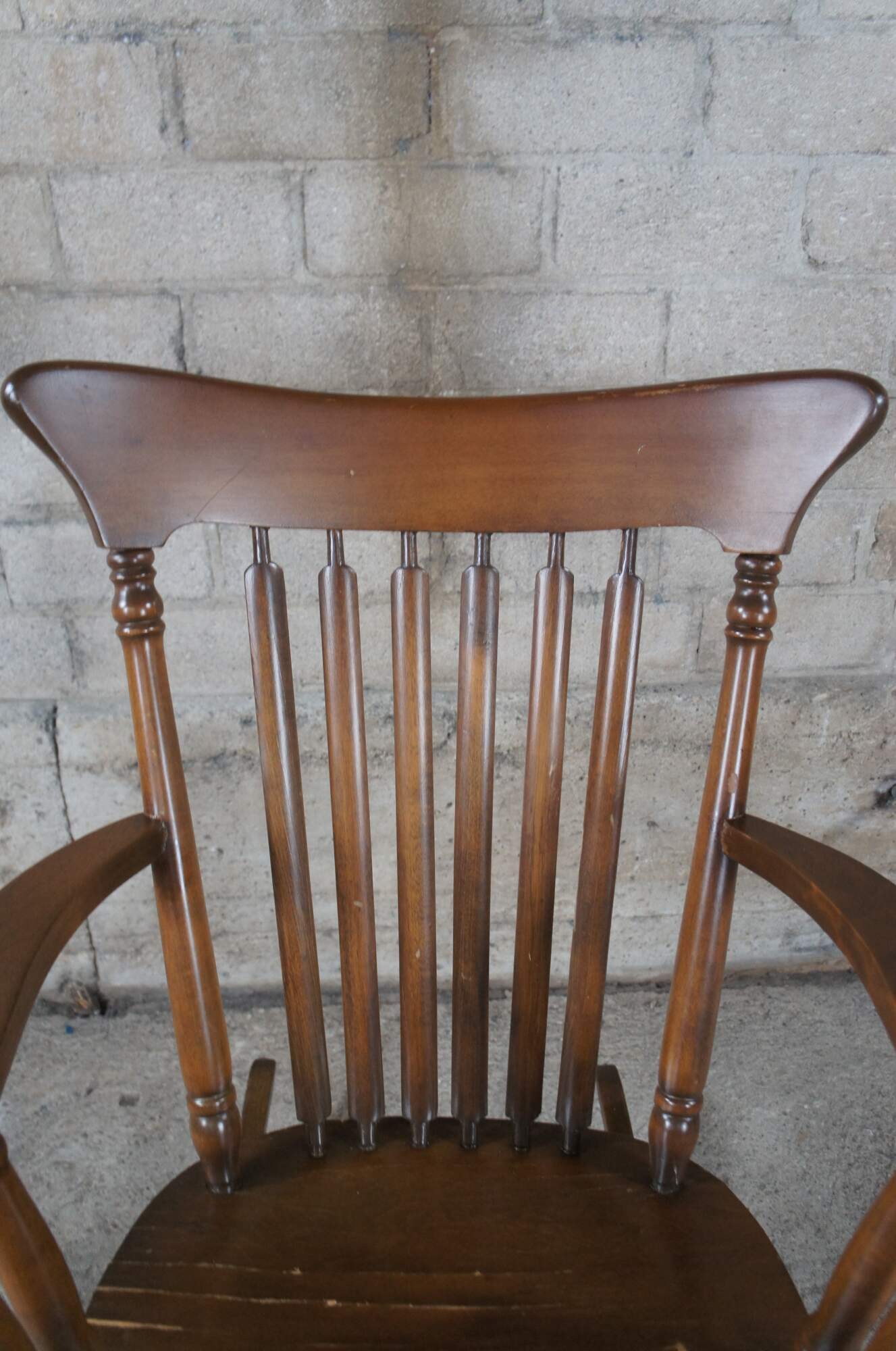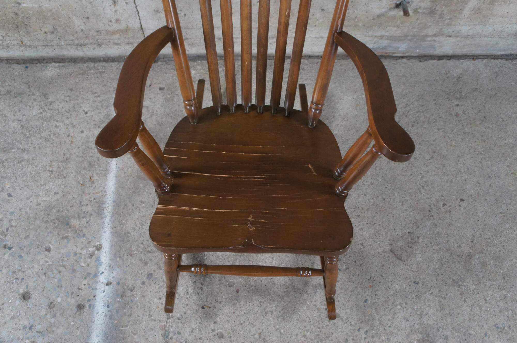 A lovely rocking chair from the first half of the 20th century. Made from maple with a combination of Windsor and farmhouse styling. Features a contoured crest rail, slat back and saddle seat. Features turned arm supports and stretchers. Includes Cushion