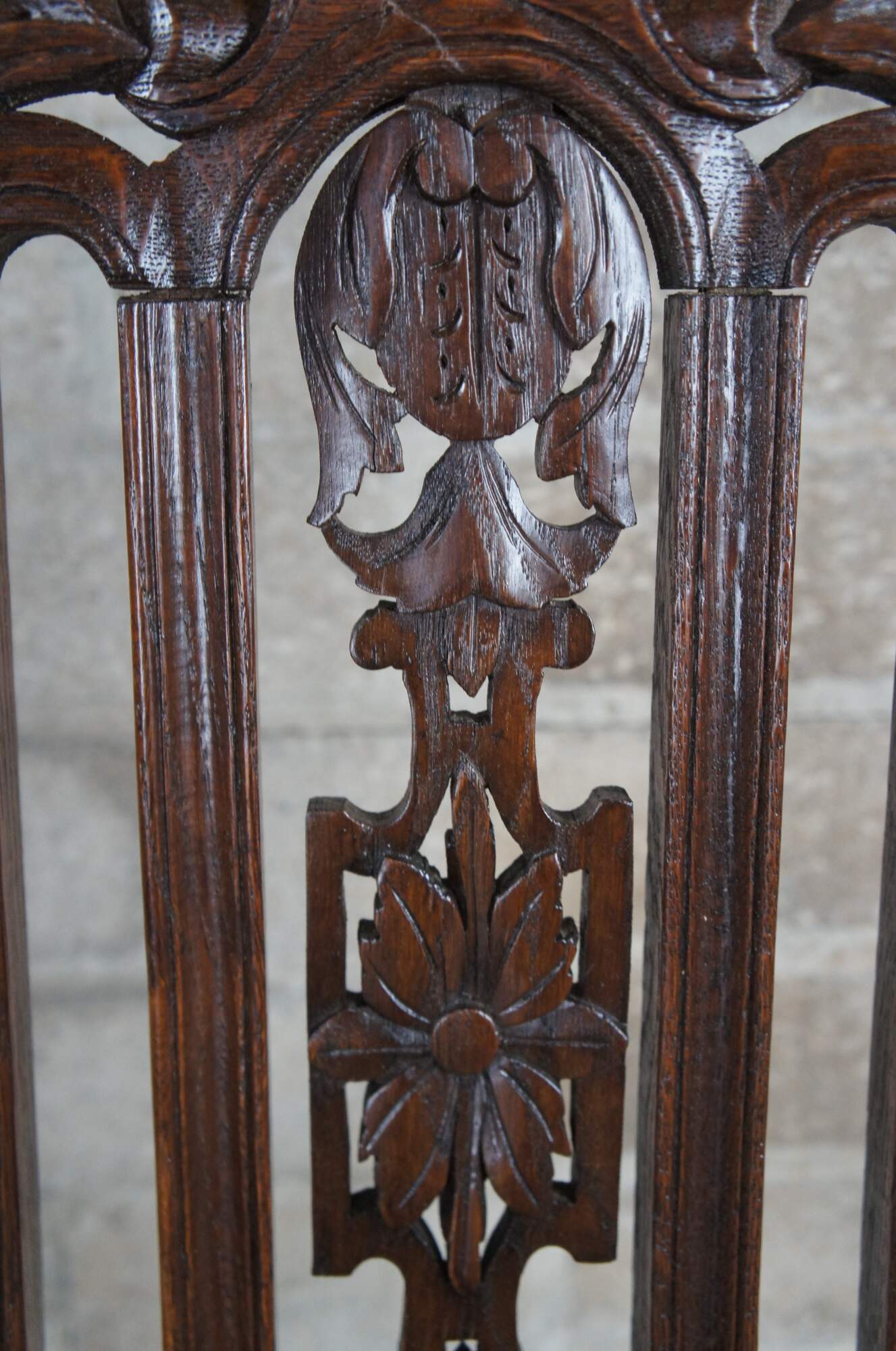 Set of 3 Antique French Renaissance dining chairs. Beautifully crafted with oak frames carved in a Baroque manner with pierced backs and barley twist supports. Features woven cane seats neatly framed by a beveled and carved wooden seat frame. Each chair is supported by turnip feet.