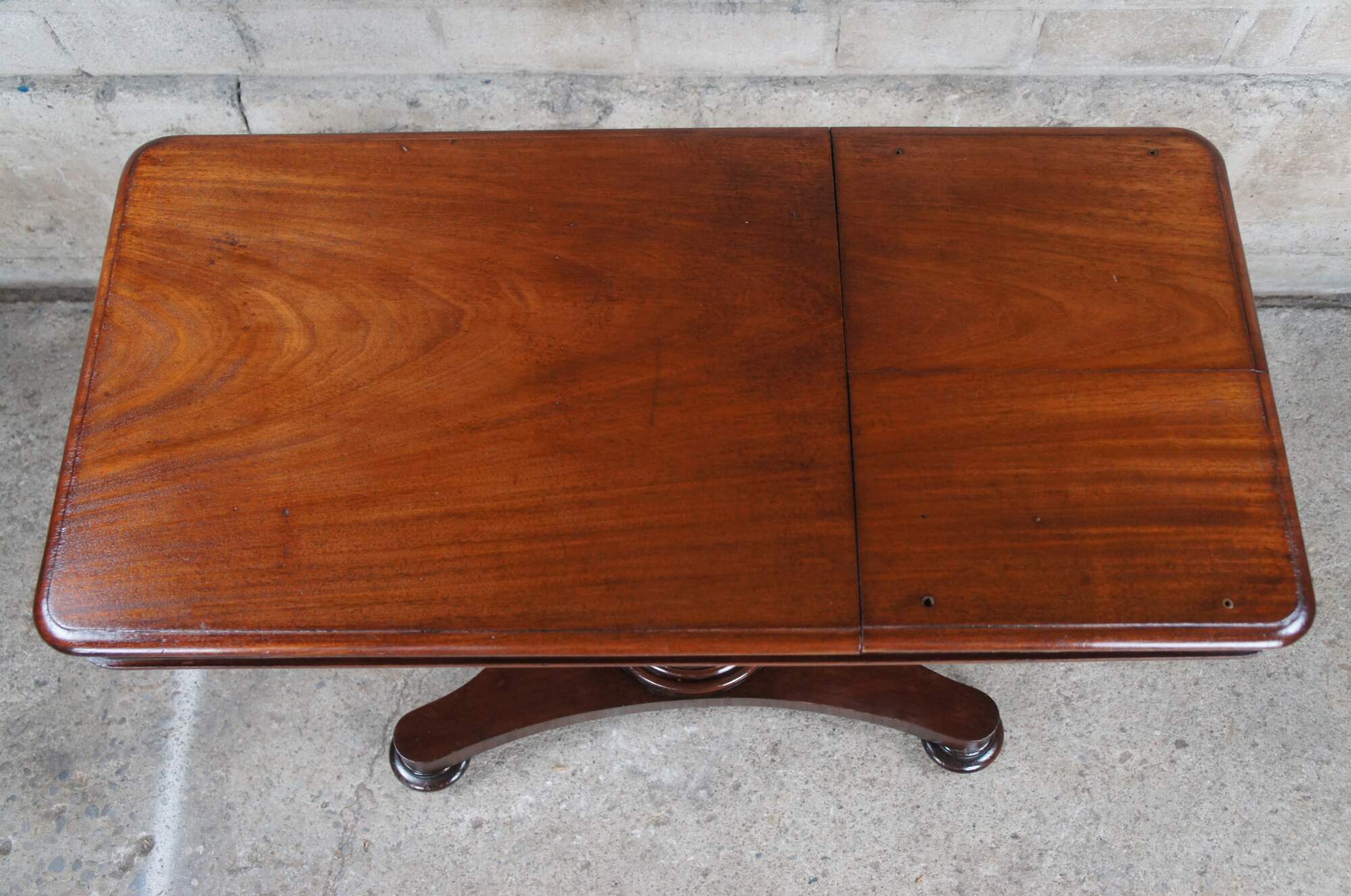 An impressive William IV era mahogany Invalids table. Features a rectangular sliding top with a pair of ratcheted reading slopes to one side, over an adjustable octagonal stem above a shaped quadripartite base over flared bun feet with metal casters. Each slope has a small hole with brass insert towards the base for tray / reading shelf attachments. The tables versatile size allows for use as a console, lectern or duet music stand.