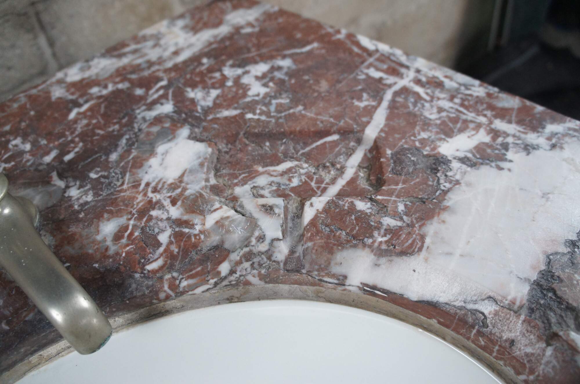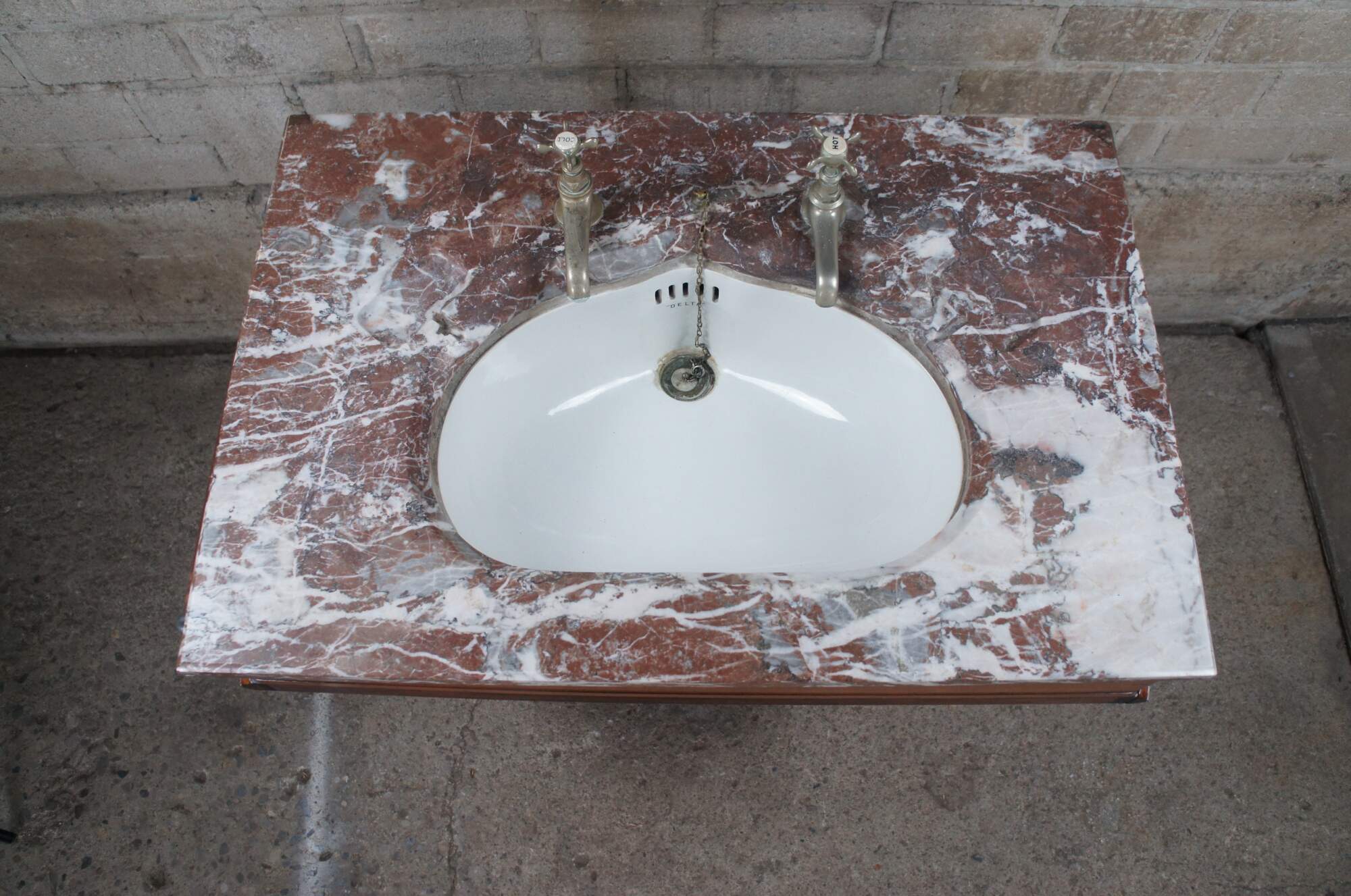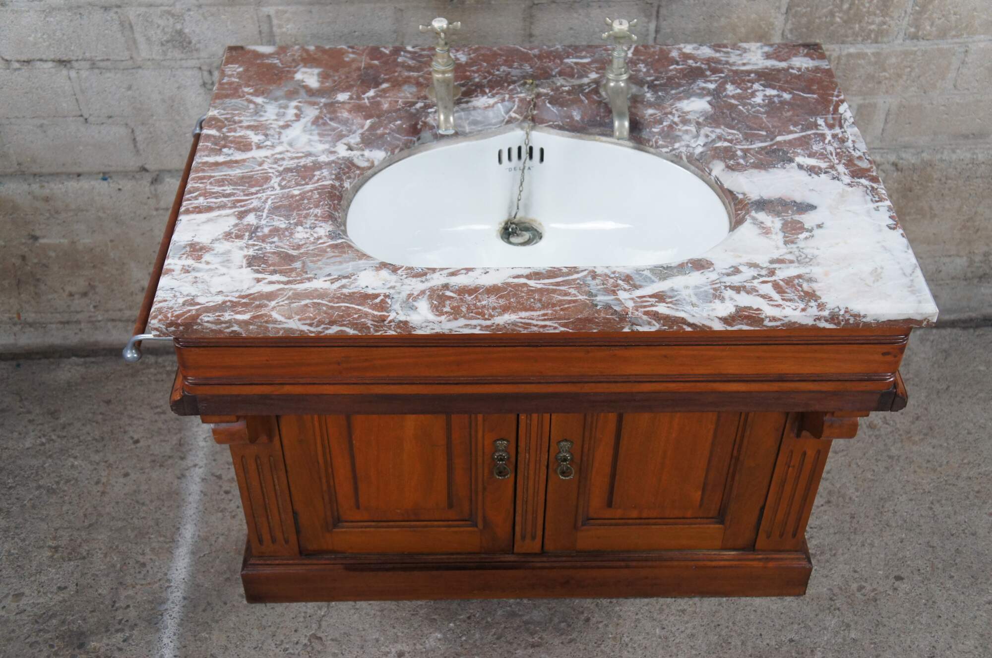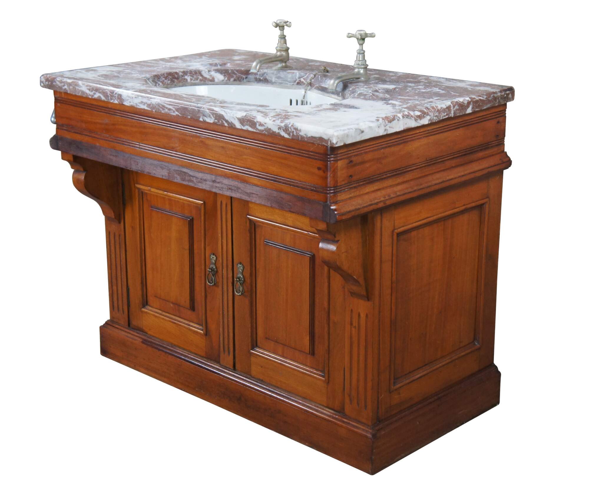 An exceptional Victorian Era bathroom vanity. Made from walnut with red and white vein marble top. Features a porcelain delta sink with hot and cold spigot. The cabinet has a traditional form with spandrels leading to fluting along the stiles and paneled doors that open via brass hardware with rear catch. Includes towel bar off the left side