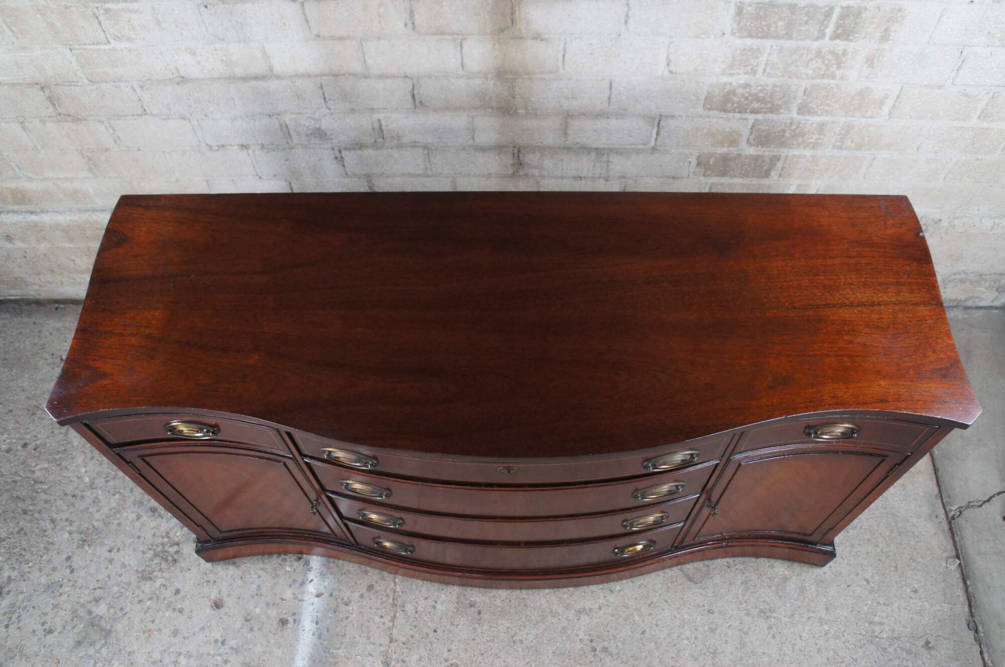 Vintage Bassett Furniture Industries Duncan Phyfe Style bowfront server, circa 1950s. Made of genuine mahogany featuring six dovetailed drawers flanked by outer cupboard storage. Outer drawer drawers include dividers for silveware storage.