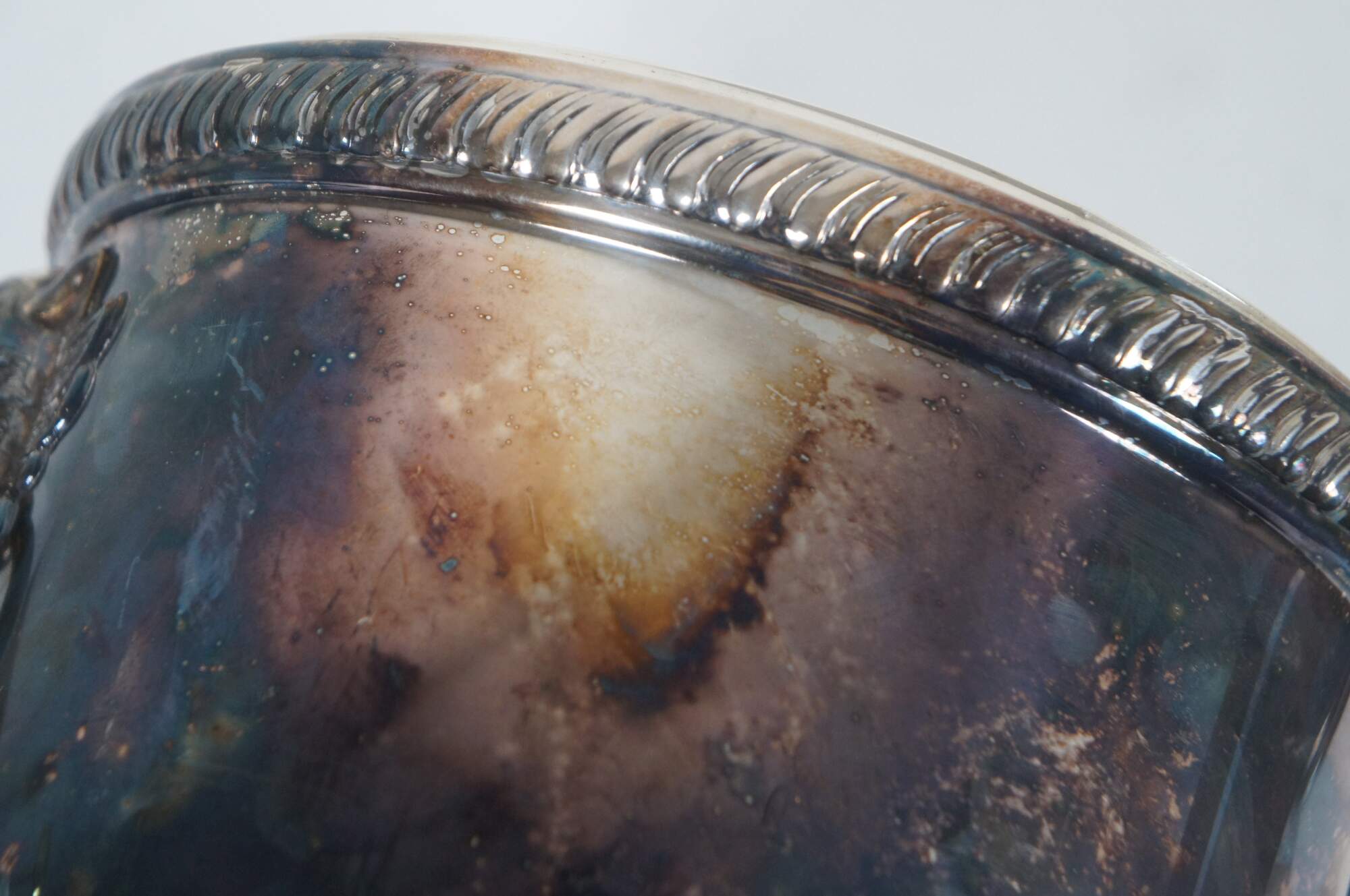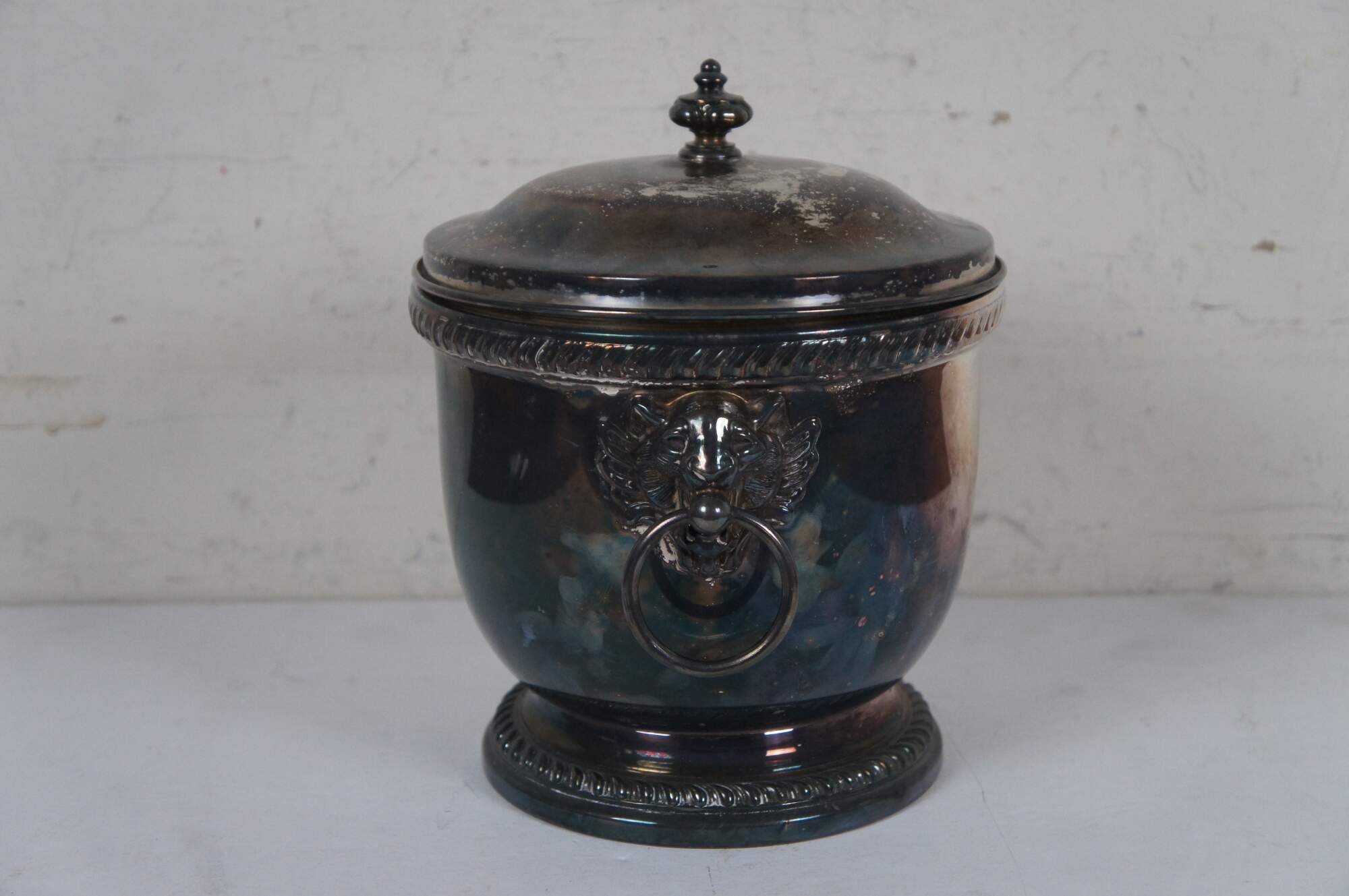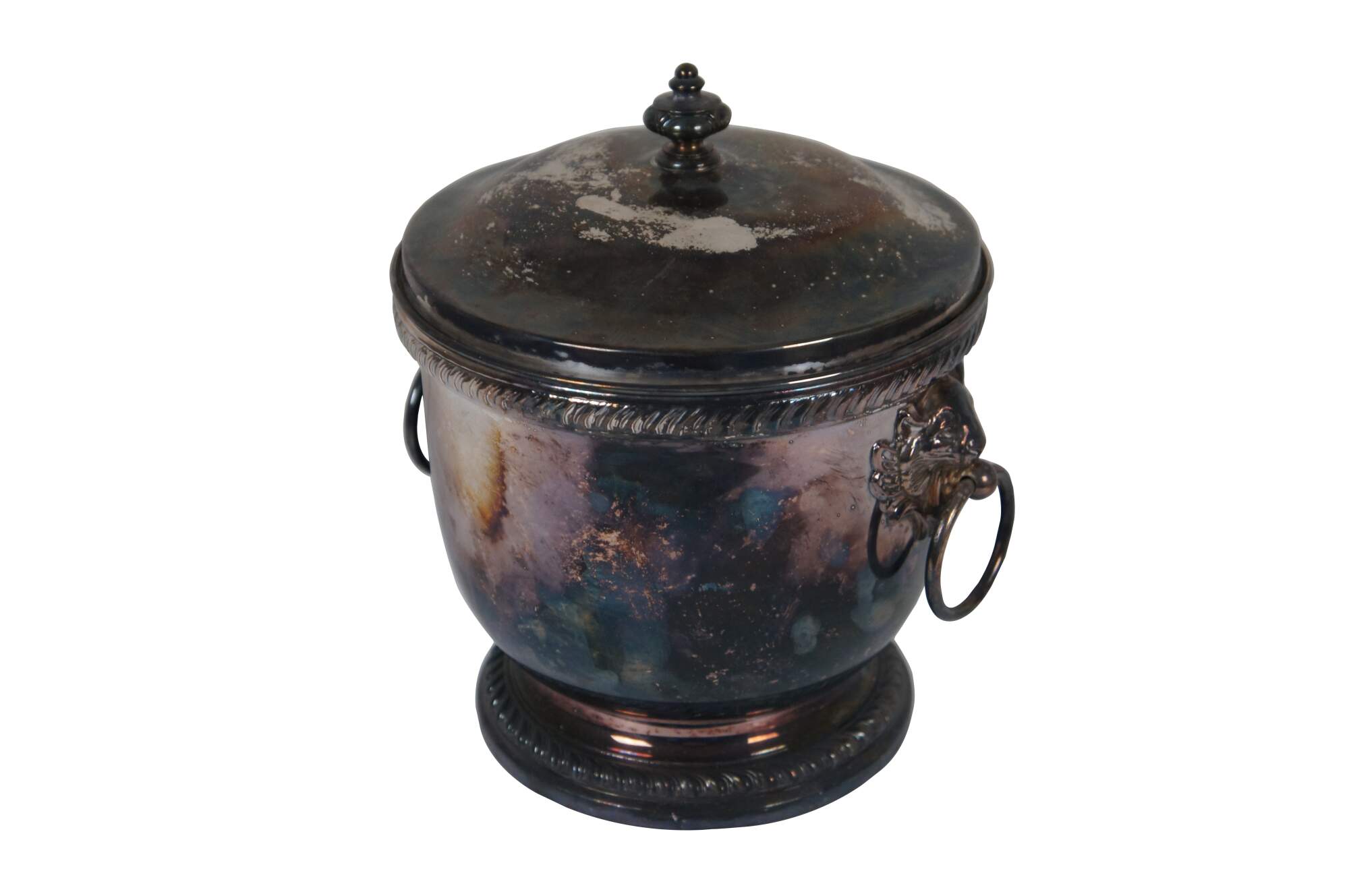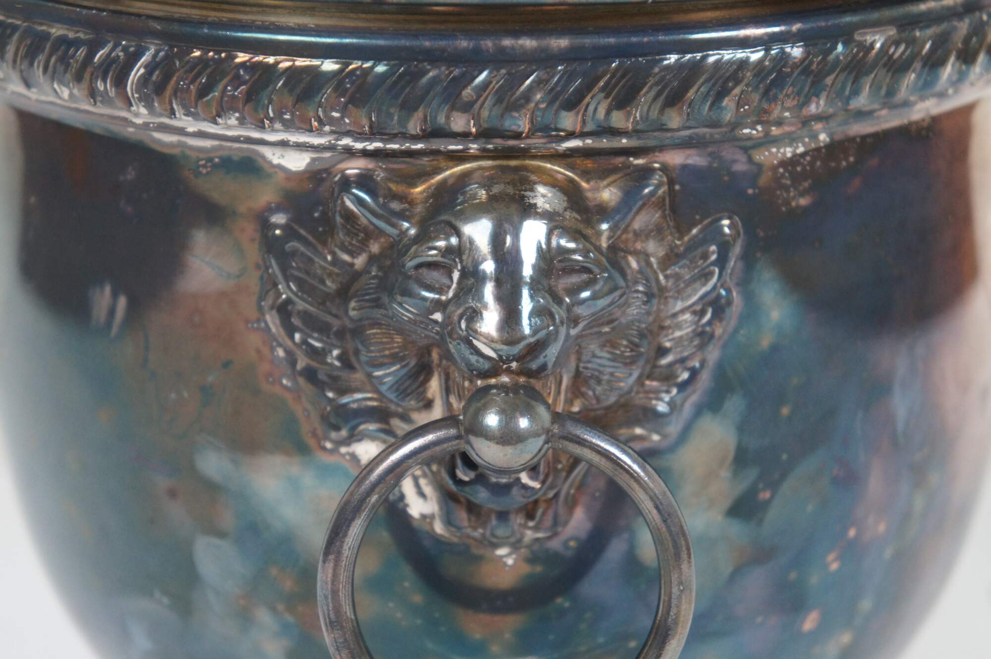 Vintage Silver Plated Copper ice bucket with white plastic insert by Poole silver Company, numer 3700. Features winged lion's heads holding ring handles, rope twist details, and vase shaped finial.