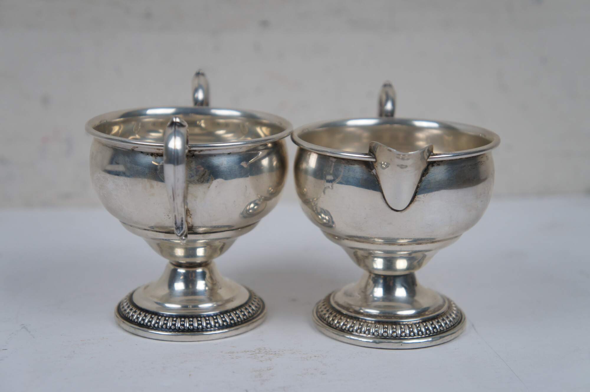 Vintage weighted reinforced sterling silver cream and sugar bowl set by Wm Rogers Mfg Co, item number 14A. Trophy style with beaded bands around base.