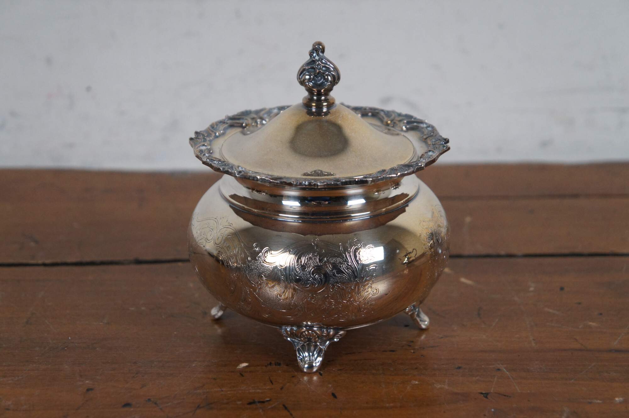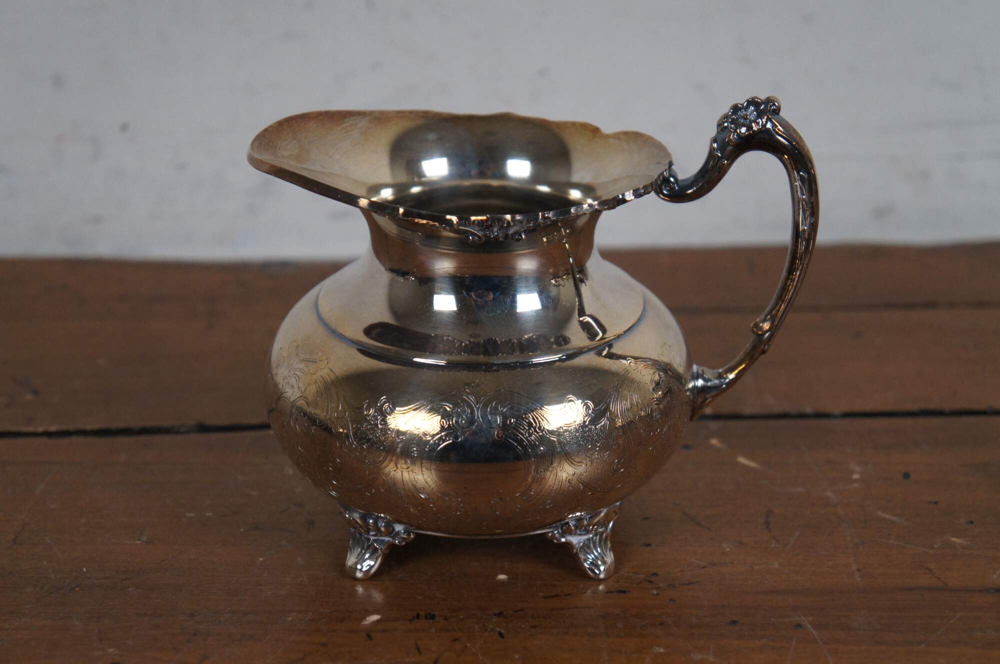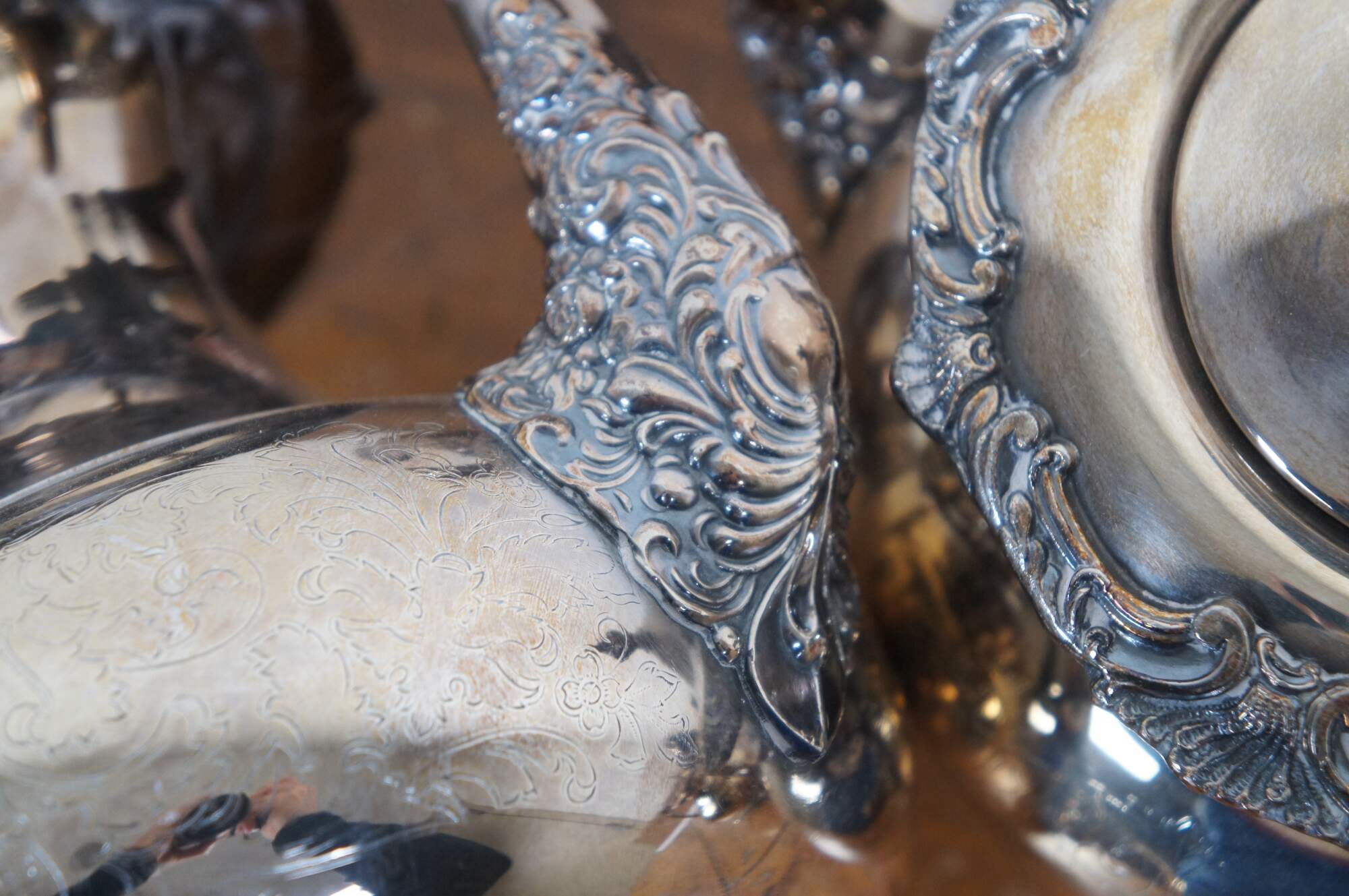 Mid century 6 piece Sheffield Design Reproduction by Community silver plate tea set, including a large handled / footed tray, tea pot and coffee pot with hinged lids, cream pitcher, waste pot, and lidded sugar bowl. Decorated with molded and etched scallops / florals.