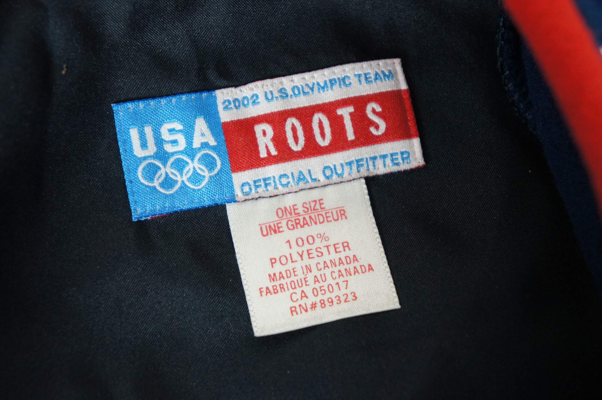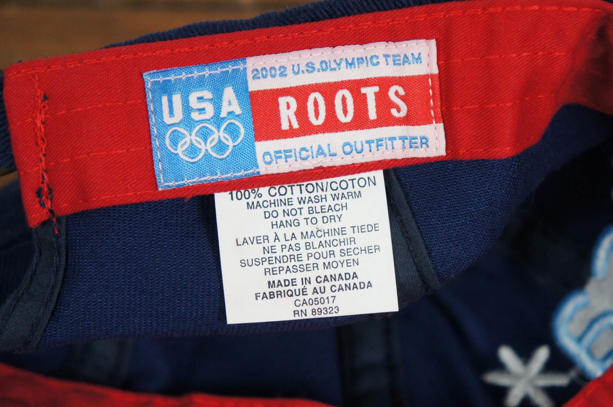 Pair of Team USA hats from the 2002 Winter Olympics in Salt Lake City. One fleece beret and one ball cap. Produced by Roots - Official Outfitter of the 2002 Olympics.
