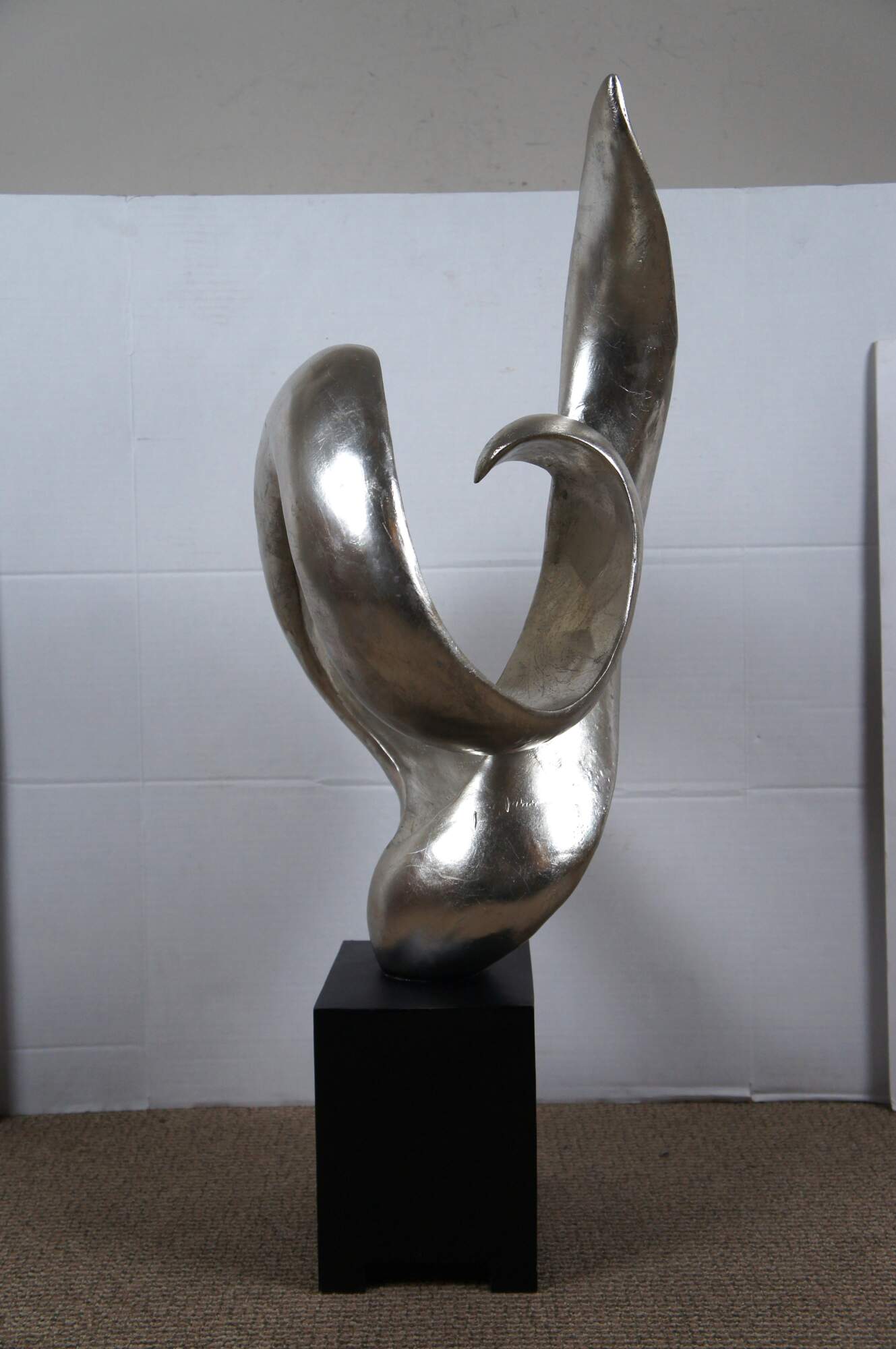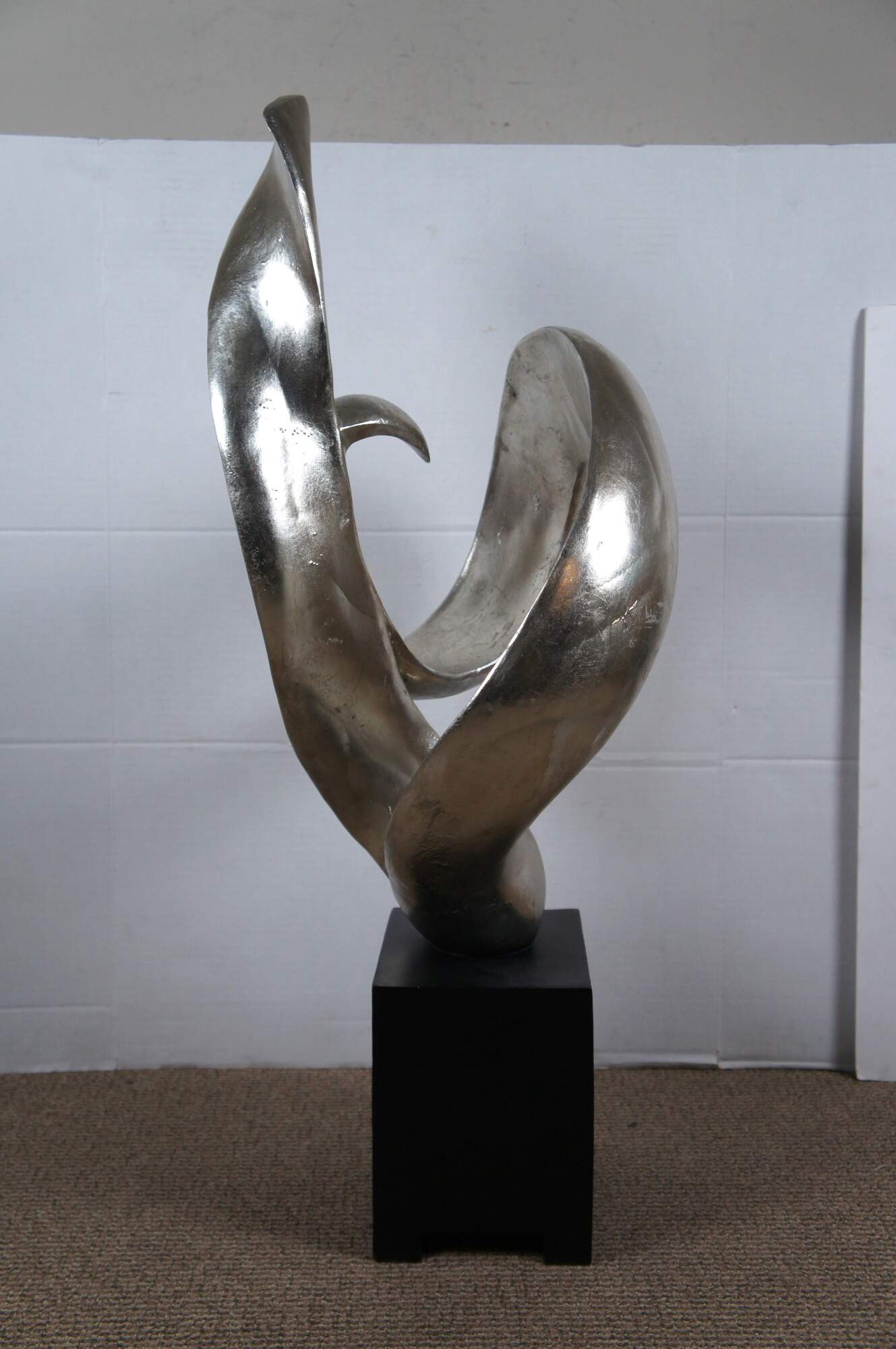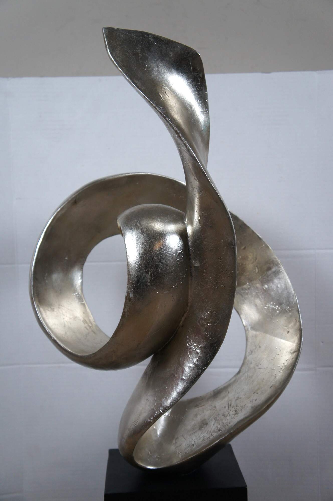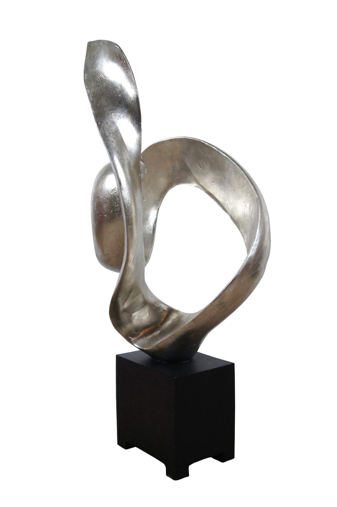Late 20th century composite sculpture by Austin Productions featuring a rectangular black base supporting a silver gilt swirling abstract shape.