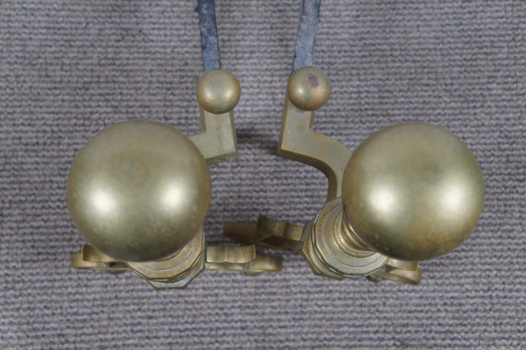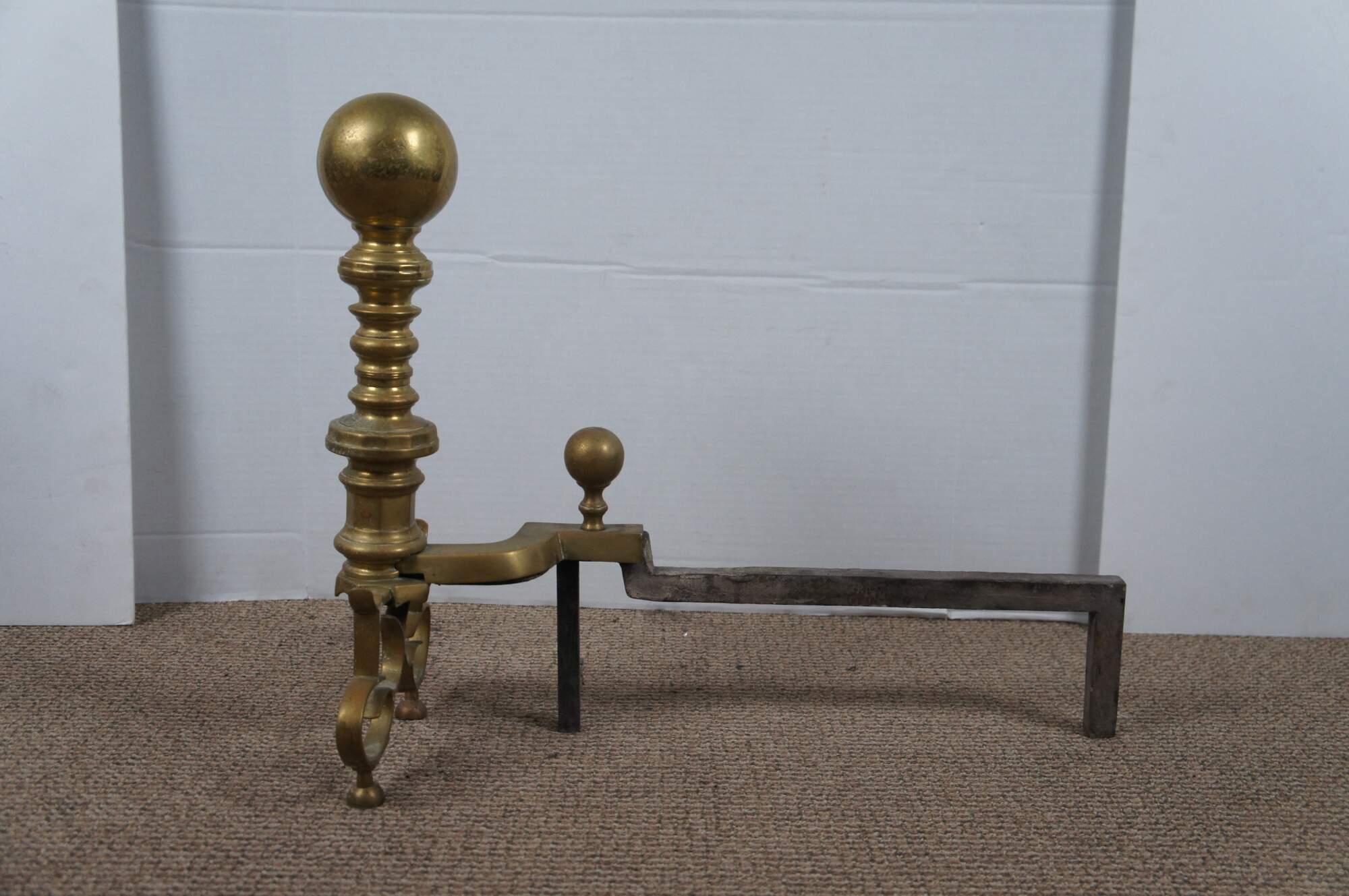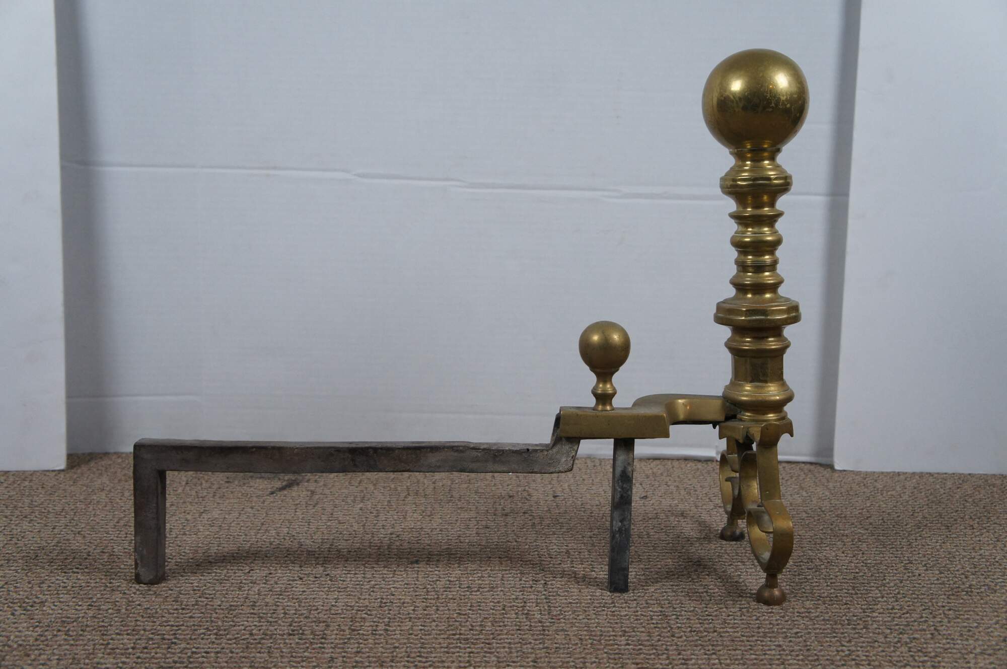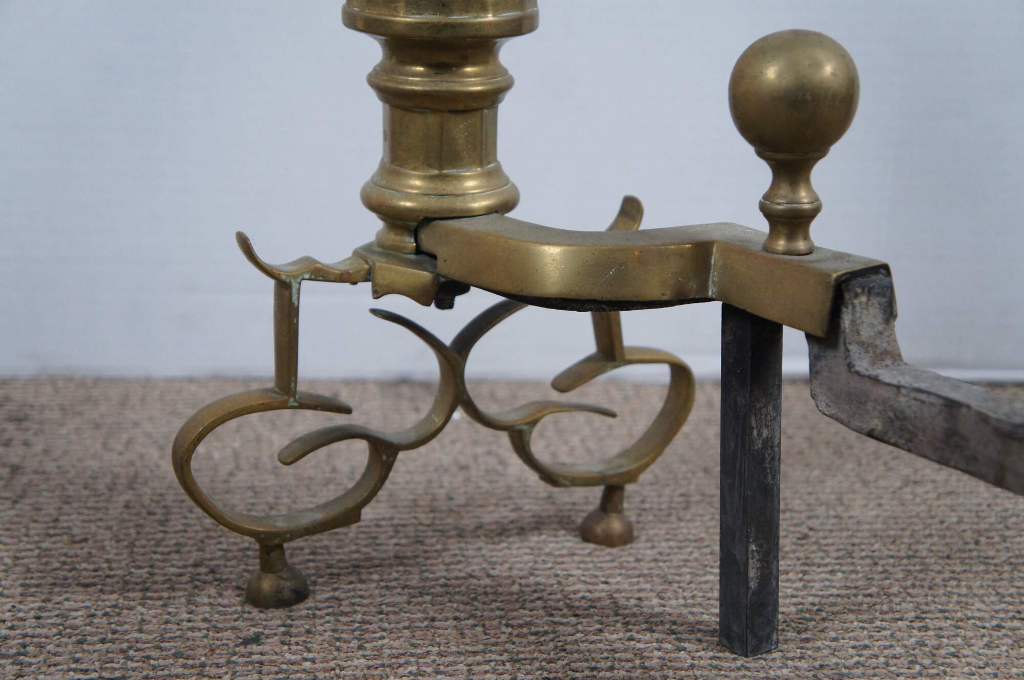 Pair of antique Georgian brass and iron andirons / fire dogs featuring cannonball tops on turned baluster pillars with ornate delicate scrolled feet.