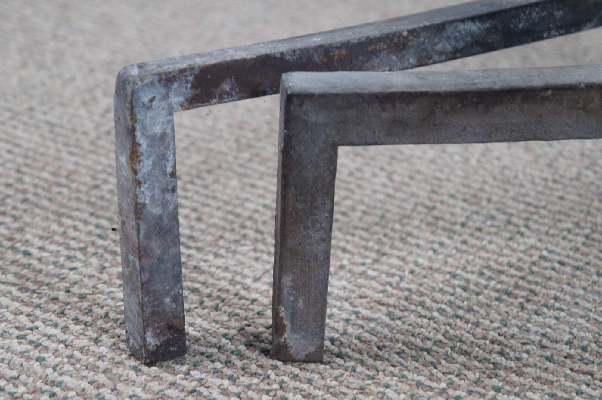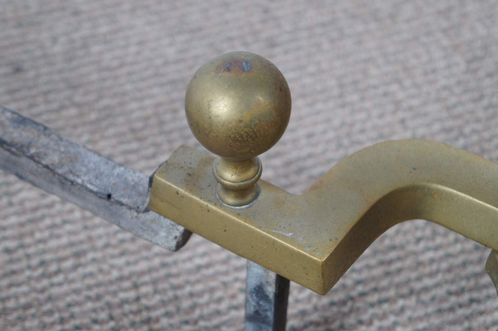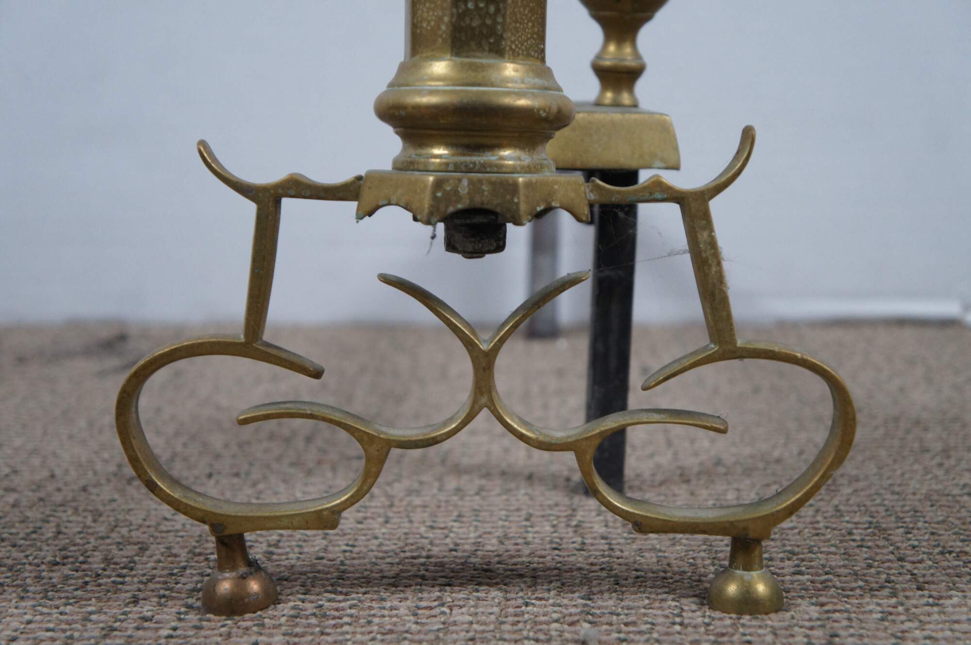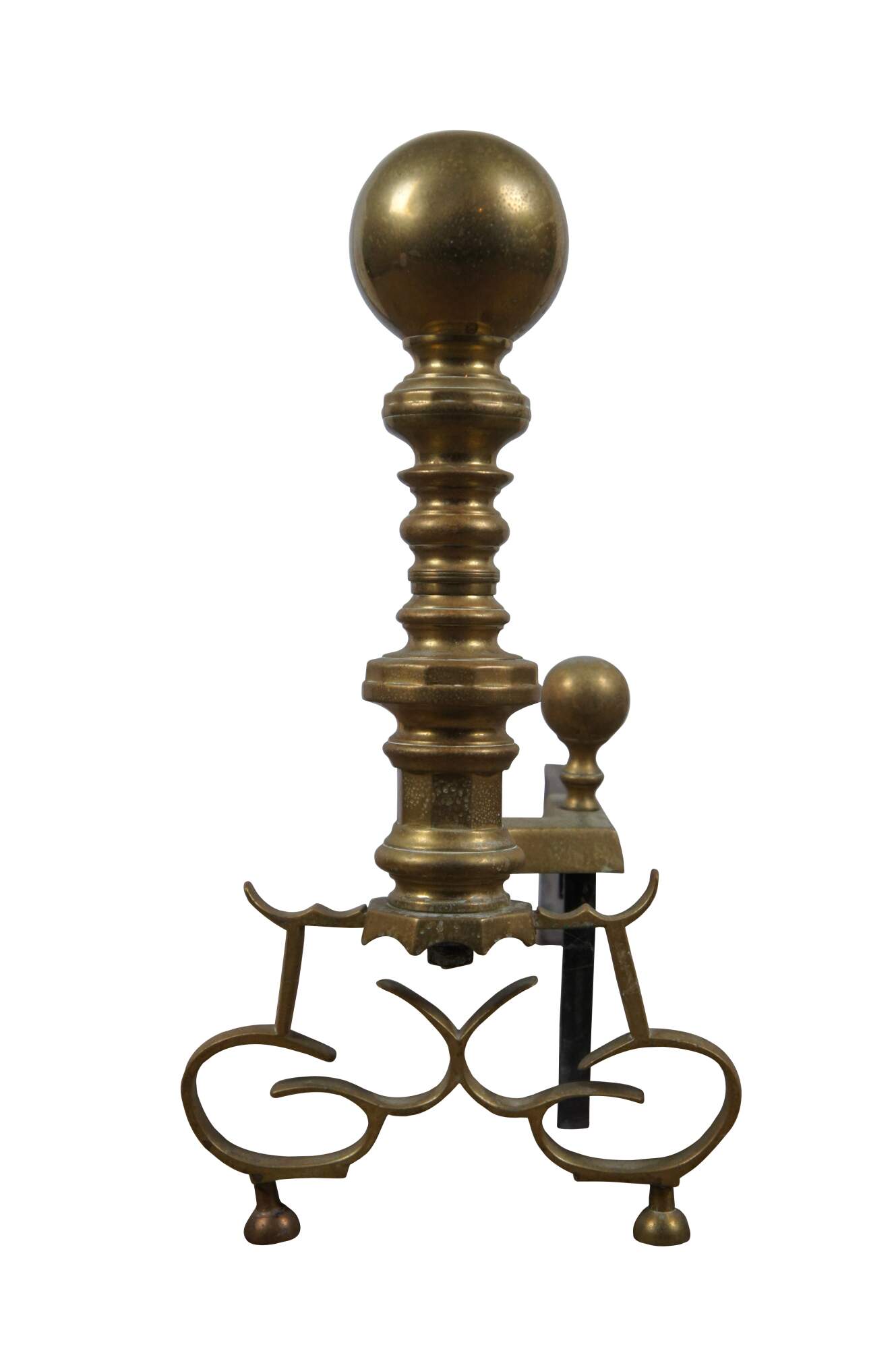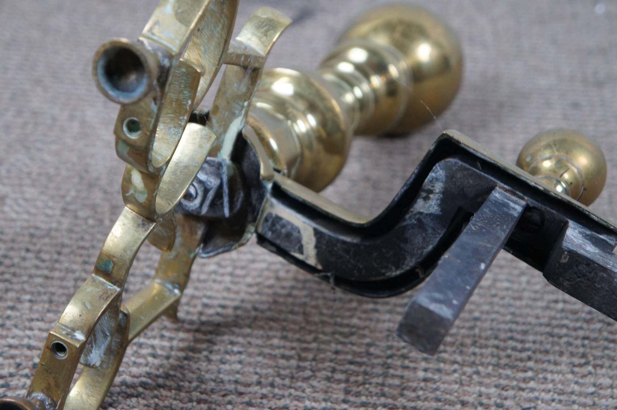 Pair of antique Georgian brass and iron andirons / fire dogs featuring cannonball tops on turned baluster pillars with ornate delicate scrolled feet.