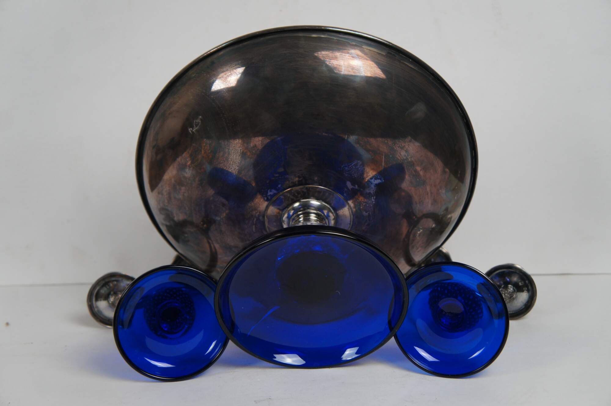 Vintage Pairpoint 3 piece console set including centerpiece / pedestal compote and two arm candlesticks, featuring cobalt blue bases with clear controlled bubble balls / orbs and silverplate tops - a combination not easily found online. Candlestick item number D6139. Compote item number D05518(3?).