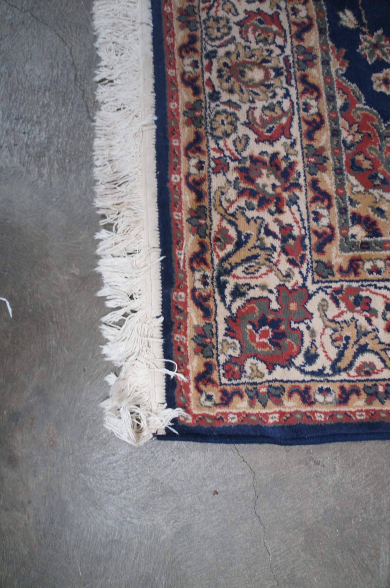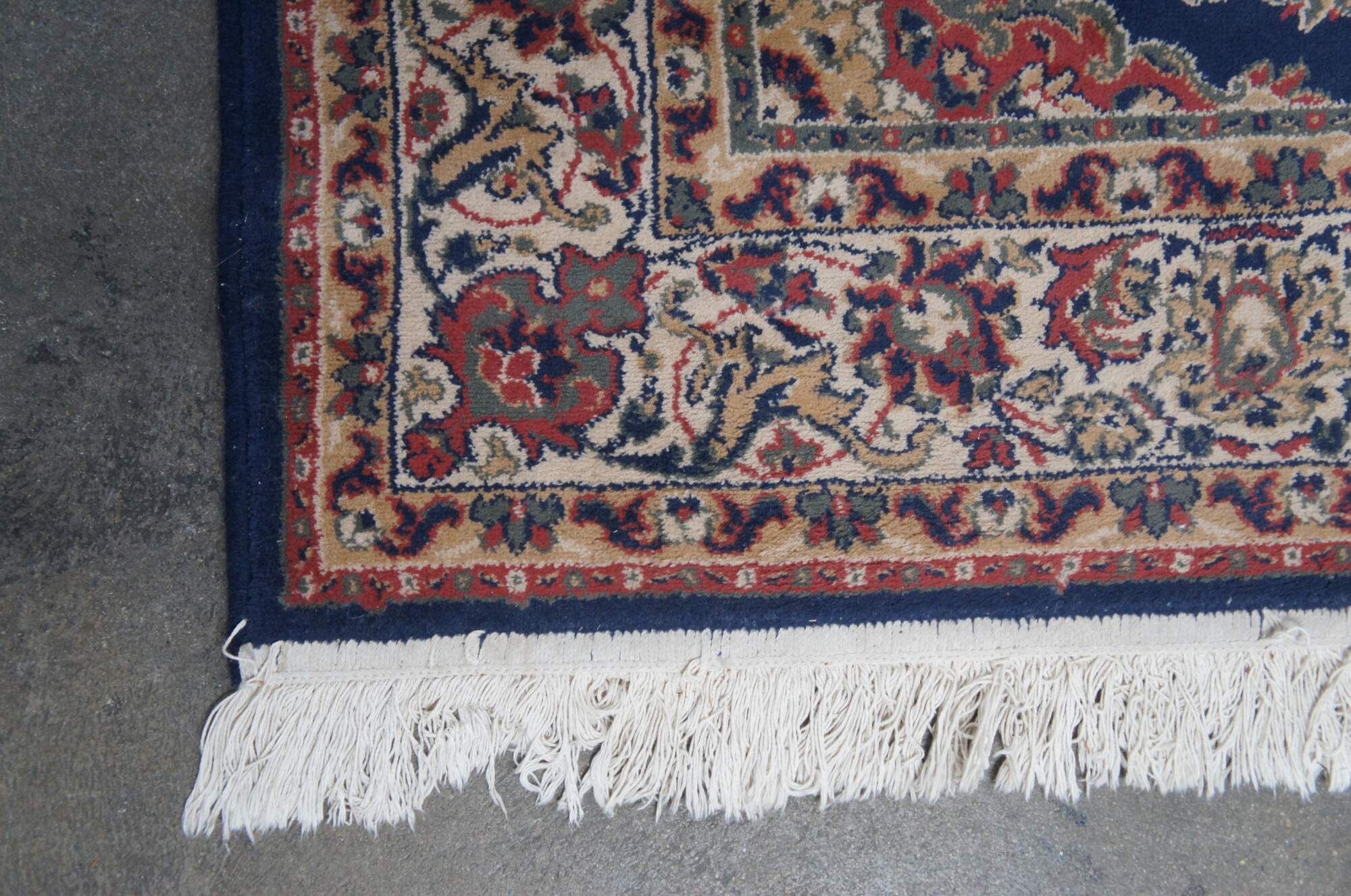 A beautiful blue floral all over area rug. Features an interlaced patter of creme, beige, reds and greens. Polypropylene BCF