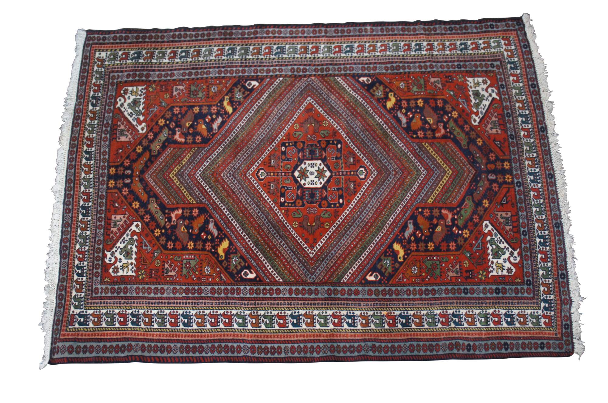 Originally, carpets from Abadeh had patterns of vases and rather insignificant colours. The carpet had some difficulties holding onto the market and the weavers searched for new patterns. They were inspired by the Ghashghai nomads who had their summer pastures in the area. The carpets usually have a large hexagon in the middle with a bow or a medallion and at the corners, a variant of the Heybatlou-pattern . The field is covered with small pictures of birds, four-legged animals together with trees and flowers. They are good utility carpets since they are very firm, hardy and durable.