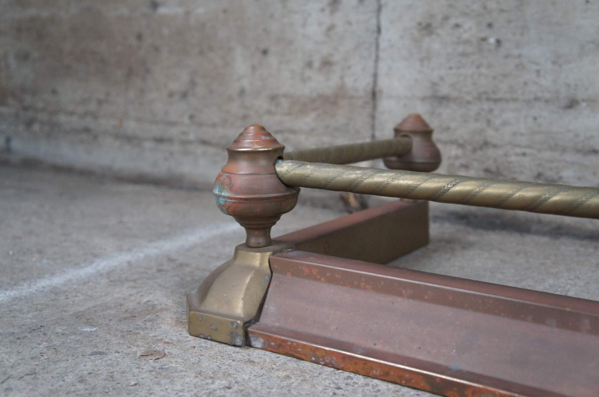 Vintage Decorative Crafts Inc brass fireplace fender. Styled in Victorian manner with ball and stick styling, a rope twisted rod and copper patina.
