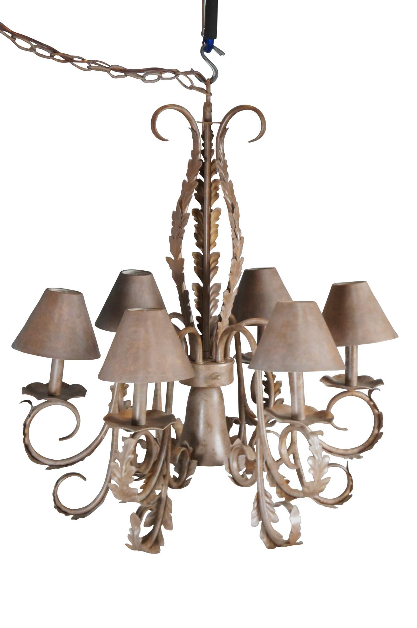 Vintage French Acanthus scrolled iron chandelier featuring 6 arm design with down light. The down light can be operated in conjunction with the other lights or by itself.