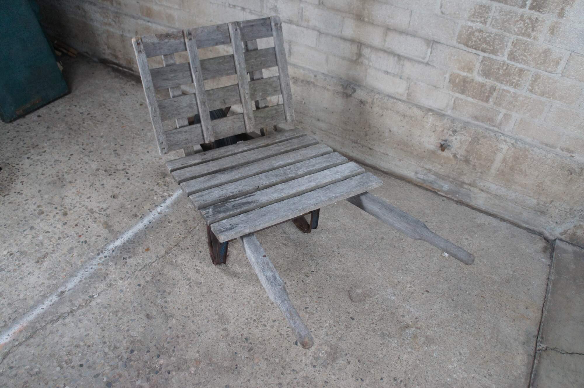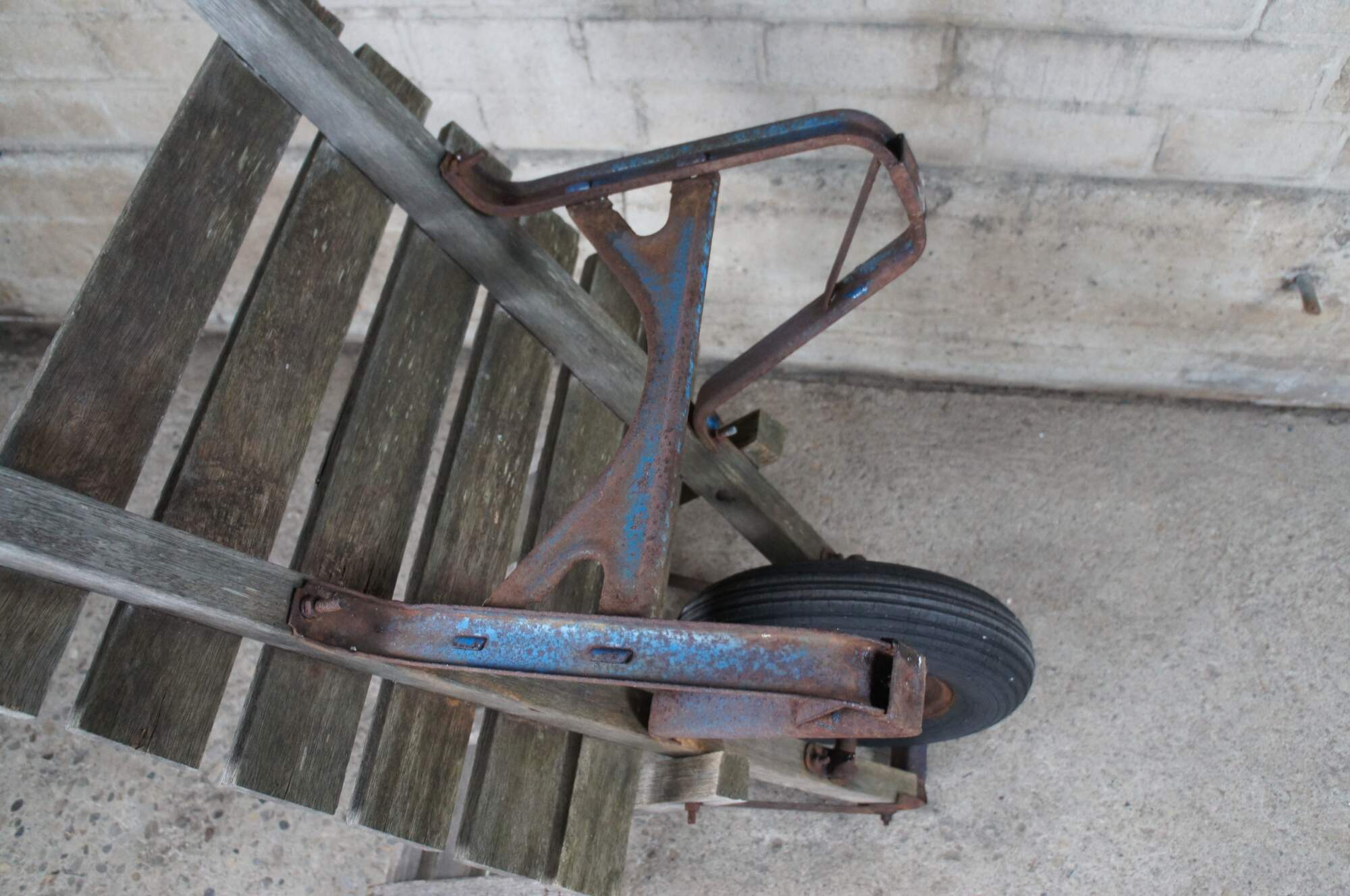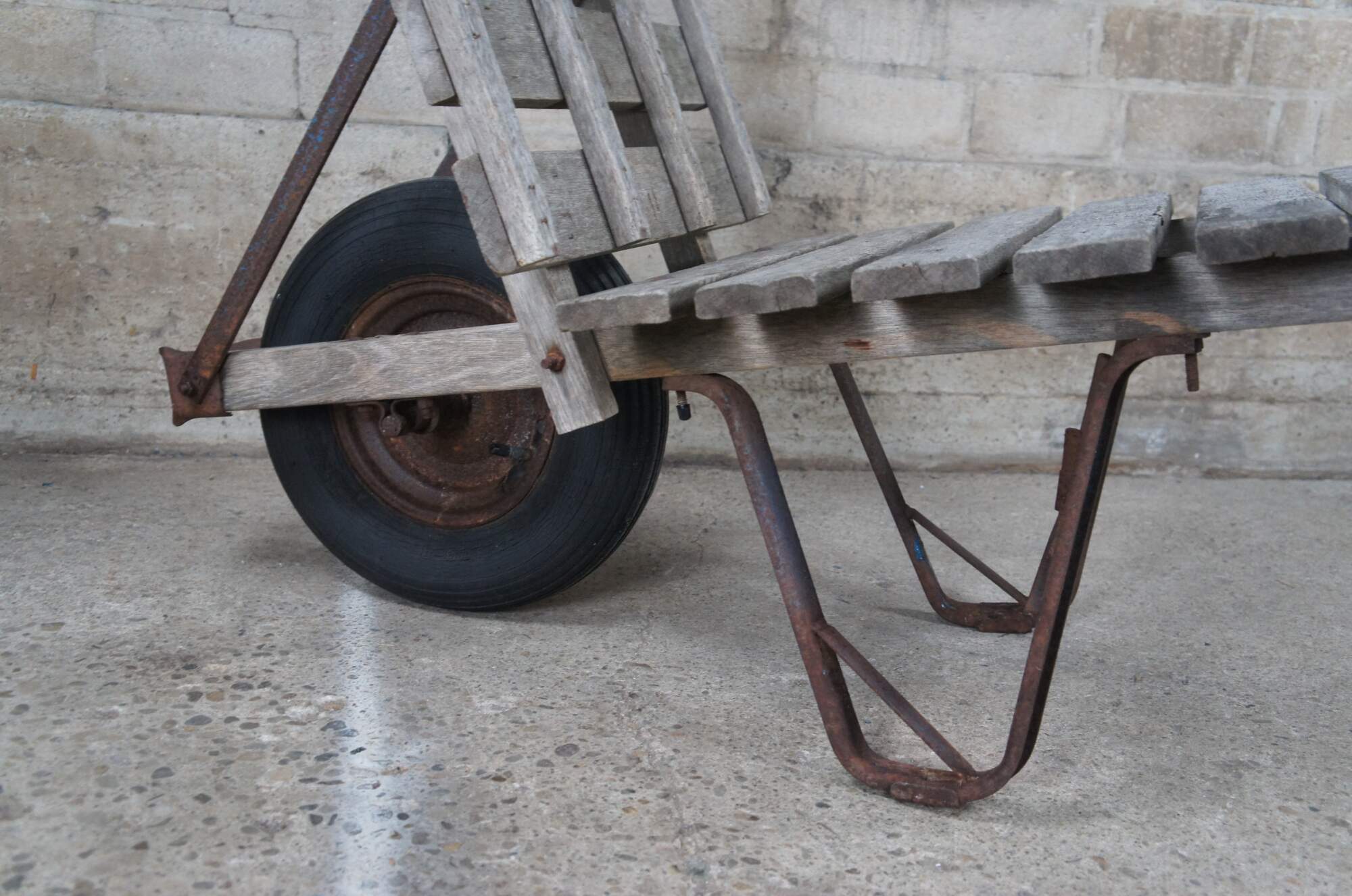 1940s Flat-bed wheel barrow. Intended for bricks or hay. Features a wooden frame on wheel with metal support.
