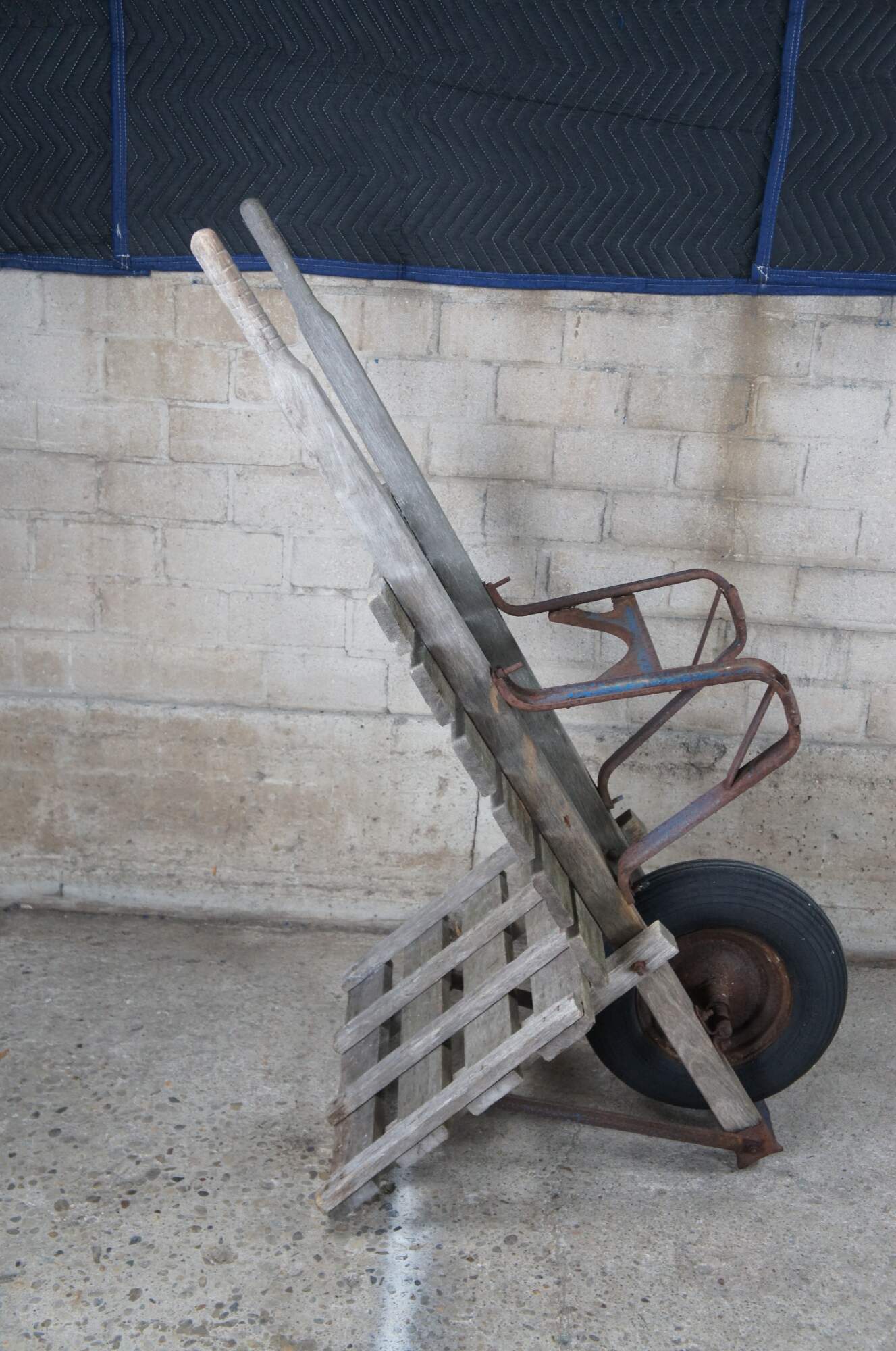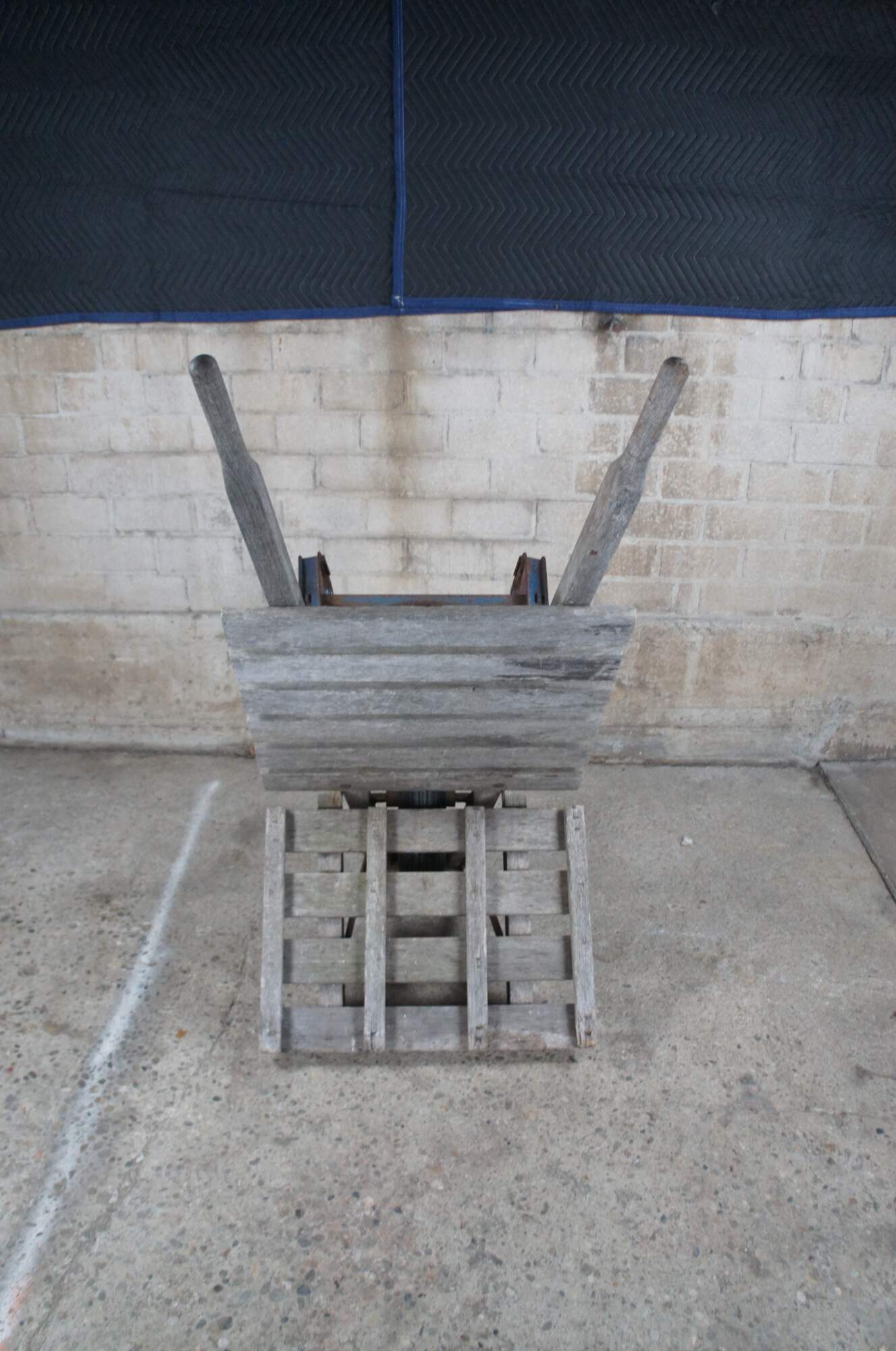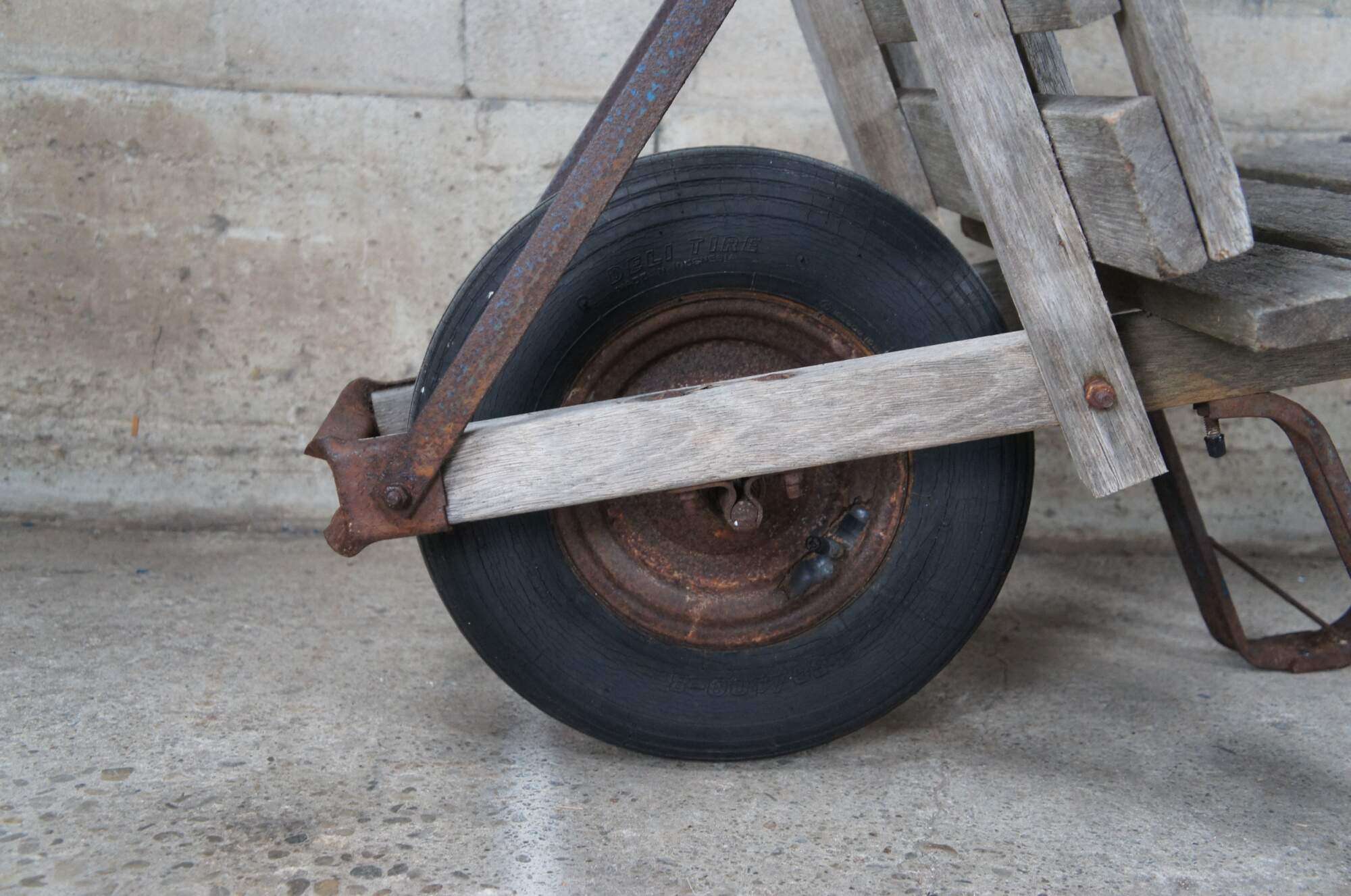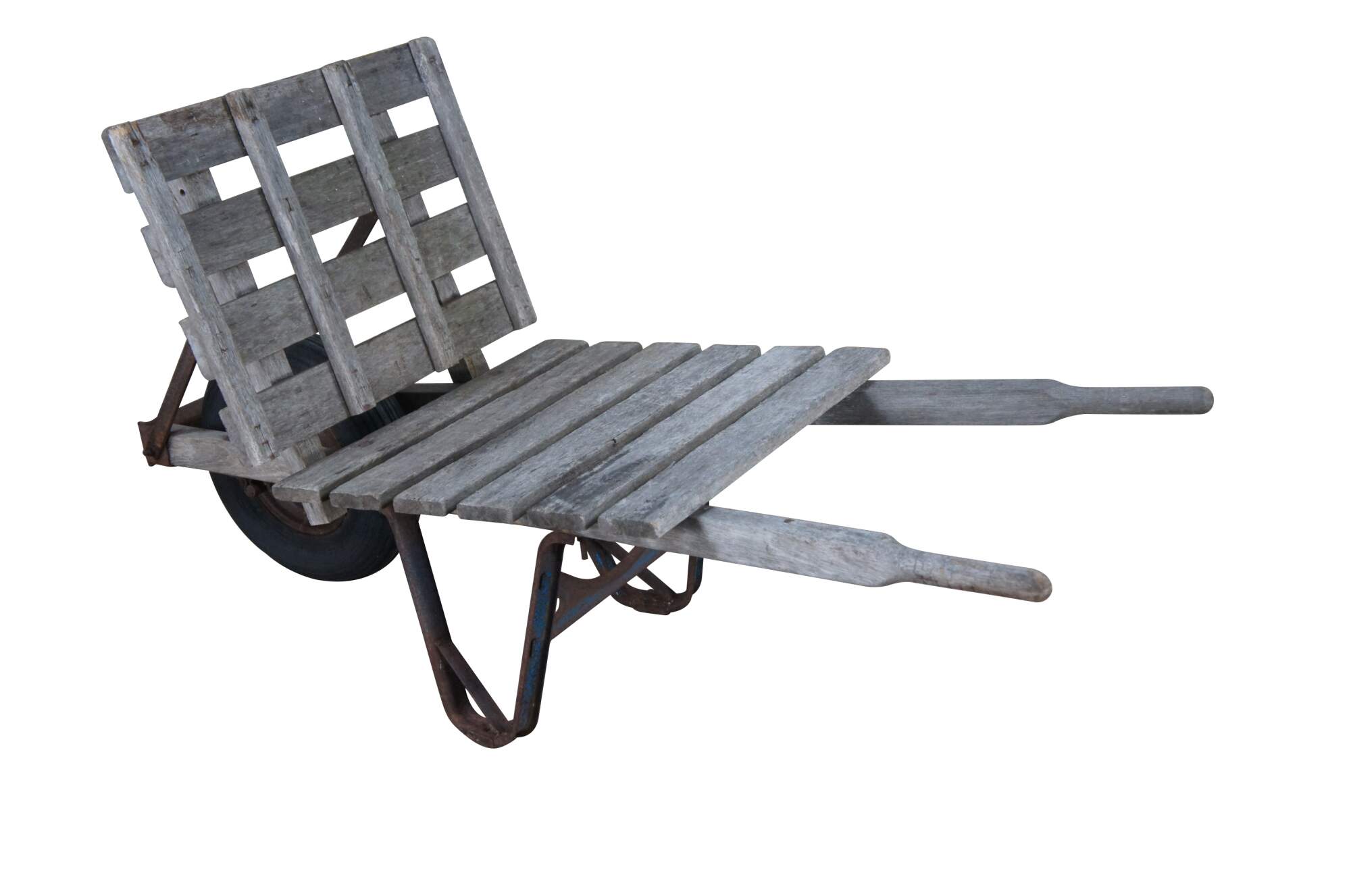 1940s Flat-bed wheel barrow. Intended for bricks or hay. Features a wooden frame on wheel with metal support.