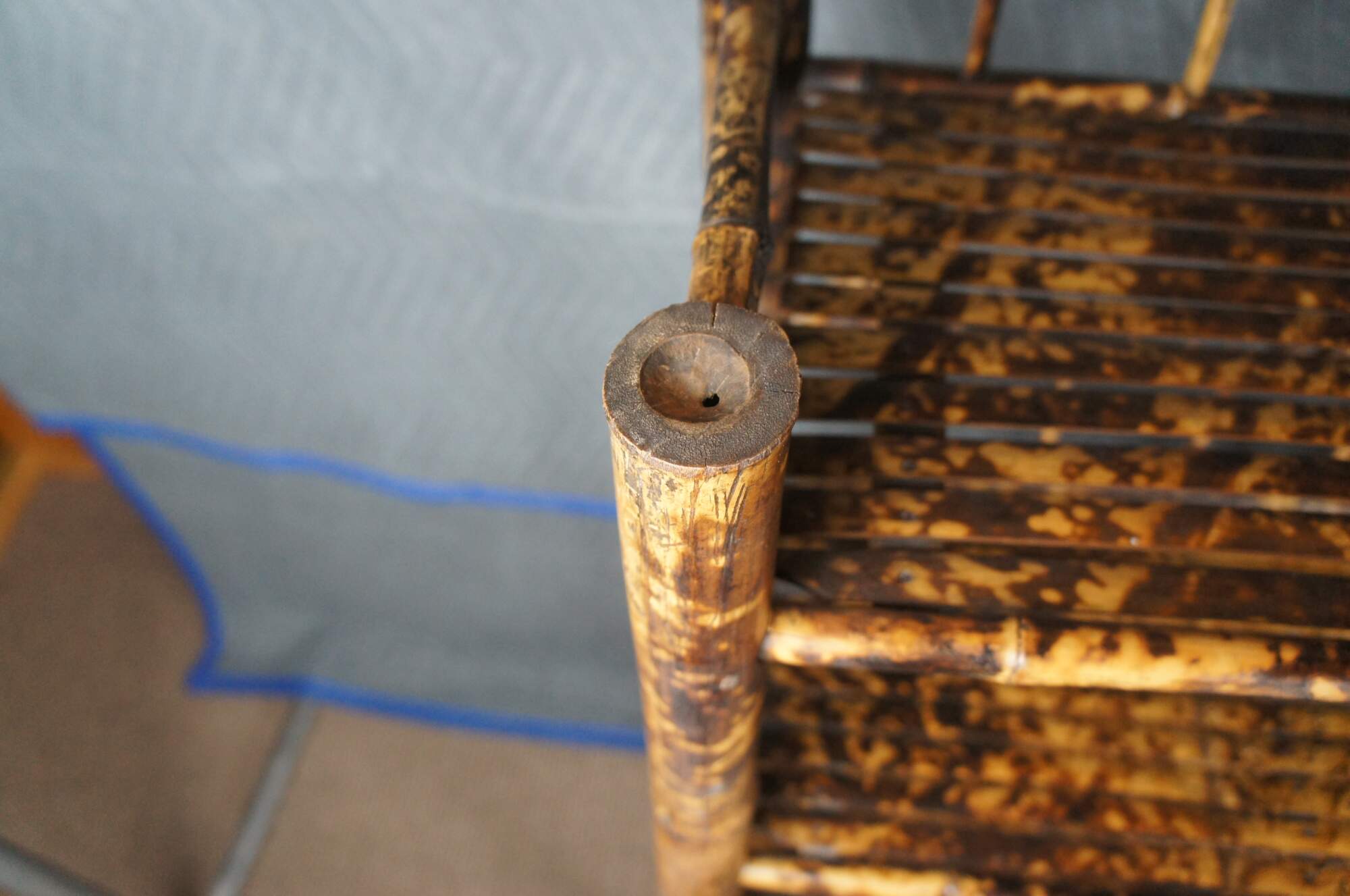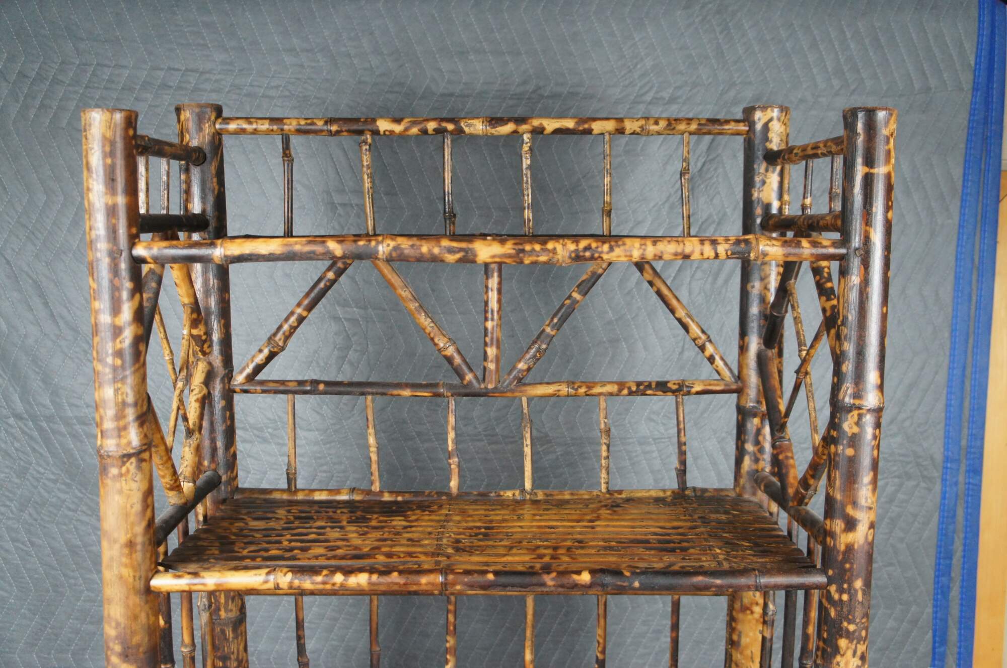 Antique Victorian bamboo library bookcase / etagere stand. Made of bamboo featuring a scorched / tortoise shell finish with four shelves, columns, and geometric pattern slats.