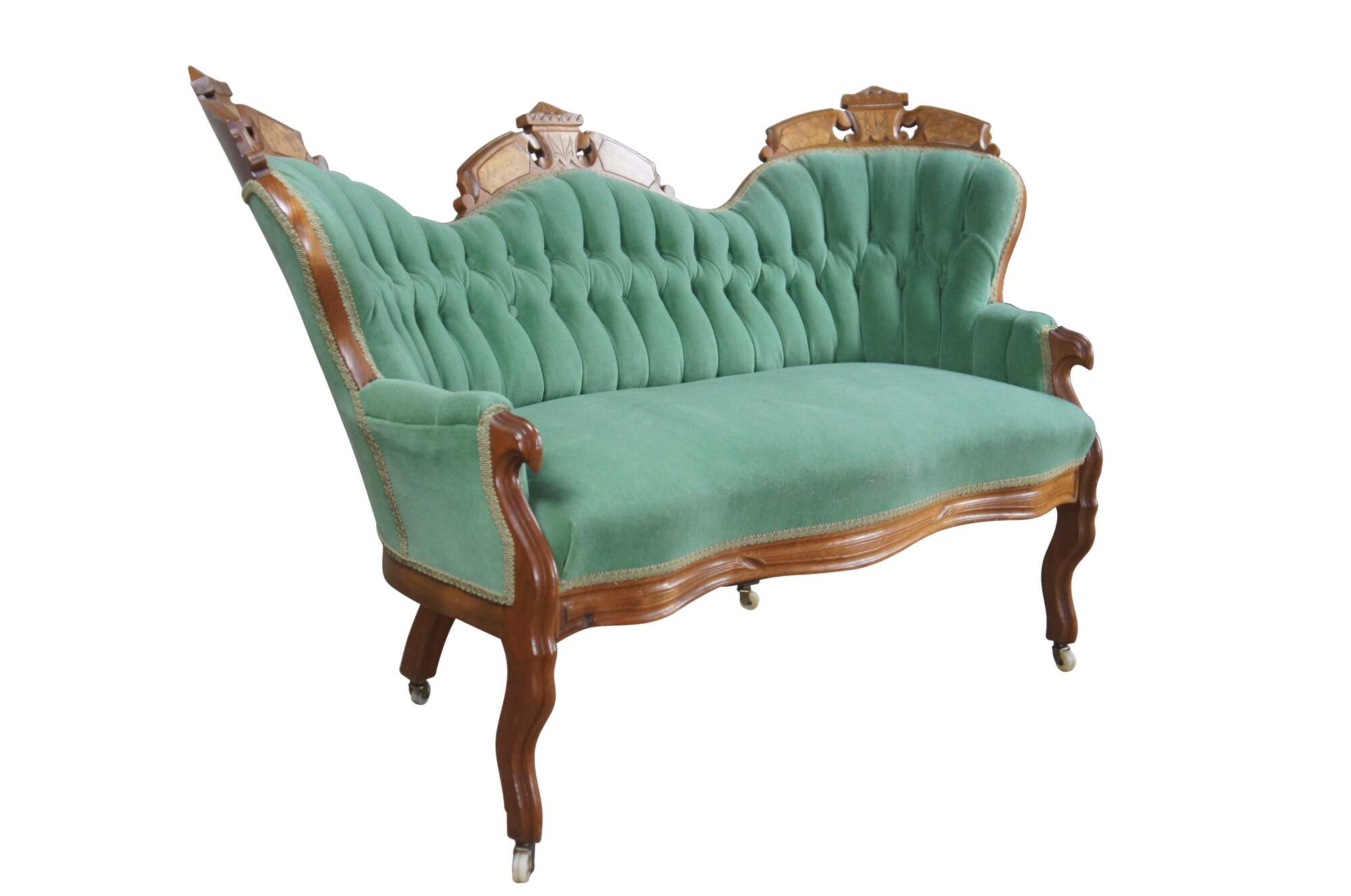 Antique Victorian Renaissance Revival parlor Settee. Made from walnut with a serpentine form featuring a carved camelback with burled panels. Upholstered in a green velvet / velour with a tufted back. The settee is supported by contoured legs with casters.