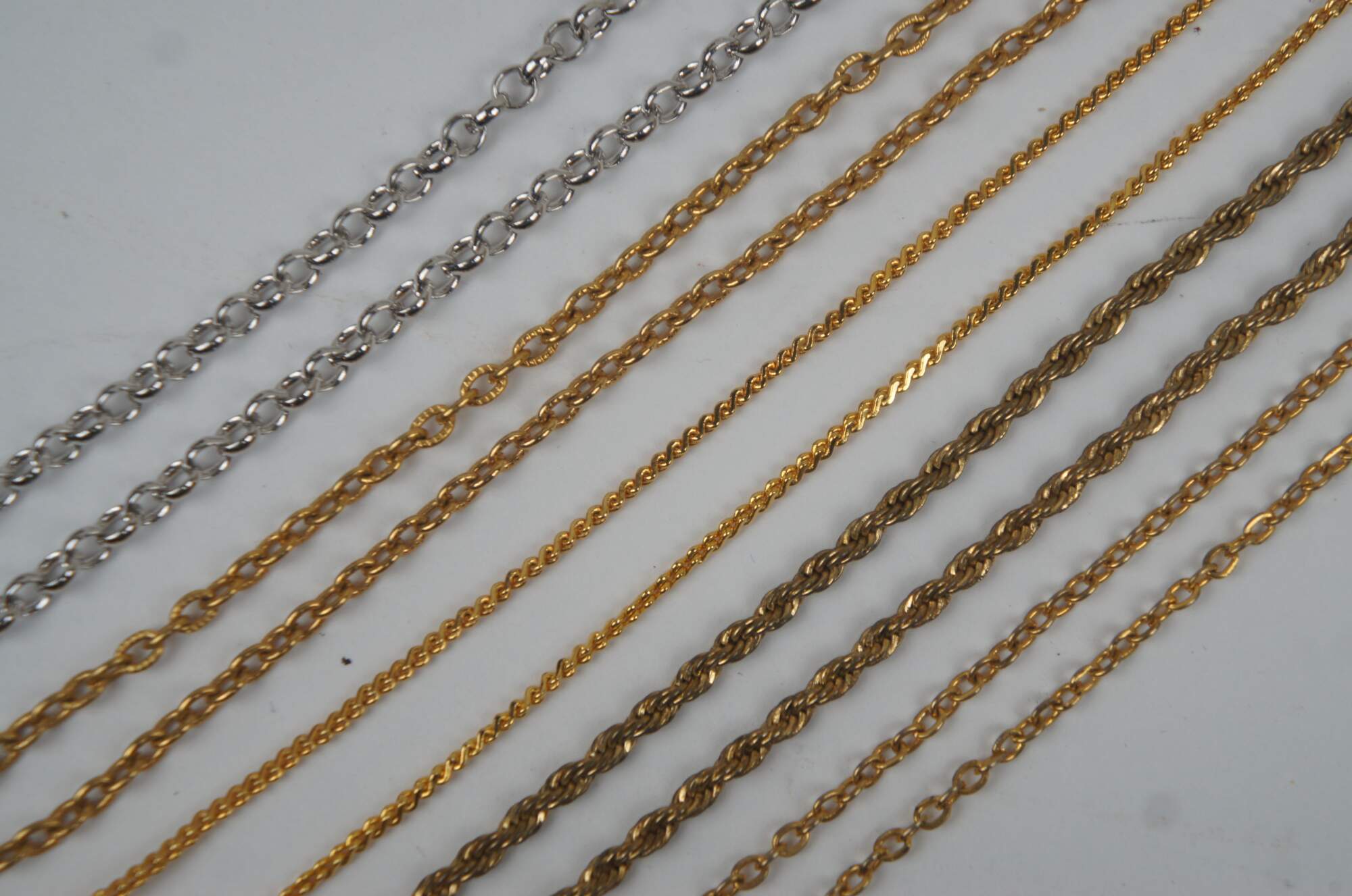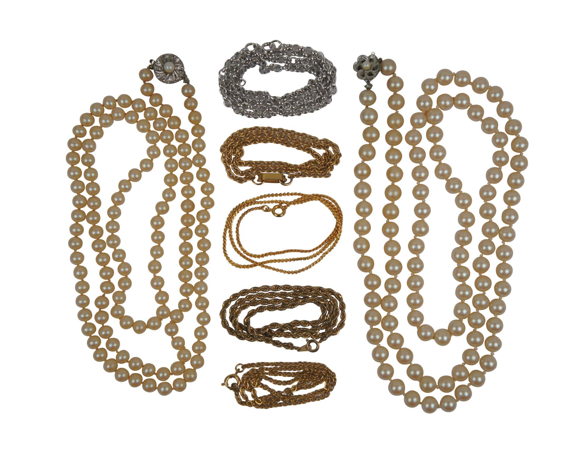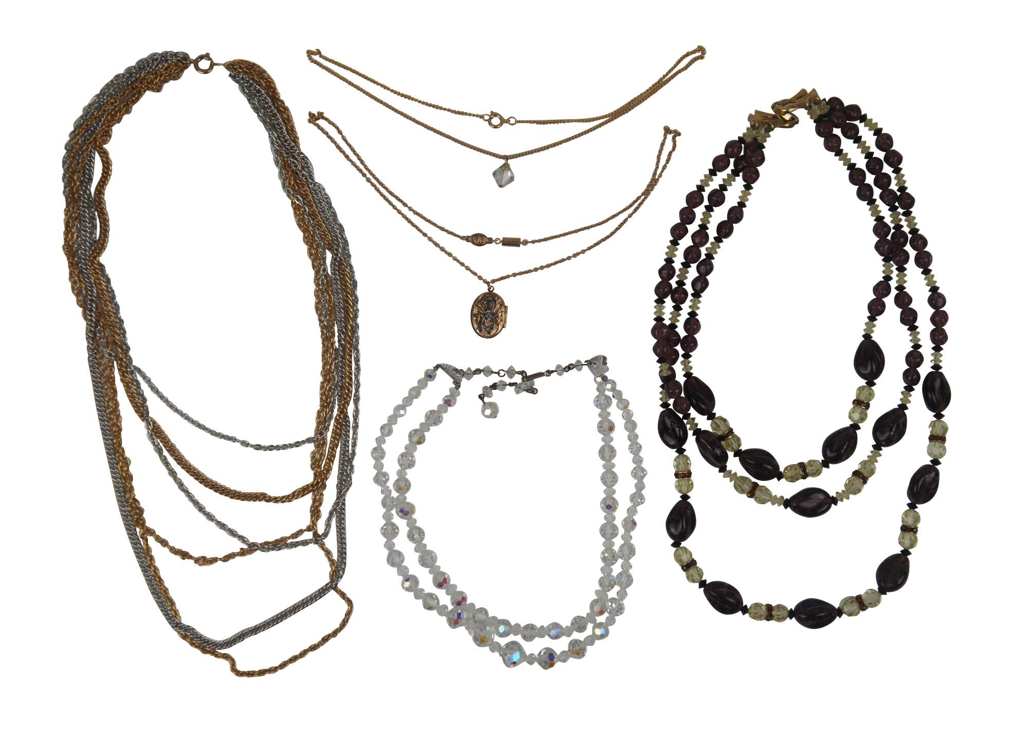 Lot of 12 vintage necklaces including two strands faux pearls, three multi-layered necklaces, two pendants, and five plain chains including an antique art deco / nouveau locket.