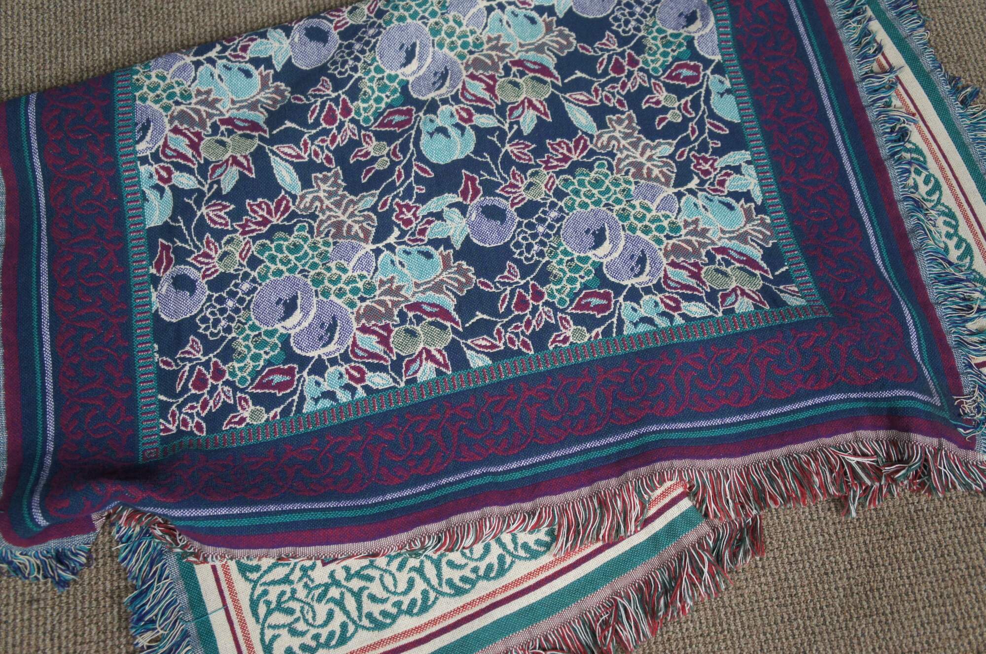 Late 20th century woven cotton tapestry throw blanket featuring a design of grapes, peaches, pears and plums, framed in interlocking vines and a fringed border. Attributed to Goodwin Weavers.