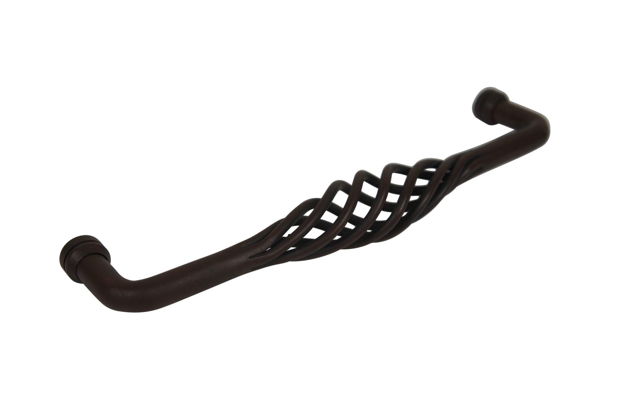 14 Available - Hole Centers 10" - Large twisted metal, birdcage style cabinet / appliance pull, finished in deep brown / dark bronze.