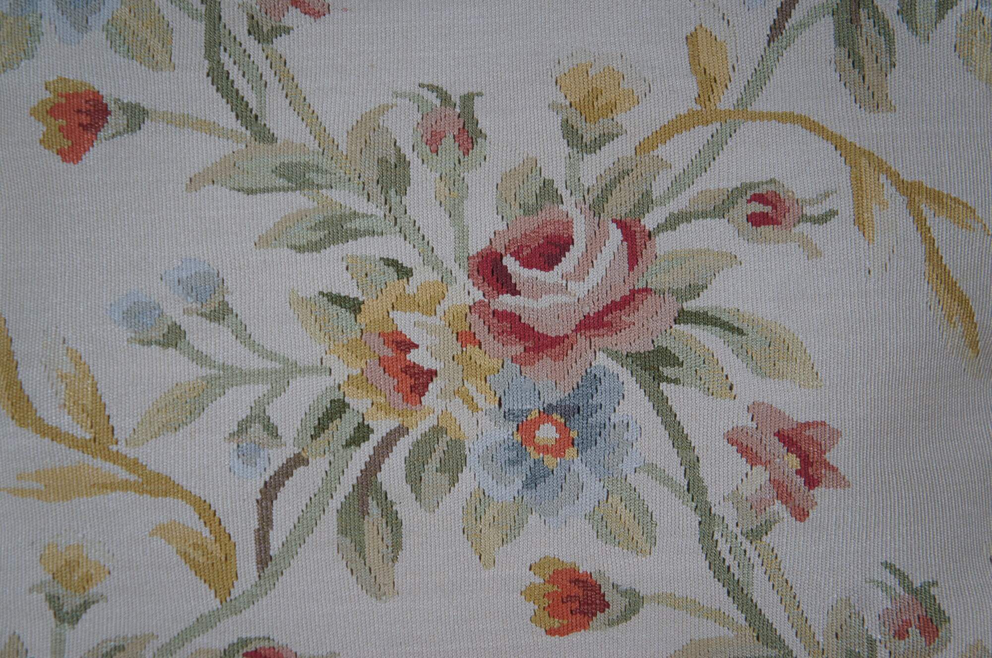 20th century square throw pillow, embroidered in silk with bouquets of pink, yellow, blue and orange flowers, connected with green and yellow stems. Down filled. Light brown velour / velvet back with zipper closure. Blue and gold ball tassel trim.