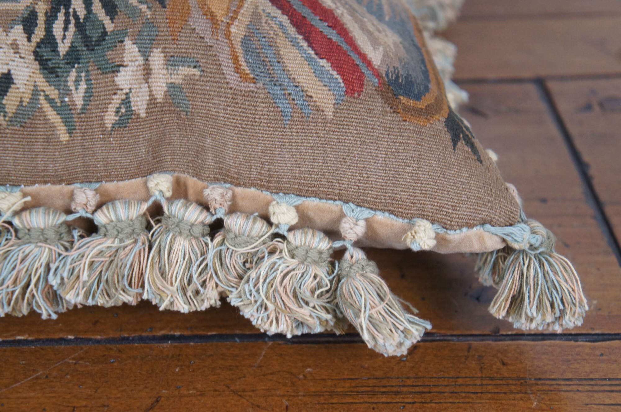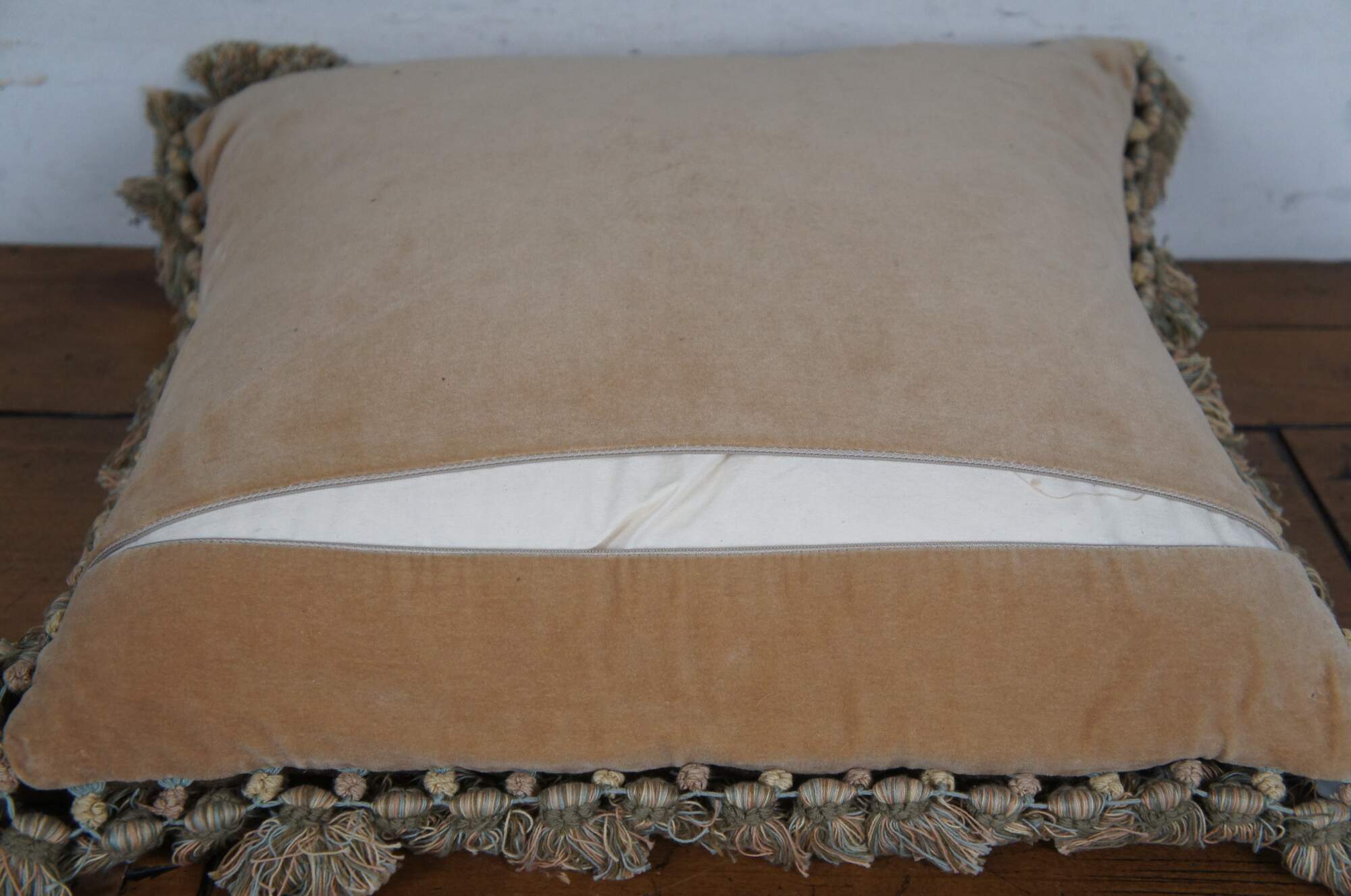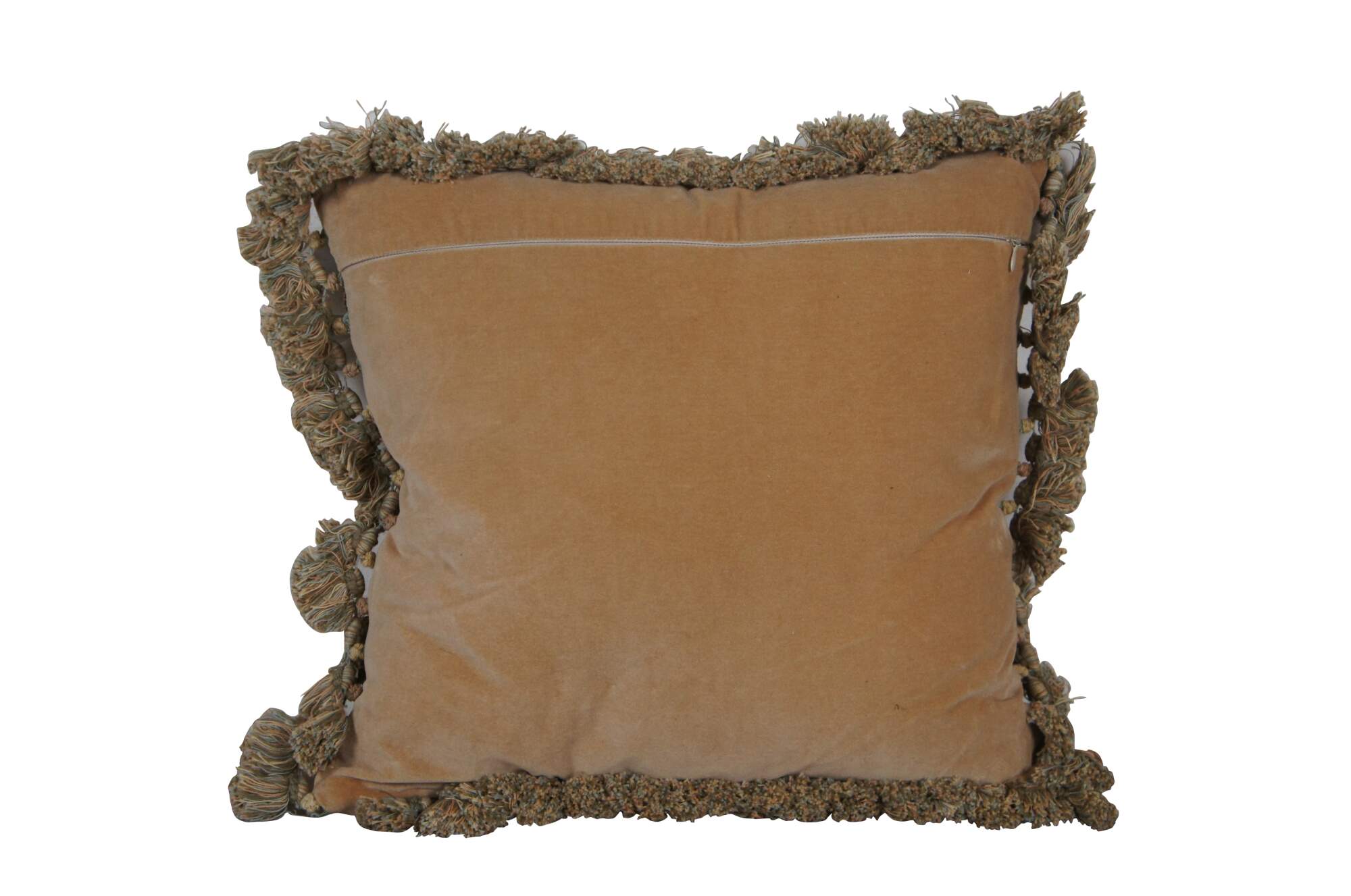 2 Available - 20th century square throw pillow, embroidered with the image of a knight in armor, flanked with trumpets and ribbons. Brown and green tassel trim. Light brown velour back with zipper closure. Down filled.