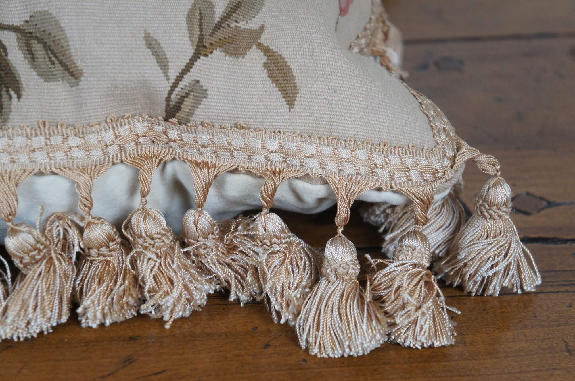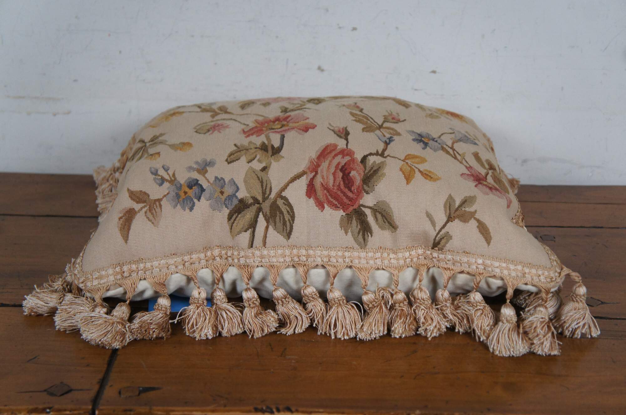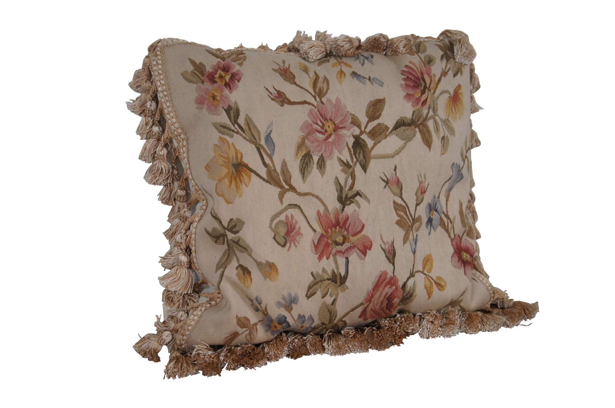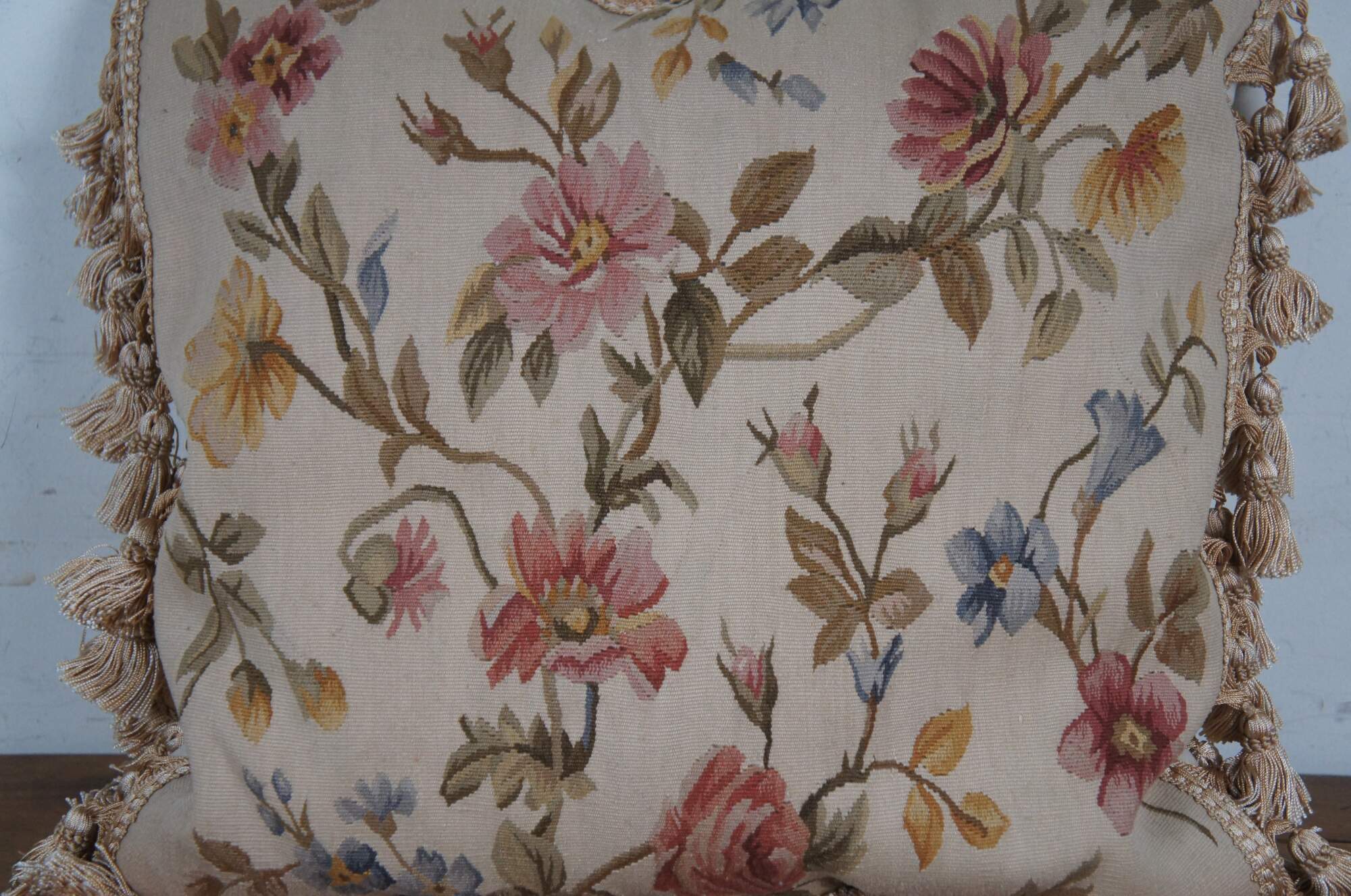 20th century square floral throw pillow, embroidered in wool with blue, pink, and yellow flowers on green-brown branches. Gold tassel trim. Cream velour back with zipper closure. Fiber filled. Made in China by Sea Gull Chinese Carpets.