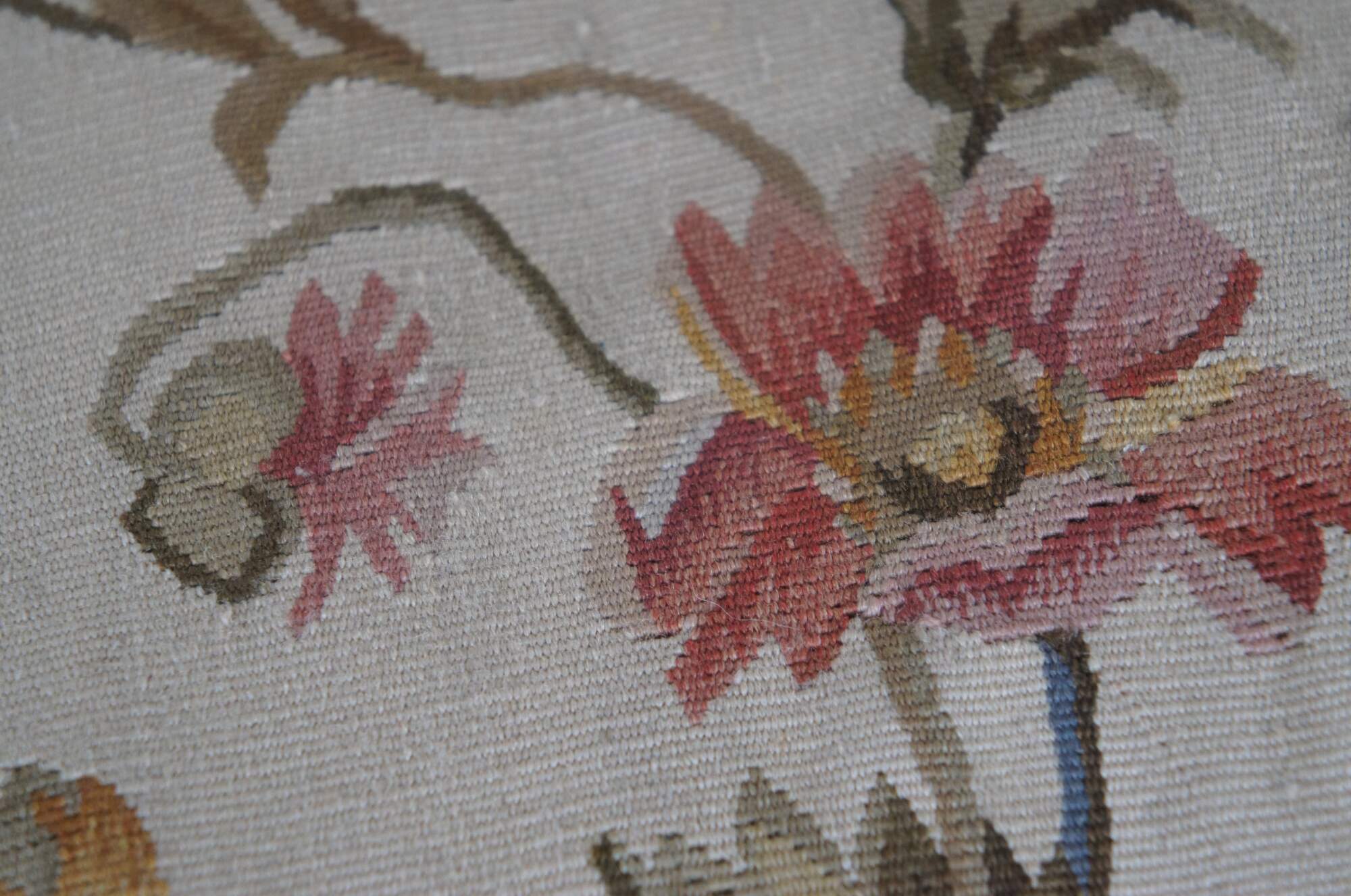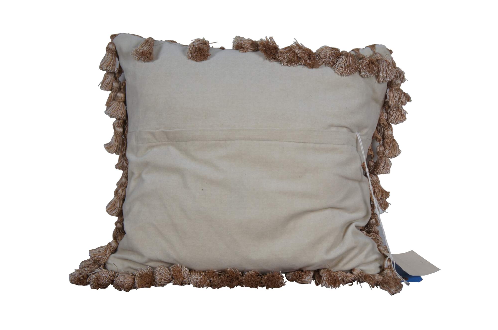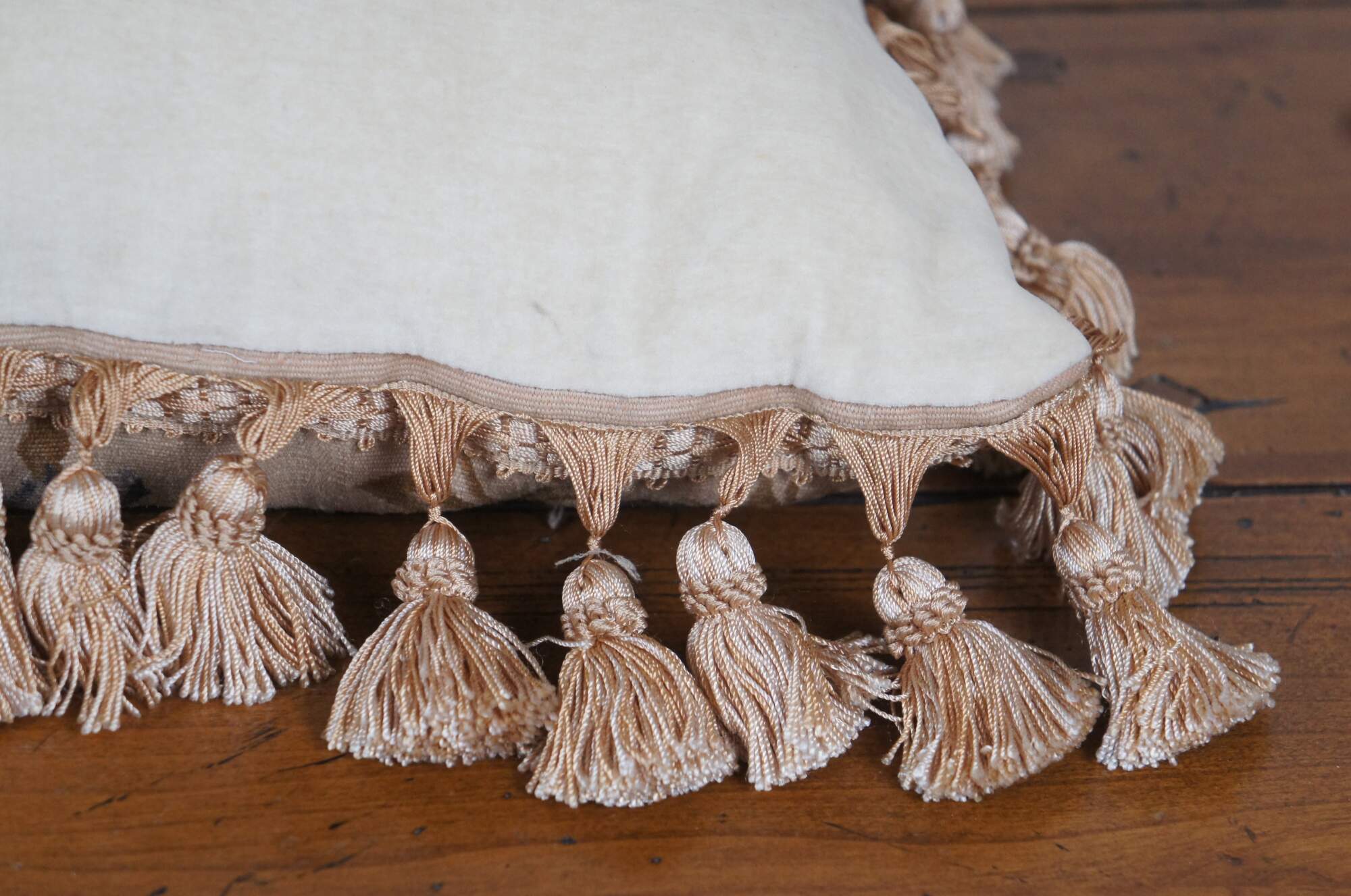 20th century square floral throw pillow, embroidered in wool with blue, pink, and yellow flowers on green-brown branches. Gold tassel trim. Cream velour back with zipper closure. Fiber filled. Made in China by Sea Gull Chinese Carpets.