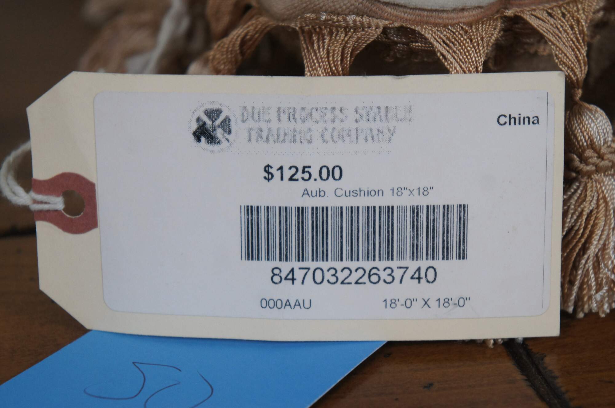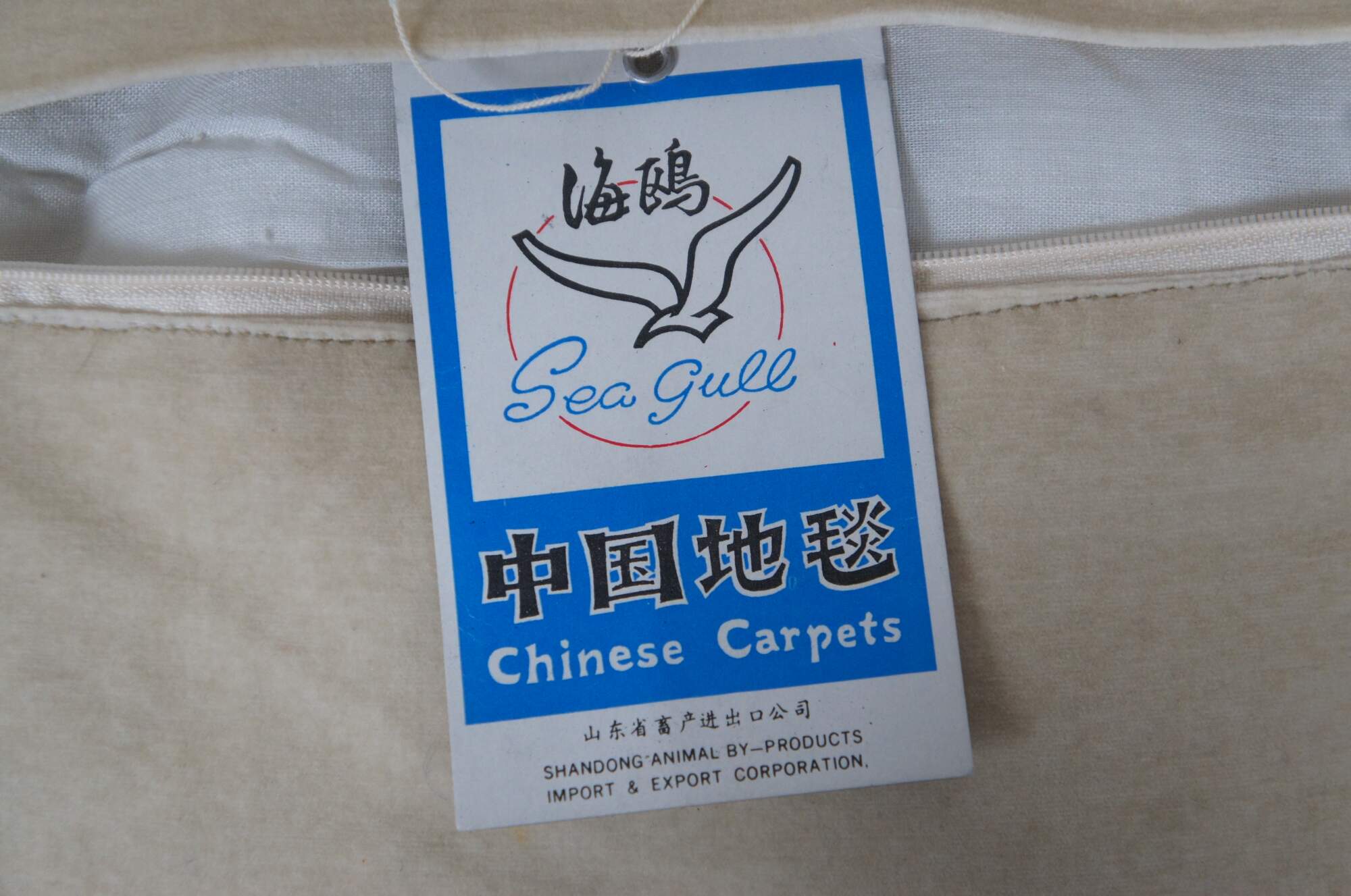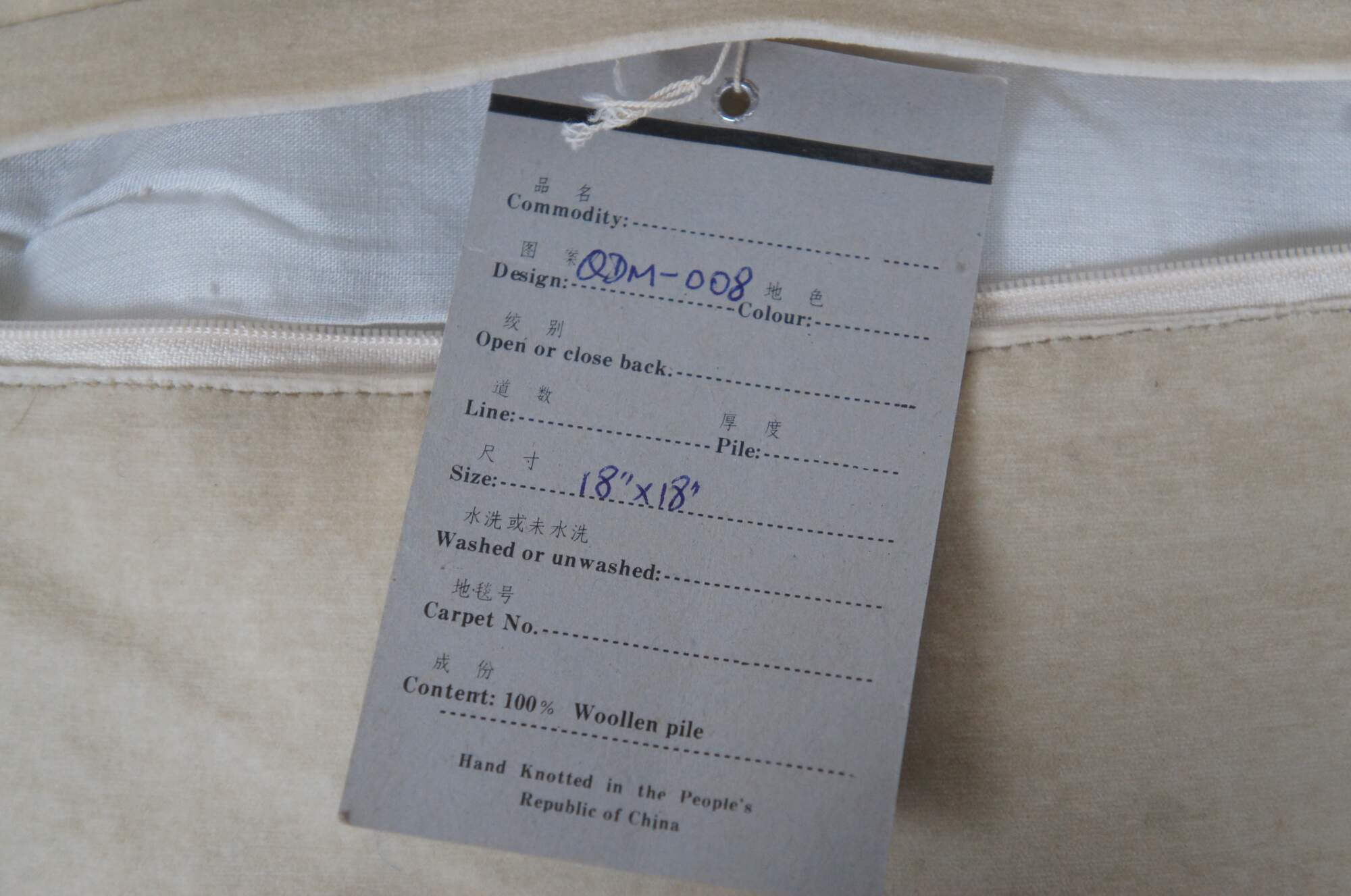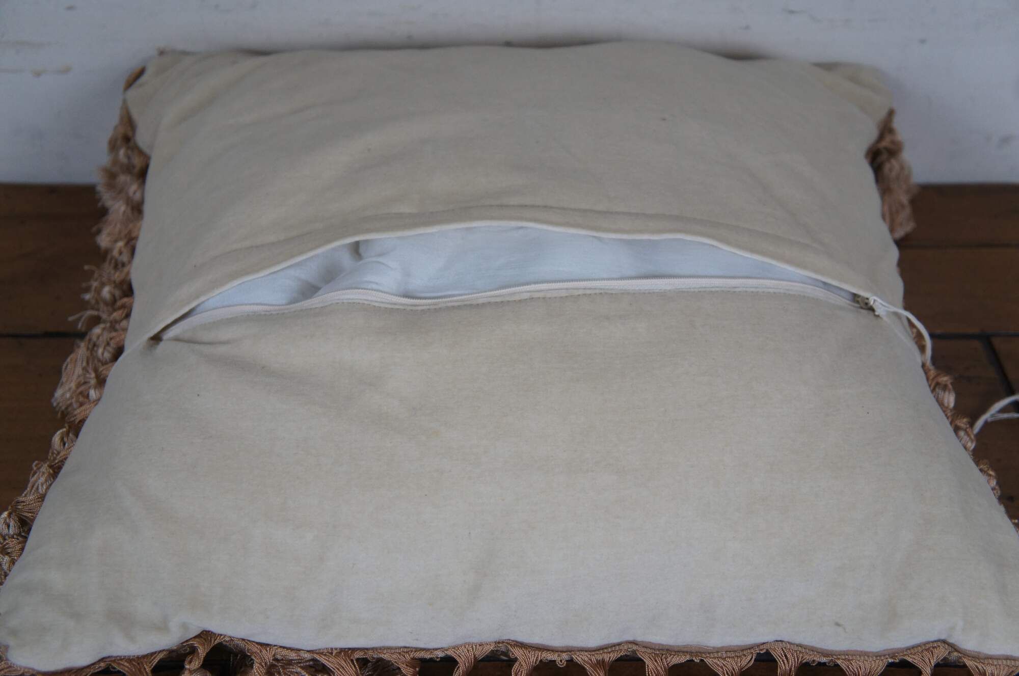20th century square floral throw pillow, embroidered in wool with blue, pink, and yellow flowers on green-brown branches. Gold tassel trim. Cream velour back with zipper closure. Fiber filled. Made in China by Sea Gull Chinese Carpets.