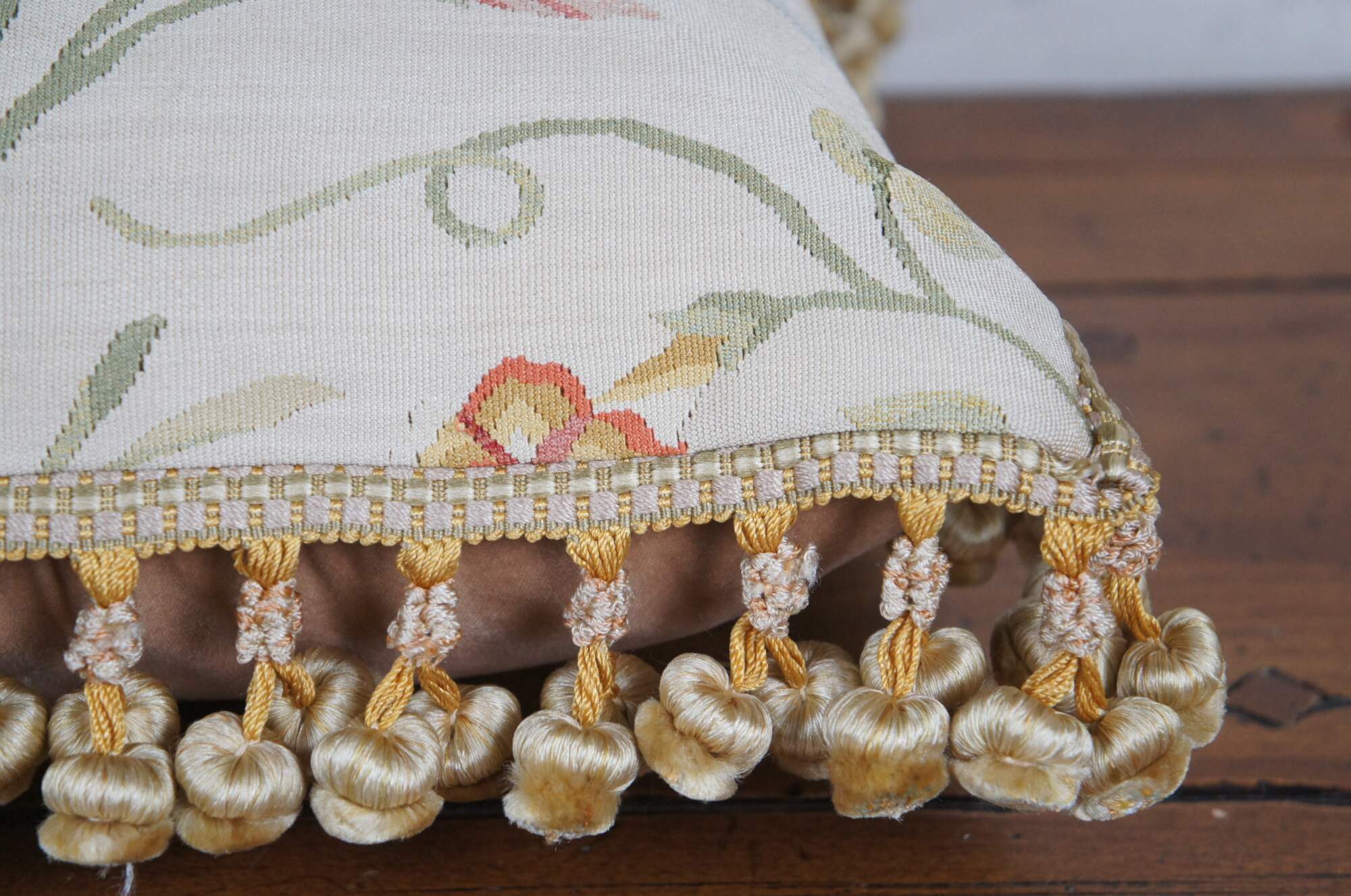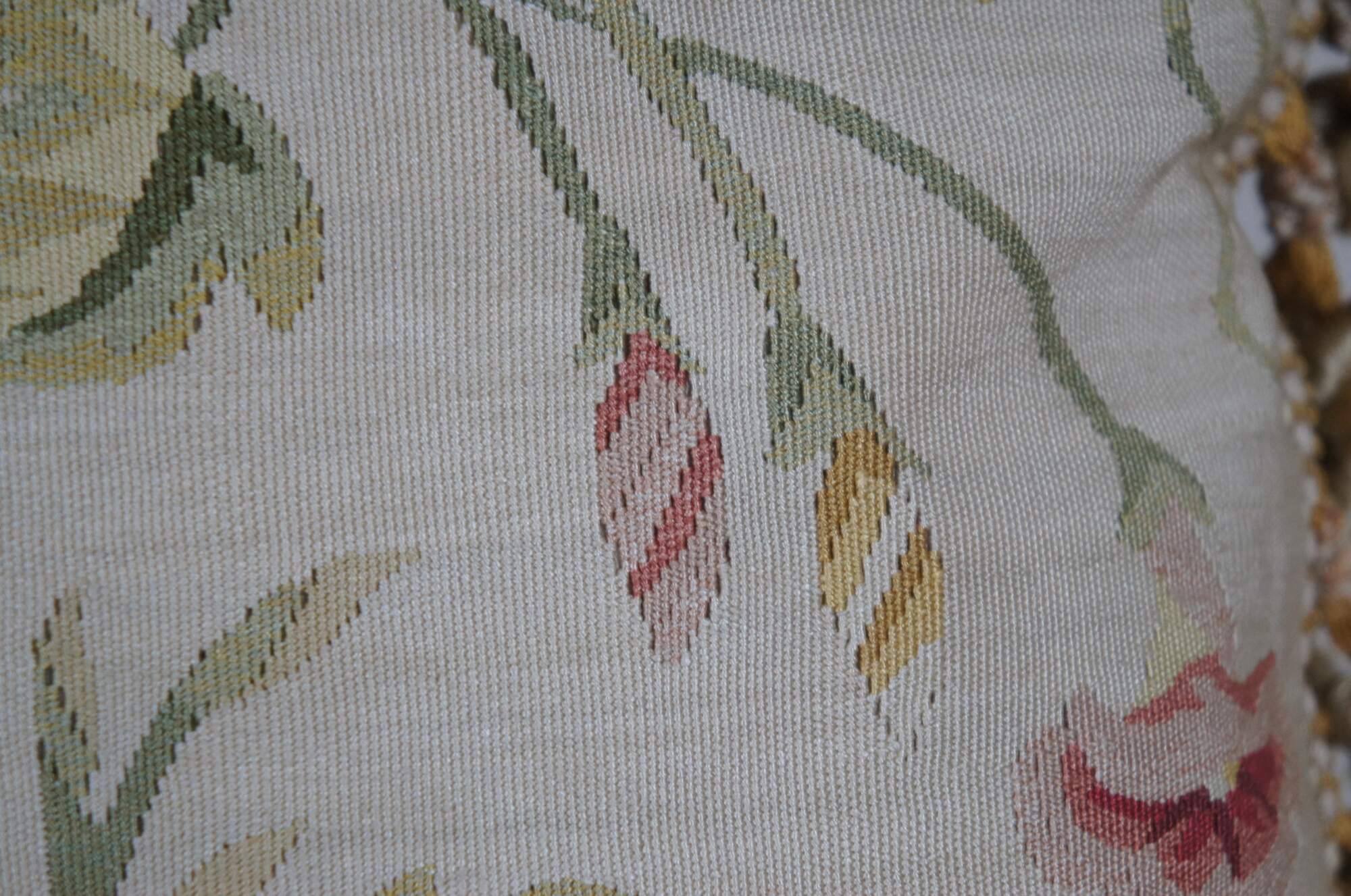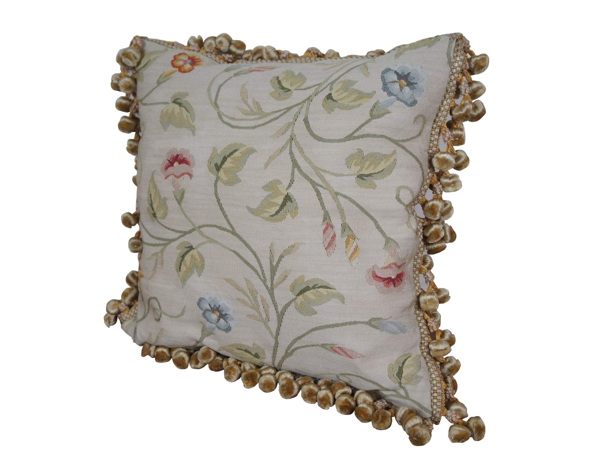 2 Available - 20th century square throw pillow, embroidered in silk with twisting green leafy stems sporting pink, blue, and orange morning glories. Cream and gold ball tassel trim. Beige velour back with zipper closure. Down filled.