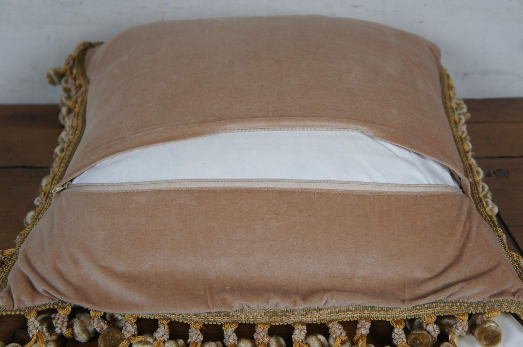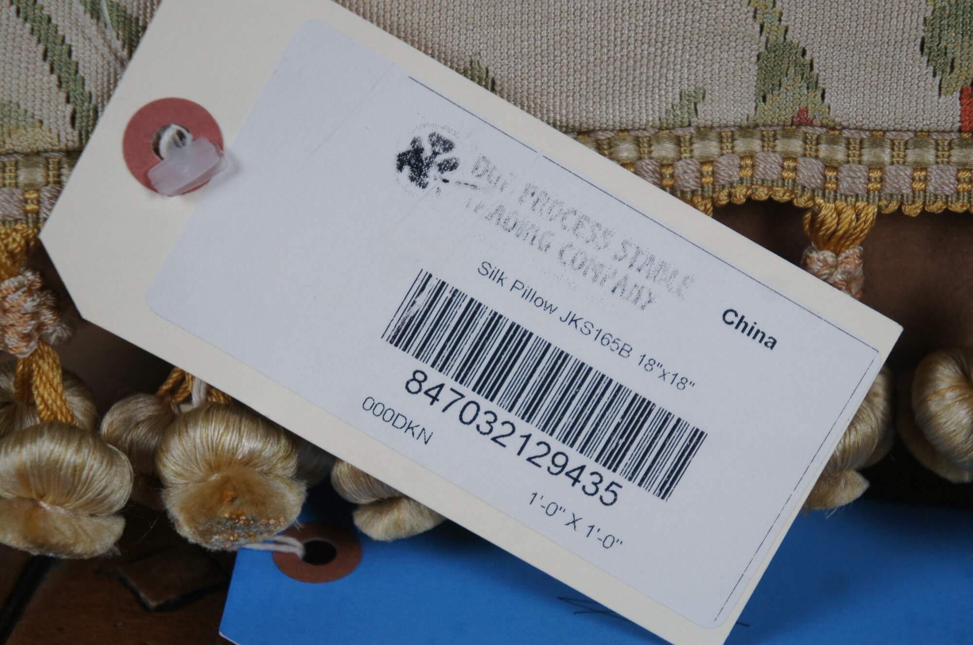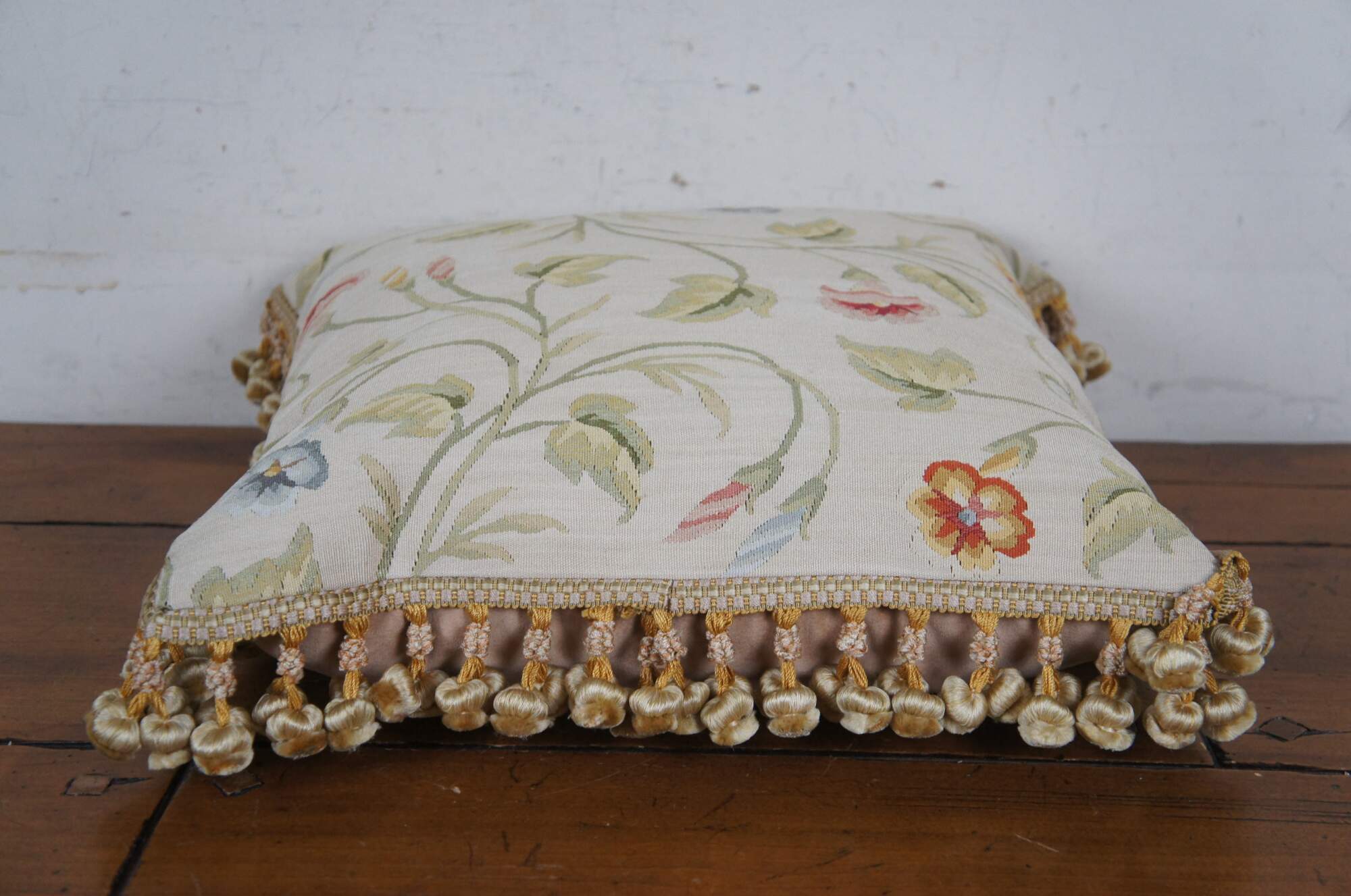 2 Available - 20th century square throw pillow, embroidered in silk with twisting green leafy stems sporting pink, blue, and orange morning glories. Cream and gold ball tassel trim. Beige velour back with zipper closure. Down filled.