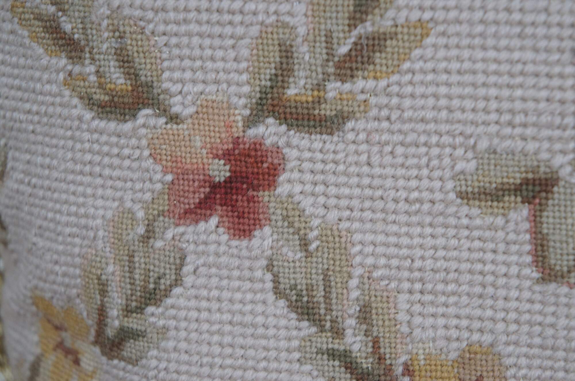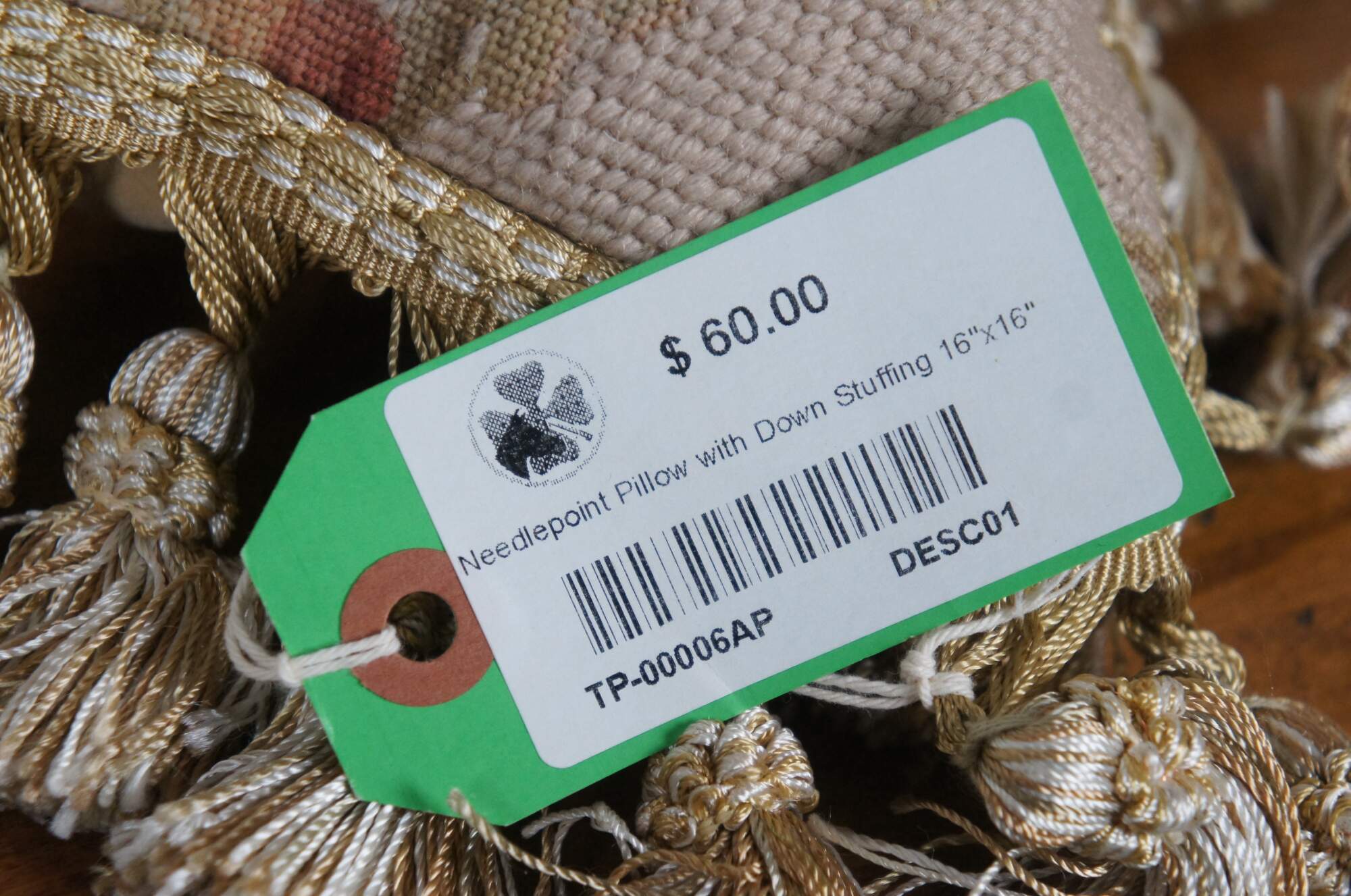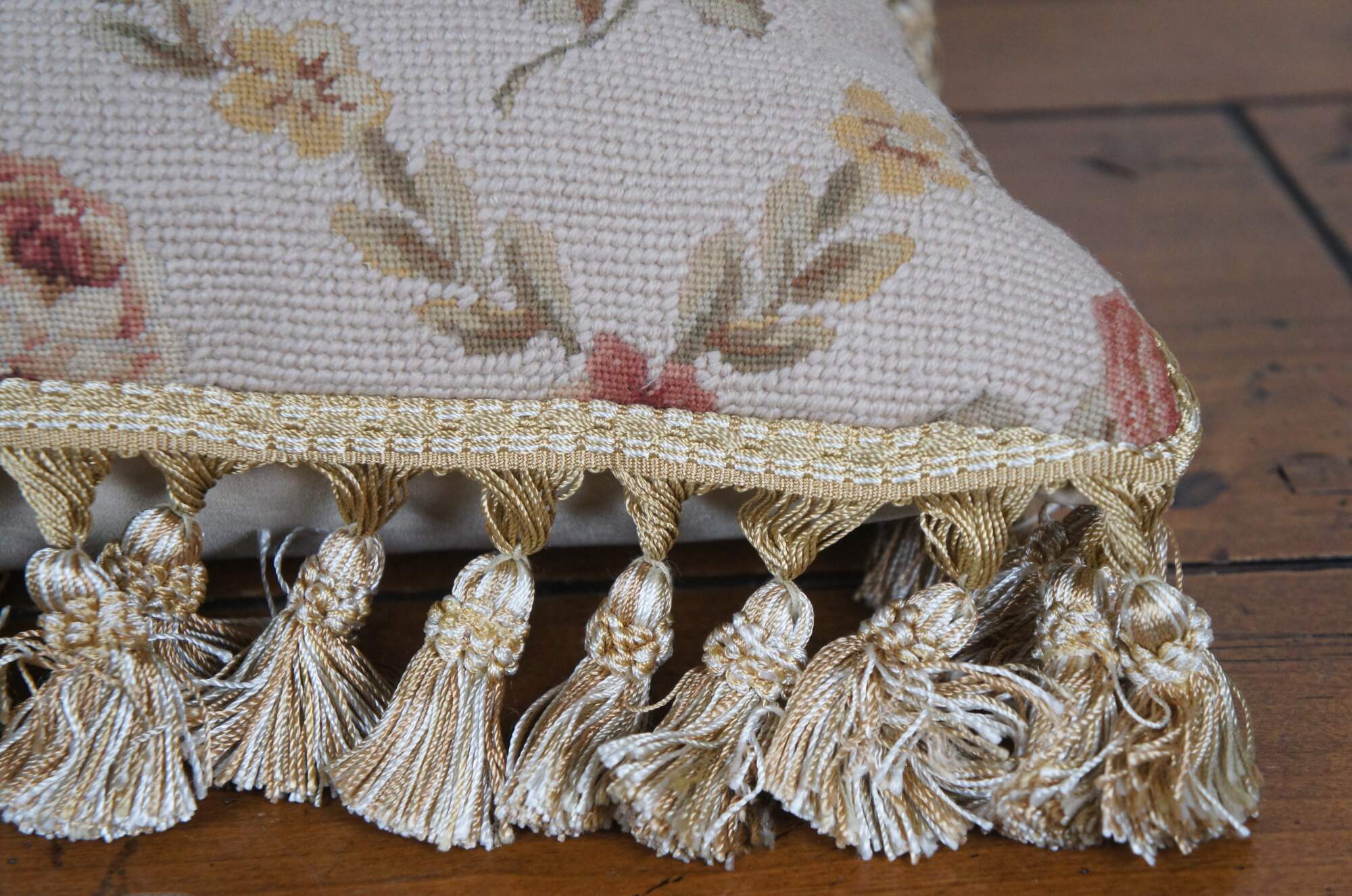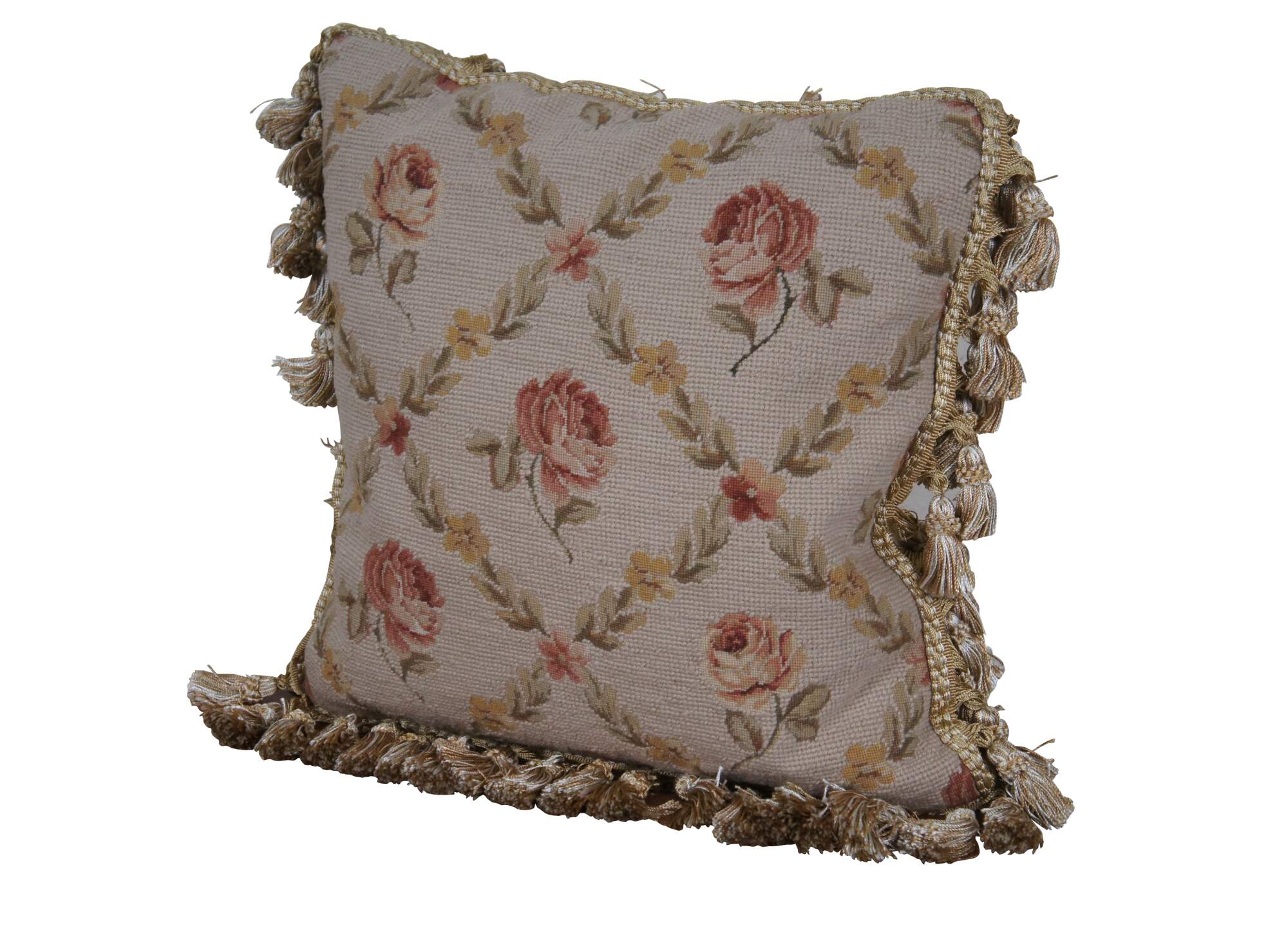 2 Available - 20th century square needlepoint throw pillow, hand embroidered with a pattern of pink roses, divided by criss crossing lines of pink and yellow flowers and leaves, on a beige background. Cream and gold tassel trim. Beige velour back with zipper closure. Down filled.
