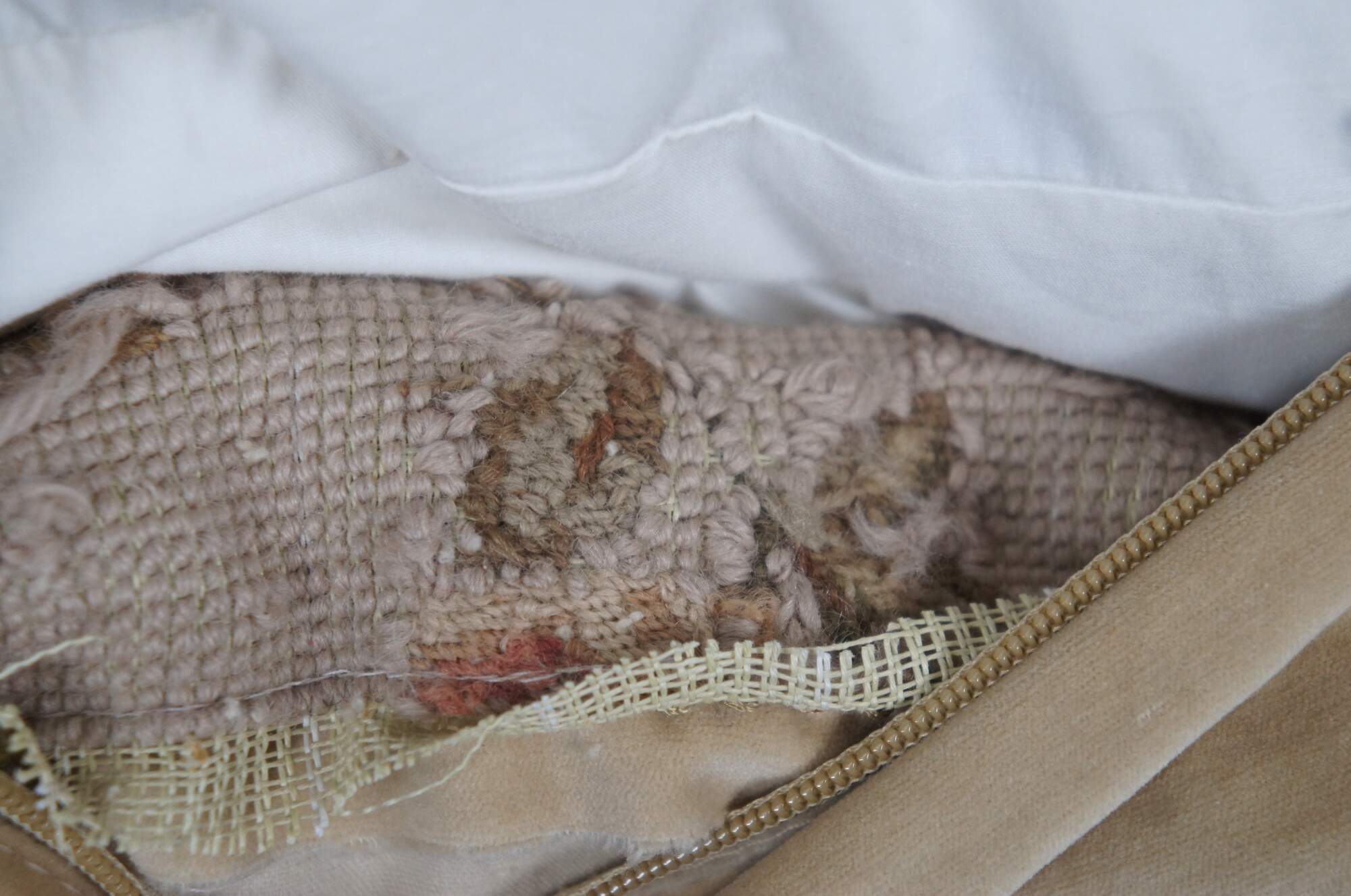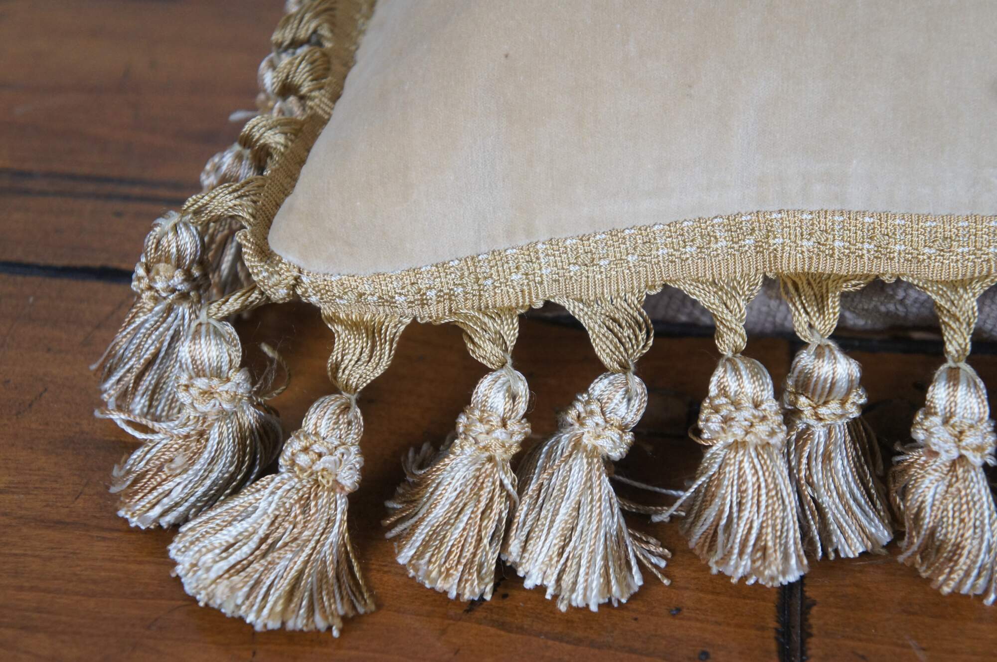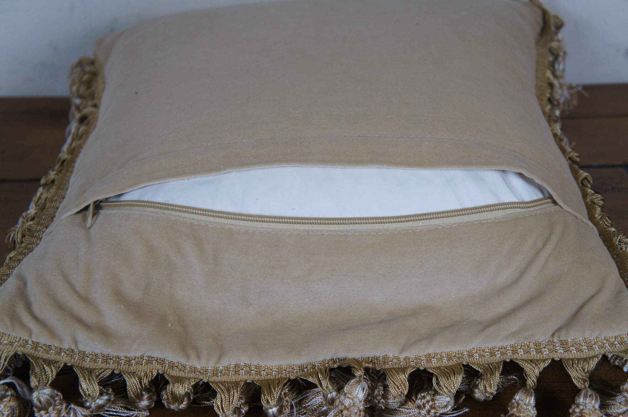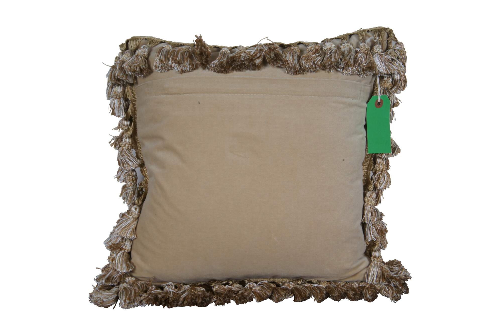 2 Available - 20th century square needlepoint throw pillow, hand embroidered with a pattern of pink roses, divided by criss crossing lines of pink and yellow flowers and leaves, on a beige background. Cream and gold tassel trim. Beige velour back with zipper closure. Down filled.