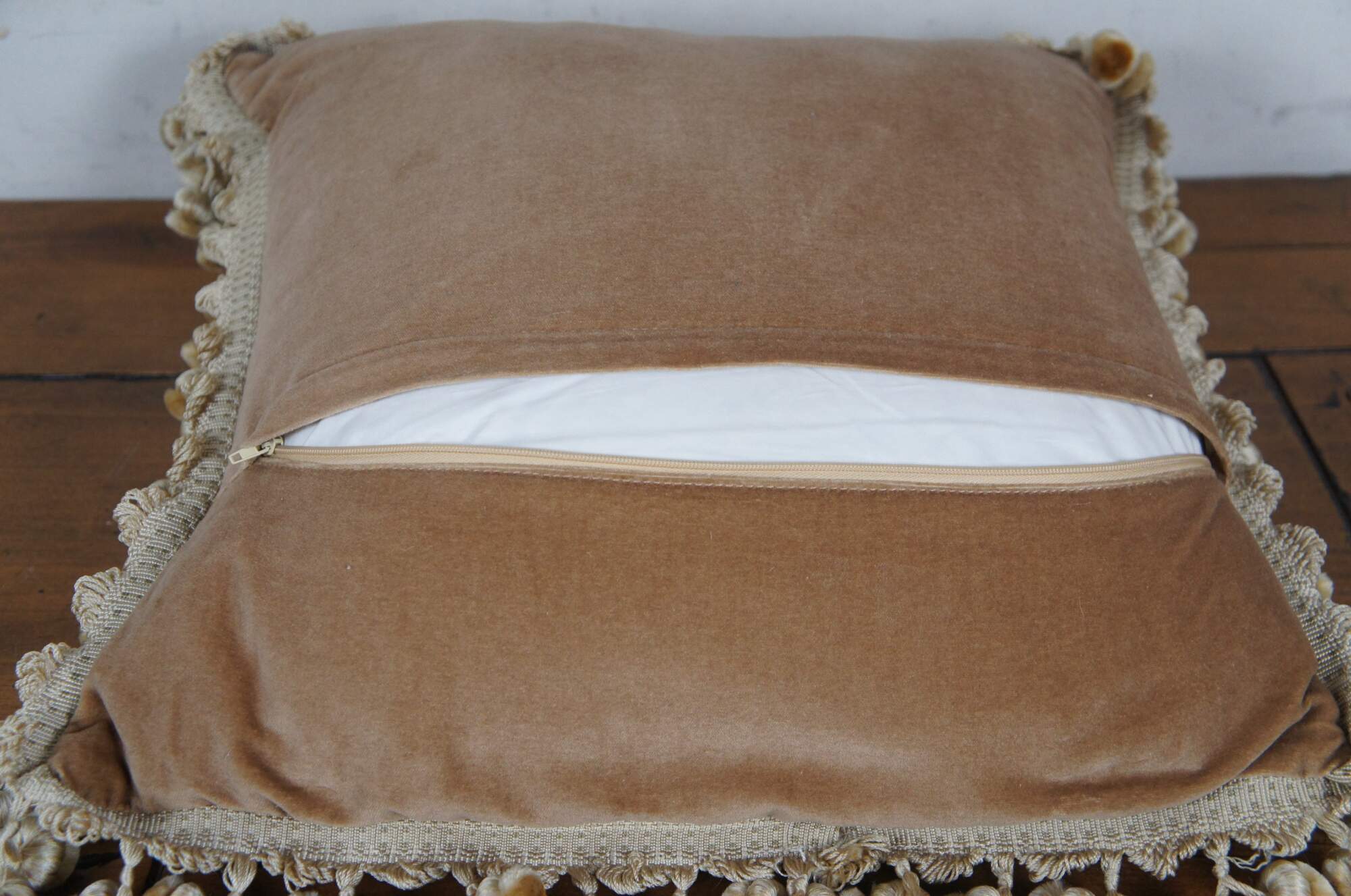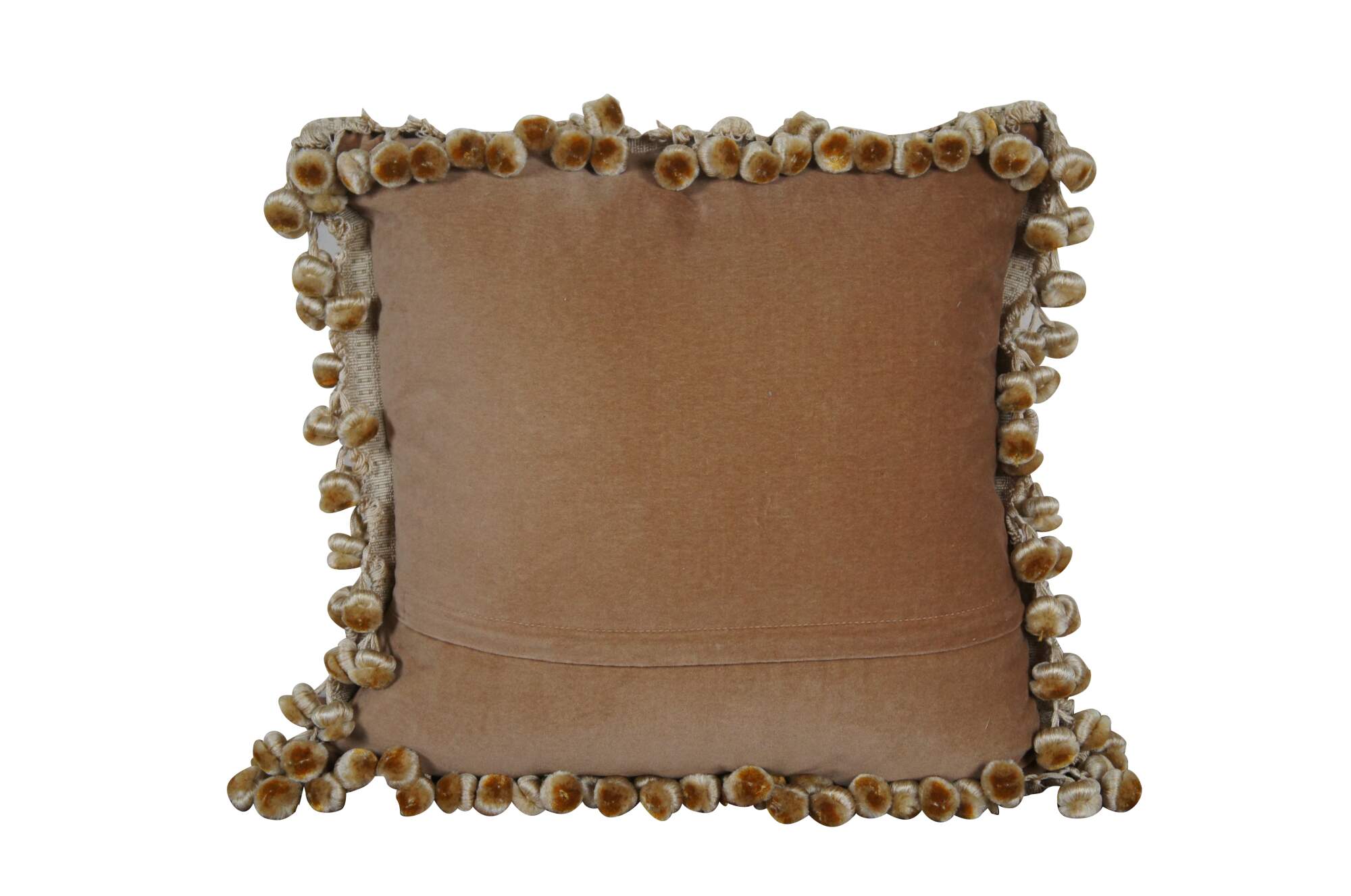 20th century square throw pillow, embroidered in silk with a leafy bouquet of red, pink, orange, and blue flowers. Light beige ball tassel trim. Light brown velour back with zipper closure. Down filled.