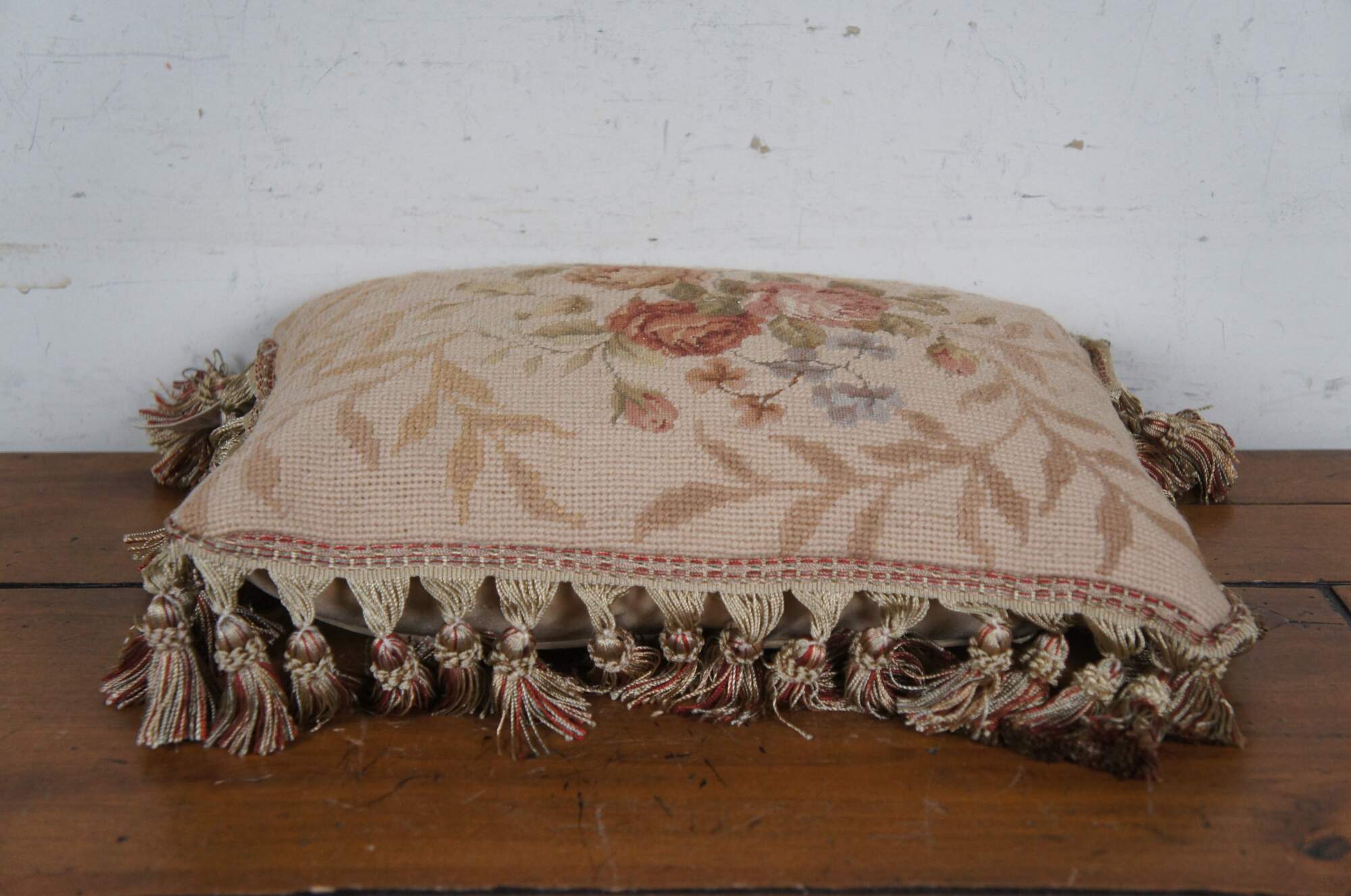 20th century rectangular needlepoint lumbar / throw pillow, hand embroidered in wool with a bouquet of pink, rust, yellow, and blue roses / flowers on a backdrop of beige leaves. Beige and red tassel trim. Beige velour back with zipper closure. Down filled. Made in China.