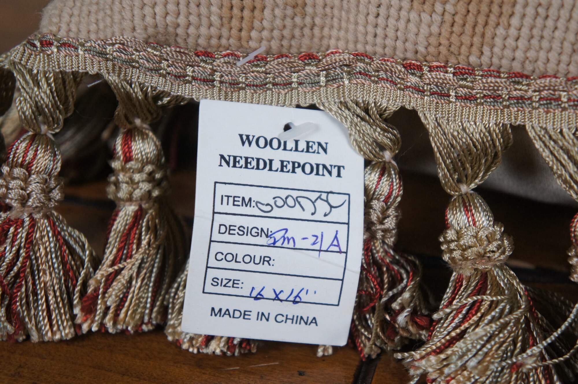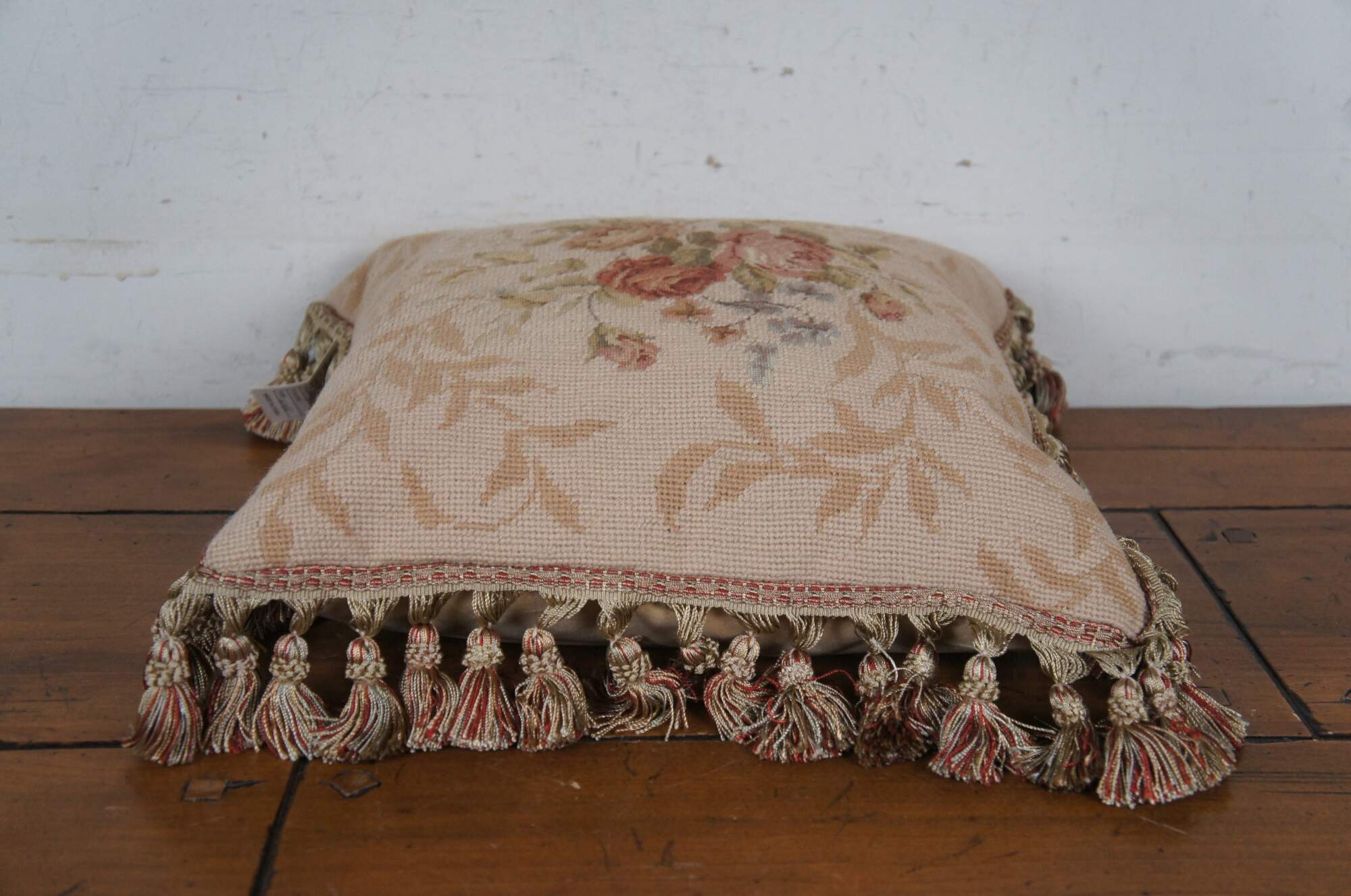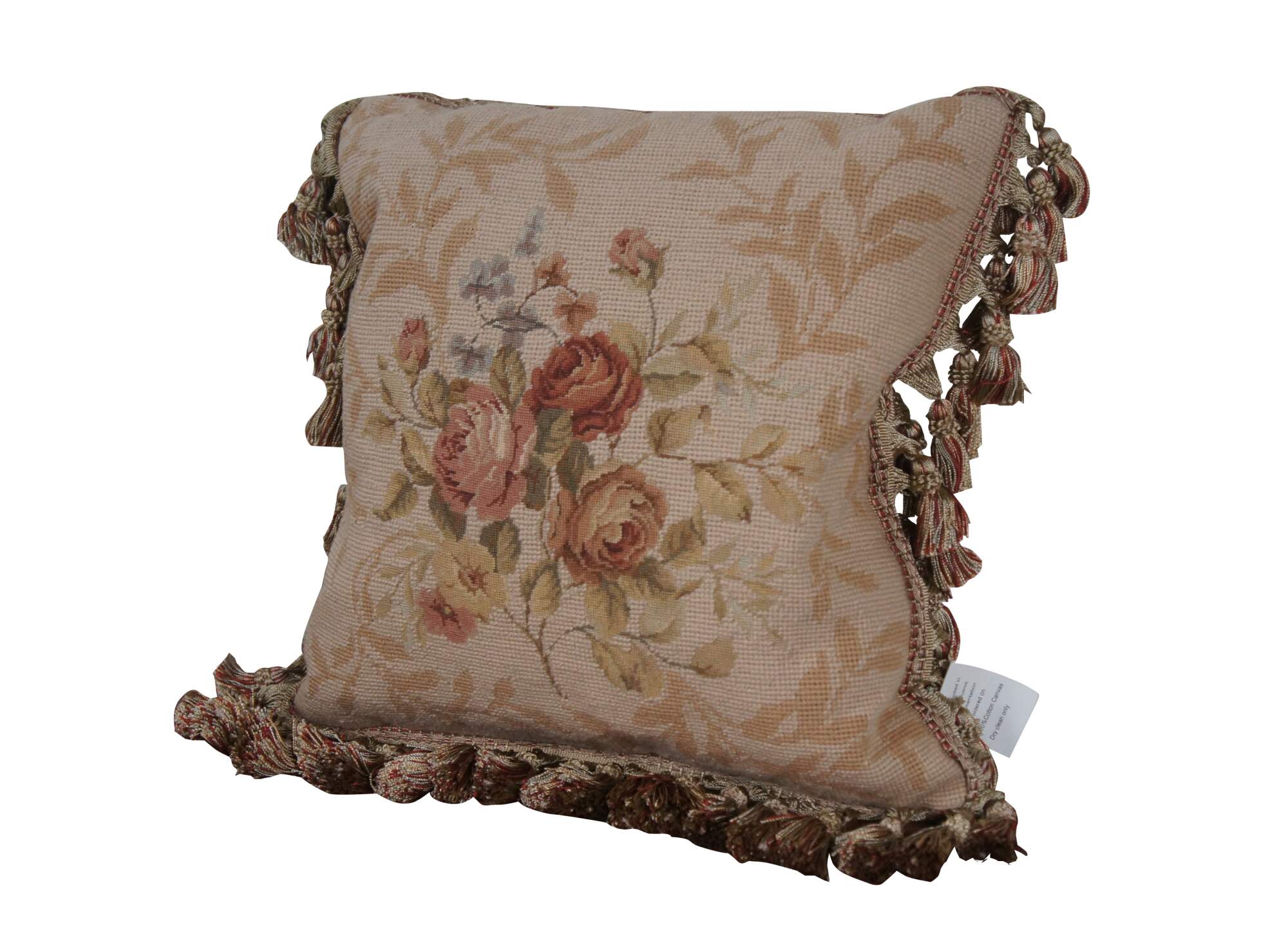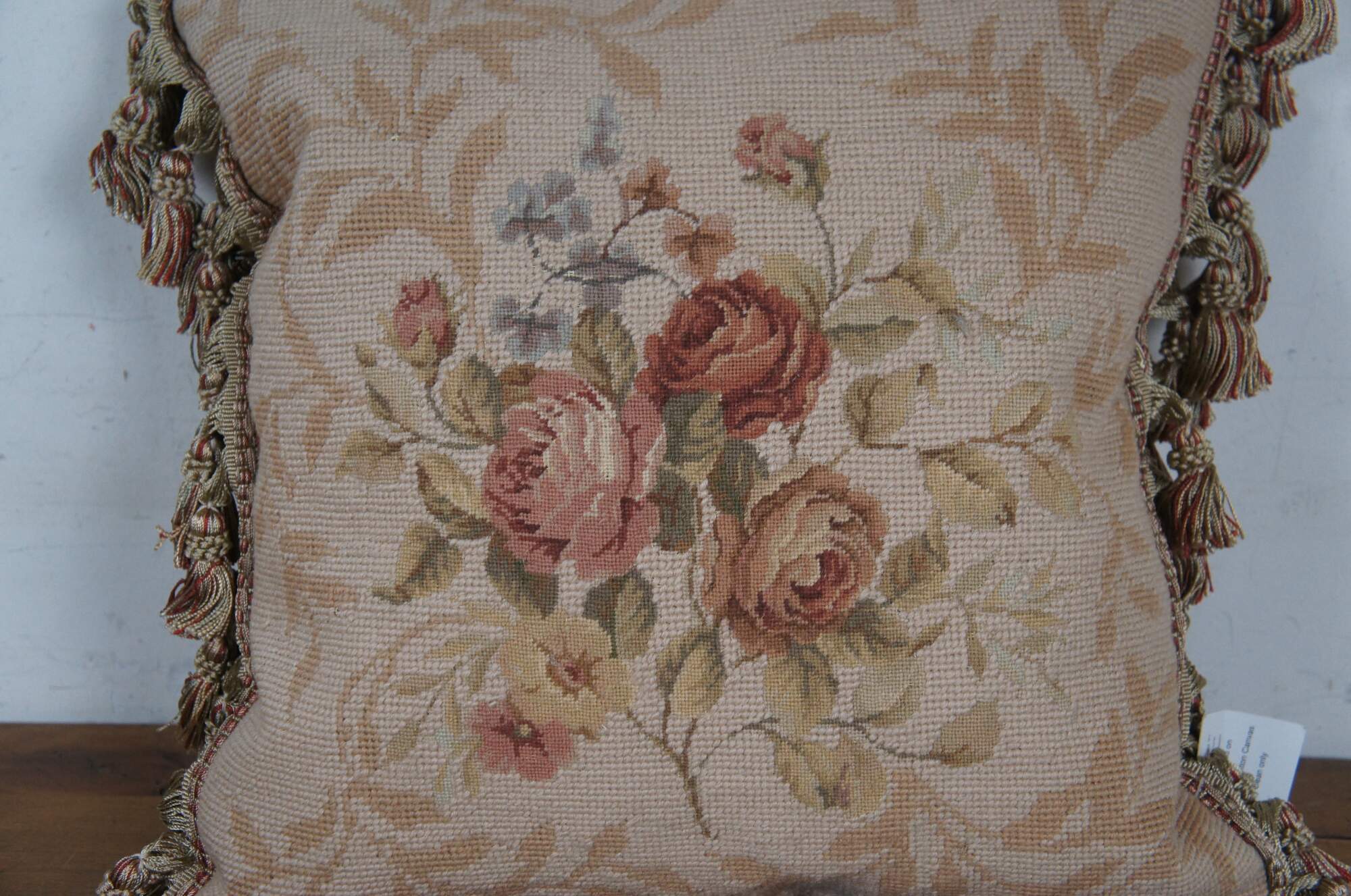 2 Available - 20th century square needlepoint throw pillow, hand embroidered in wool with a bouquet of pink, rust, yellow, and blue roses / flowers on a backdrop of beige leaves. Beige and red tassel trim. Beige velour back with zipper closure. Down filled. Made in China.
