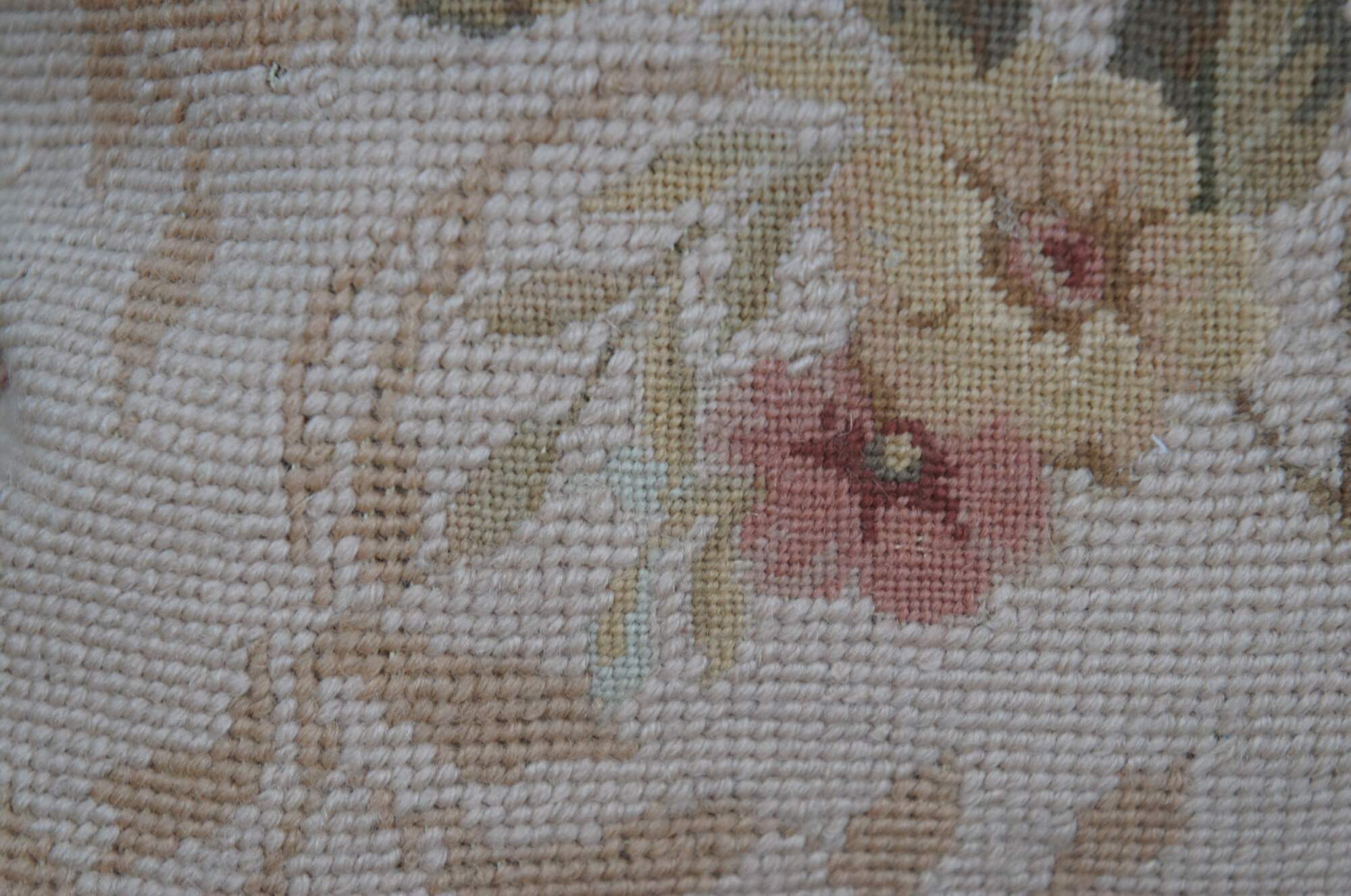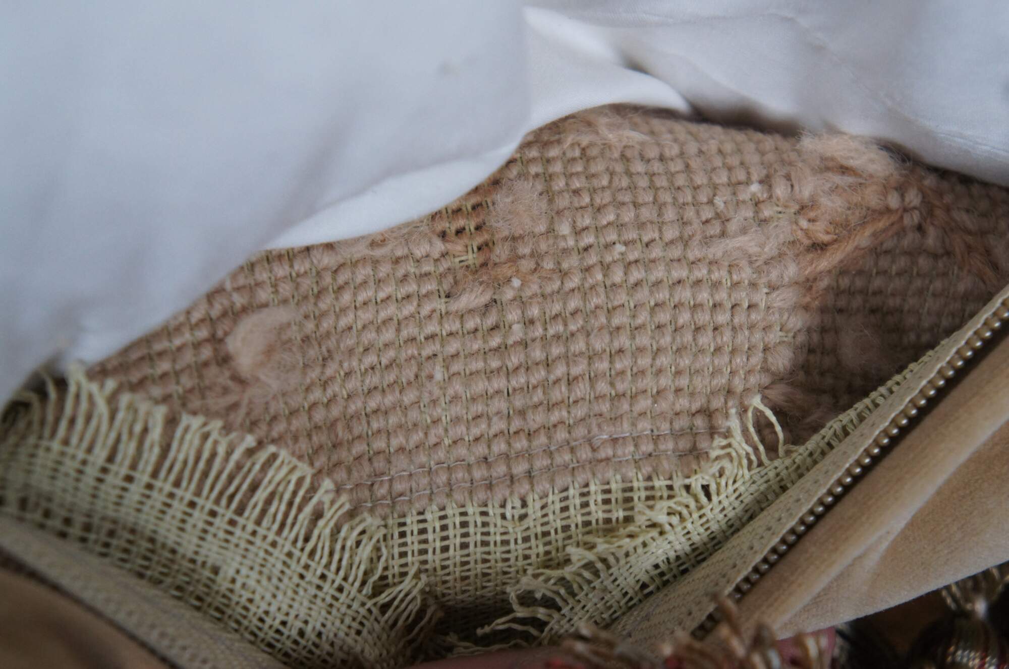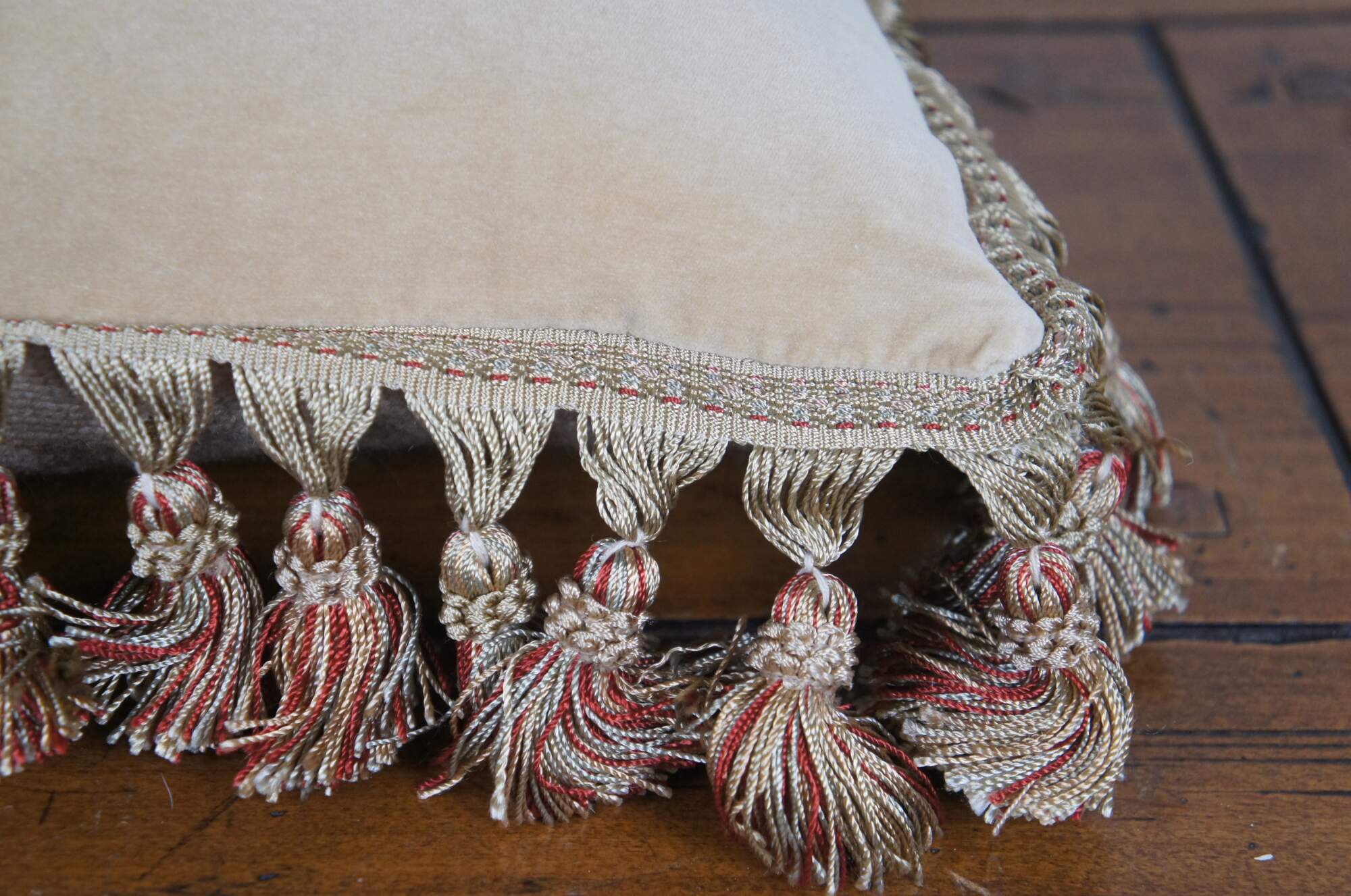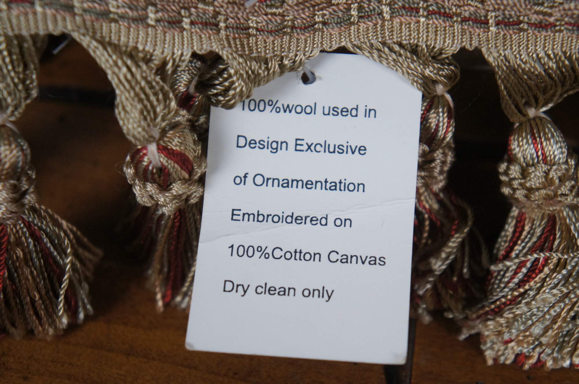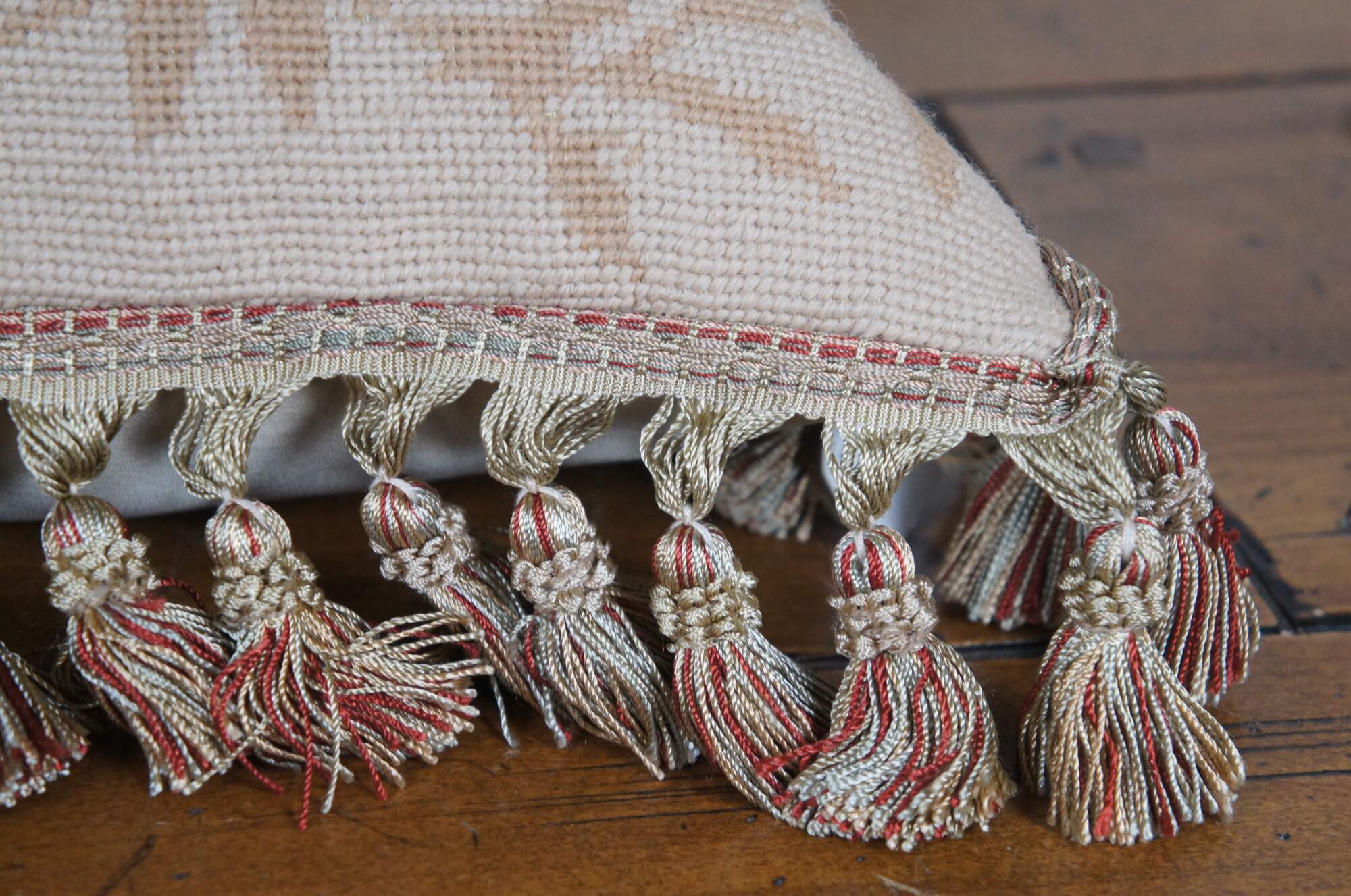 2 Available - 20th century square needlepoint throw pillow, hand embroidered in wool with a bouquet of pink, rust, yellow, and blue roses / flowers on a backdrop of beige leaves. Beige and red tassel trim. Beige velour back with zipper closure. Down filled. Made in China.
