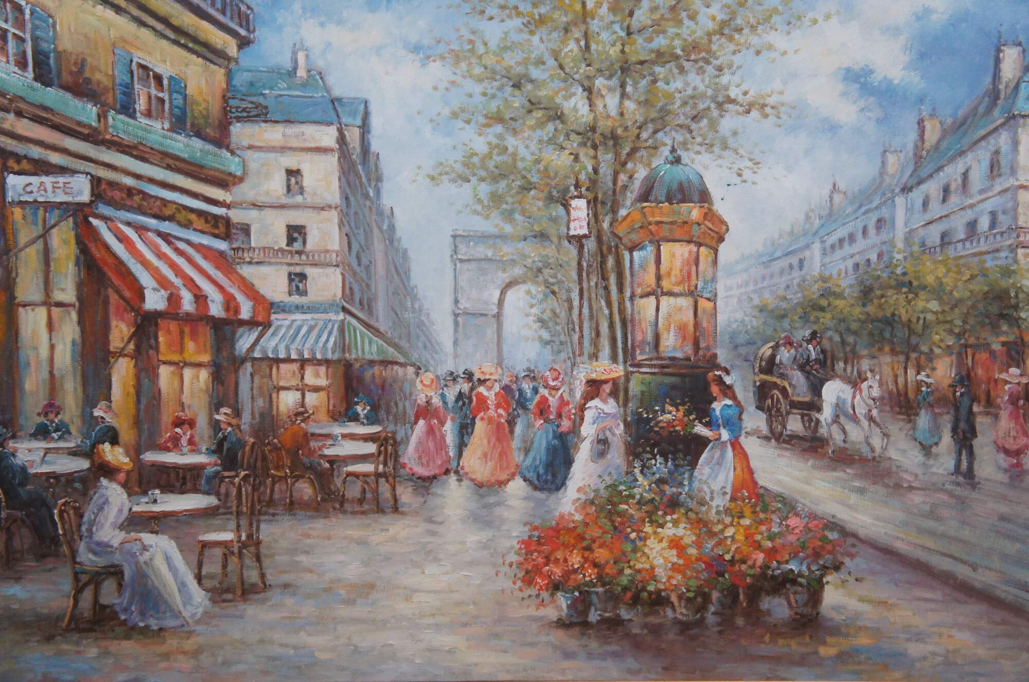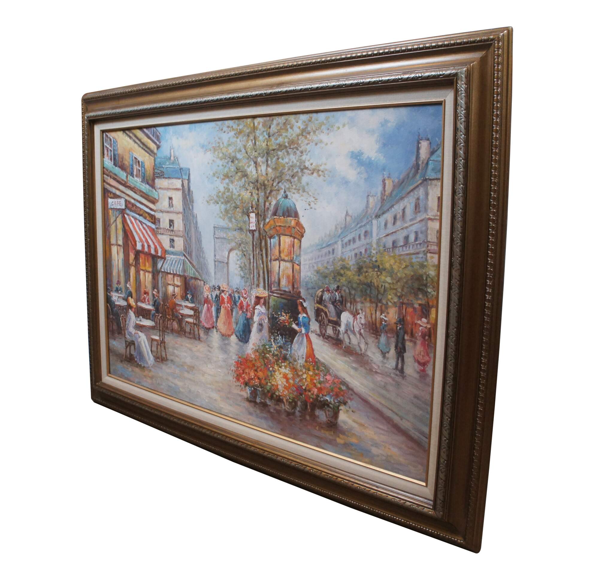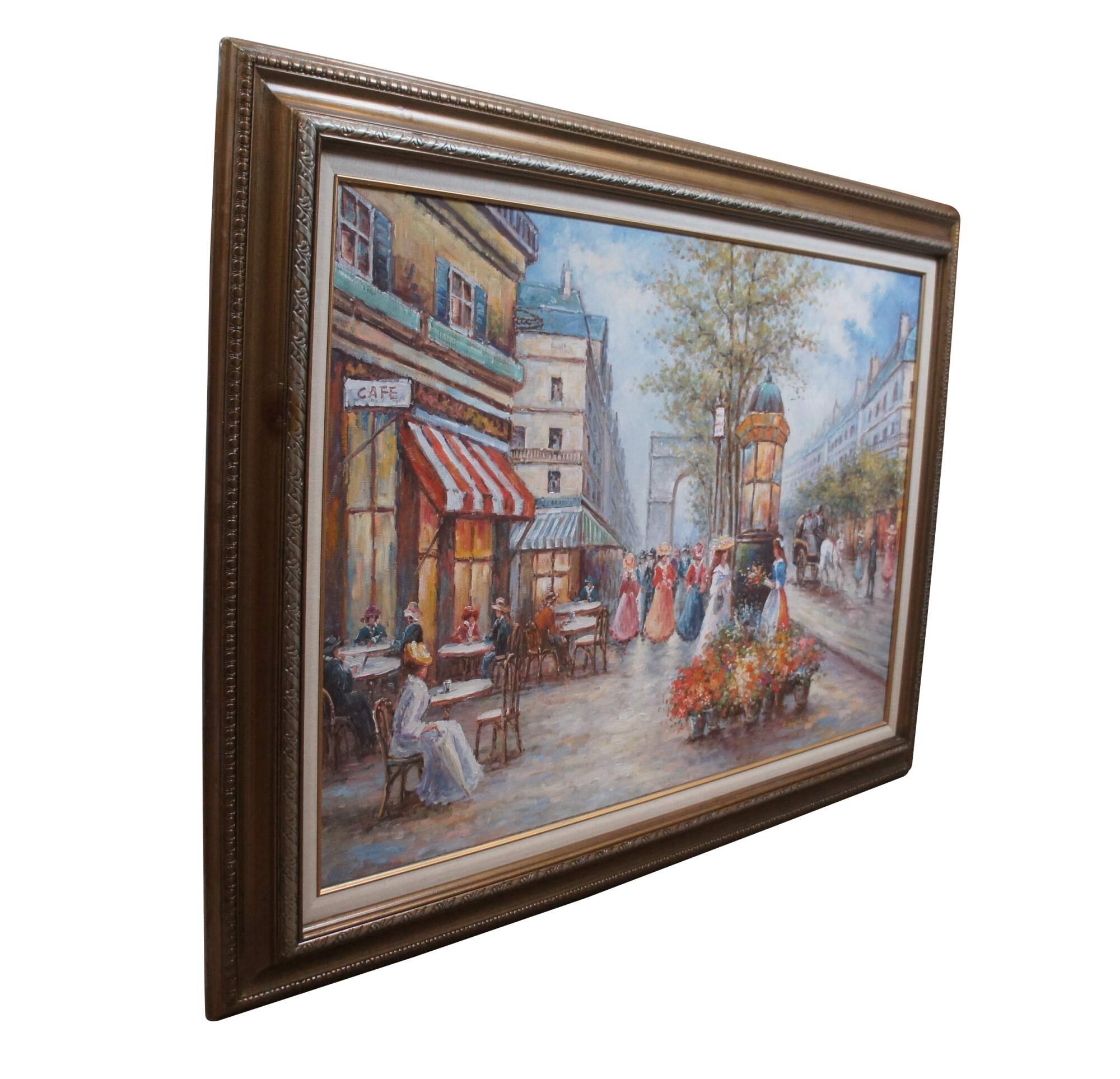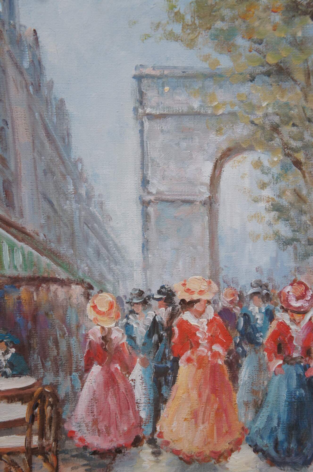 Vintage oil on canvas impressionist painting showing a cityscape / street scene of a cafe lined street in Paris, viewing the Arc de Triomphe filled with figures in Victorian dress. Gilded beveled frame with simple carved details, white linen mat and gilded interior edge.