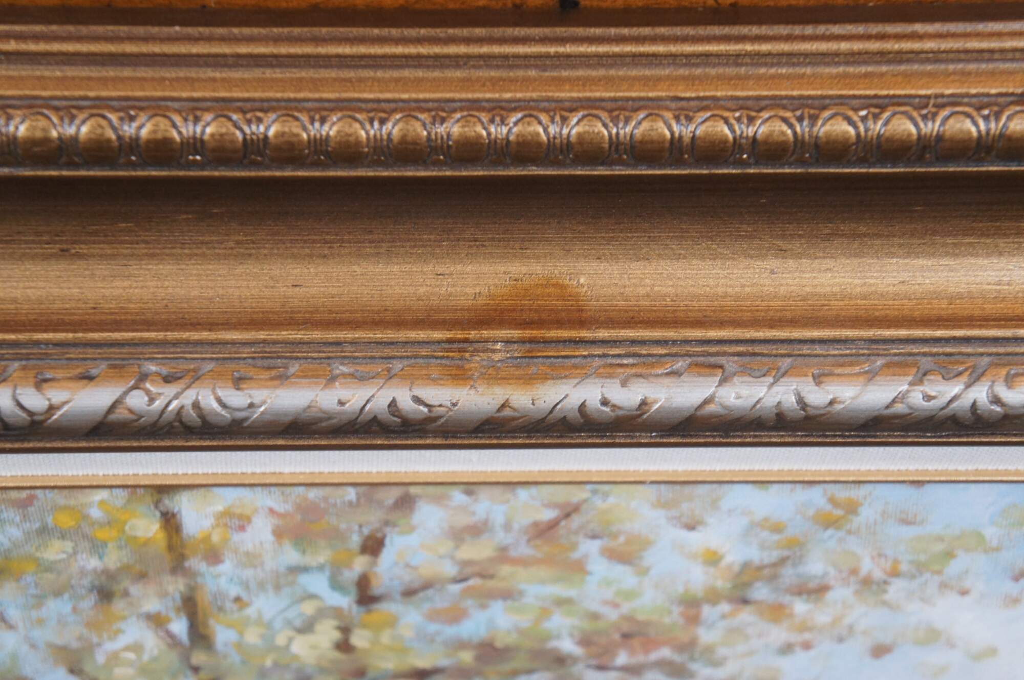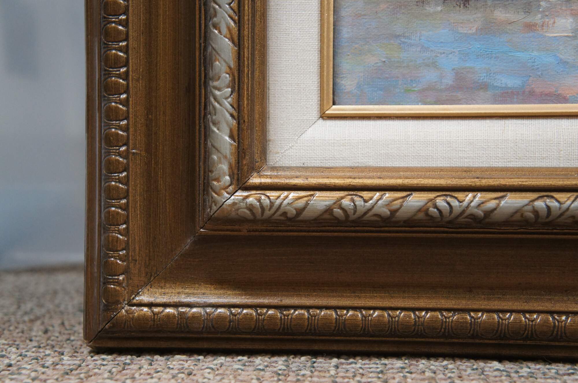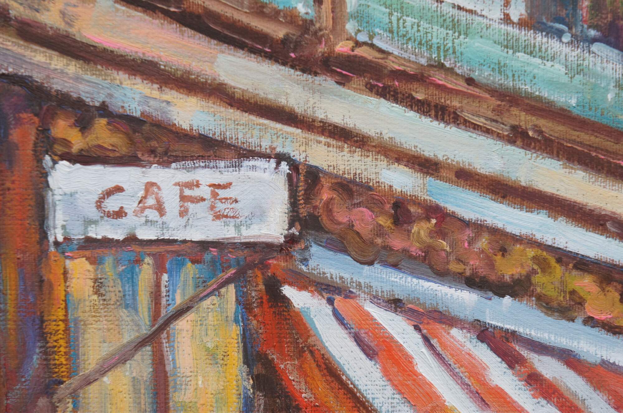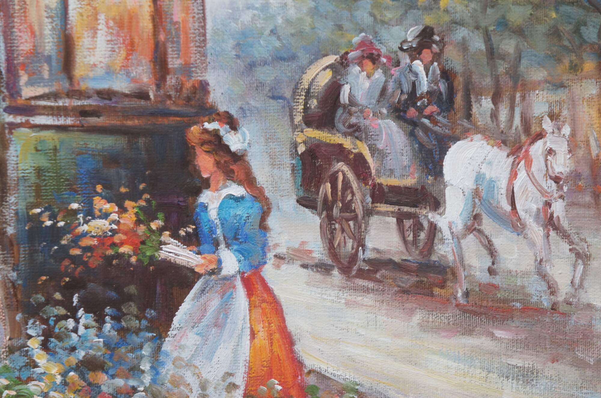 Vintage oil on canvas impressionist painting showing a cityscape / street scene of a cafe lined street in Paris, viewing the Arc de Triomphe filled with figures in Victorian dress. Gilded beveled frame with simple carved details, white linen mat and gilded interior edge.