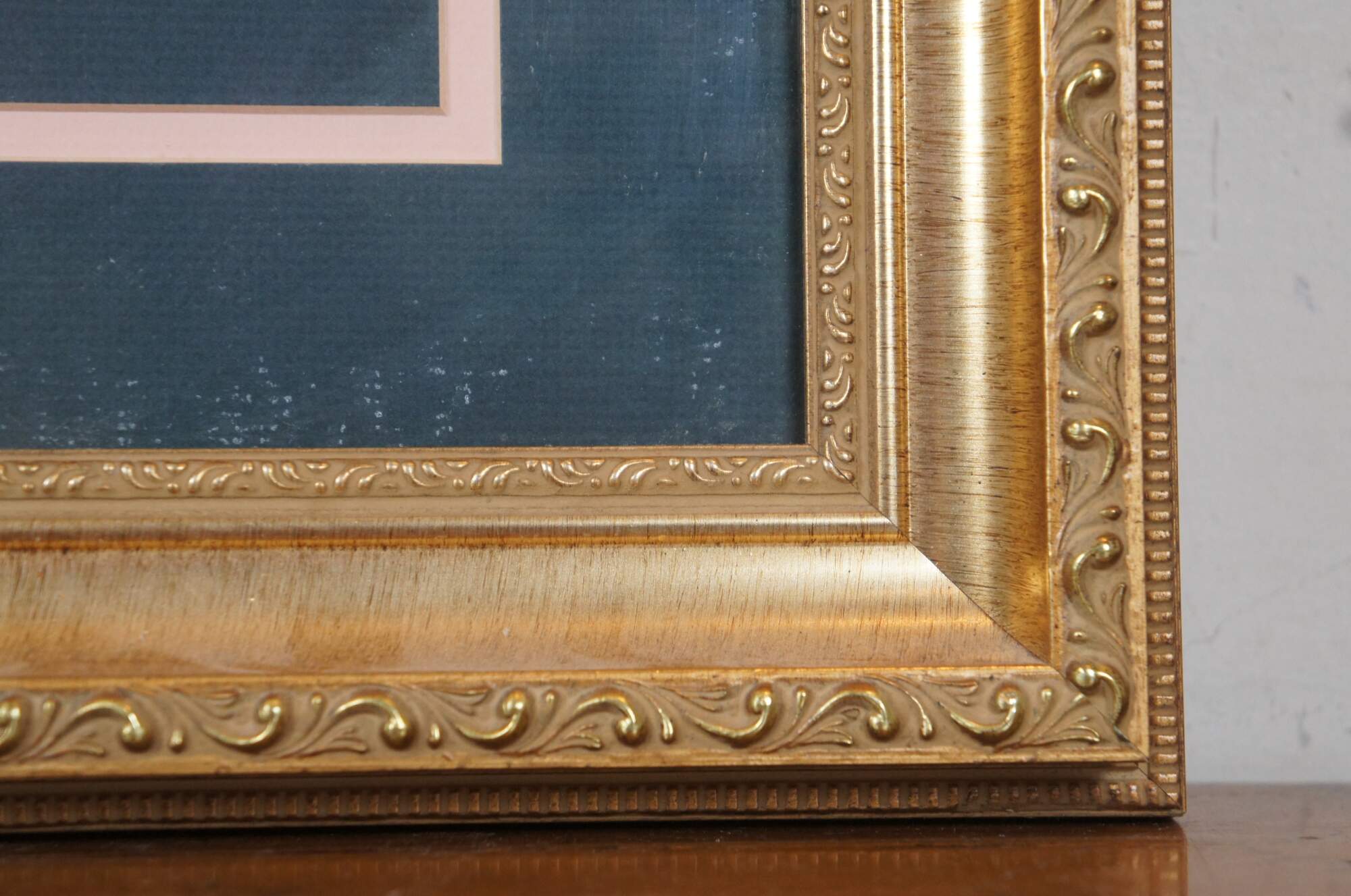 Vintage late 1990s print by Al Federico titled "Royal Street - 1890," showing the titular street in New Orleans' French Quarter, imagined as it would have been in the late Victorian era. Marker signed and numbered 56/1950 in lower left. Dark green and pale pink multi-layered mat; gilded frame with swirling foliate carved details.