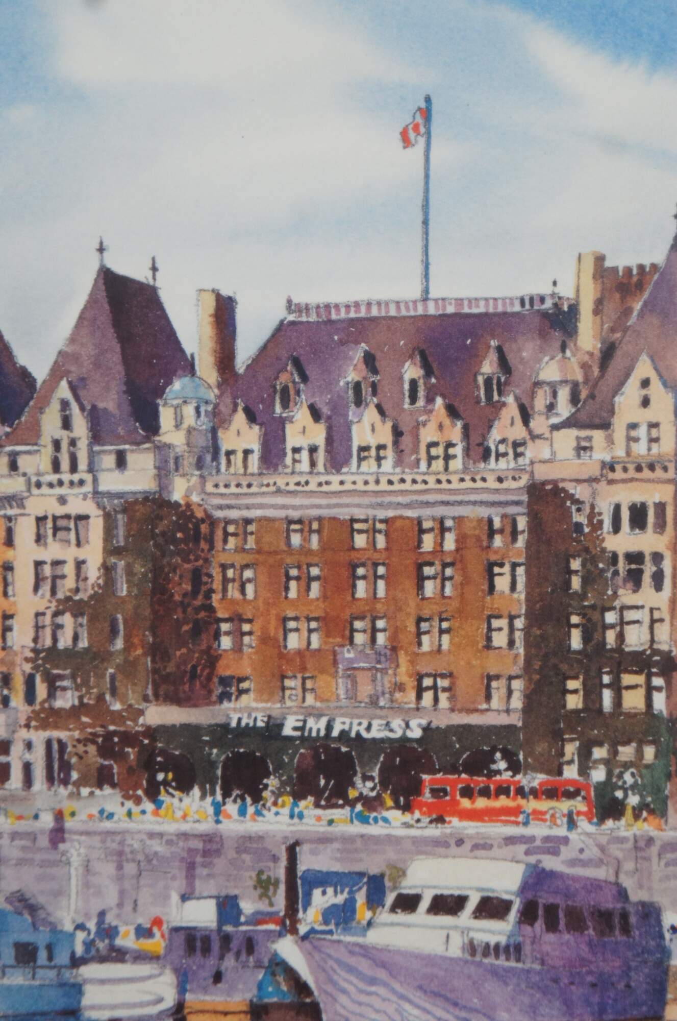 Vintage print by Grant Fuller, showing a view of The Empress Hotel of Victoria, British Columbia, Canada. Signed in plate. Light and dark brown layered mat; rounded wood frame with carved beaded detail.