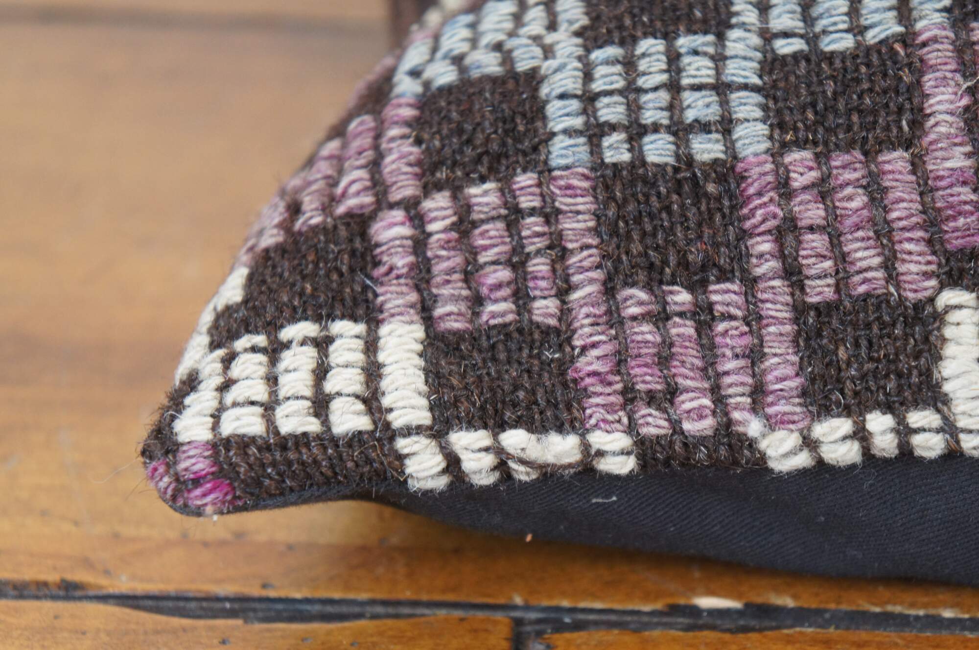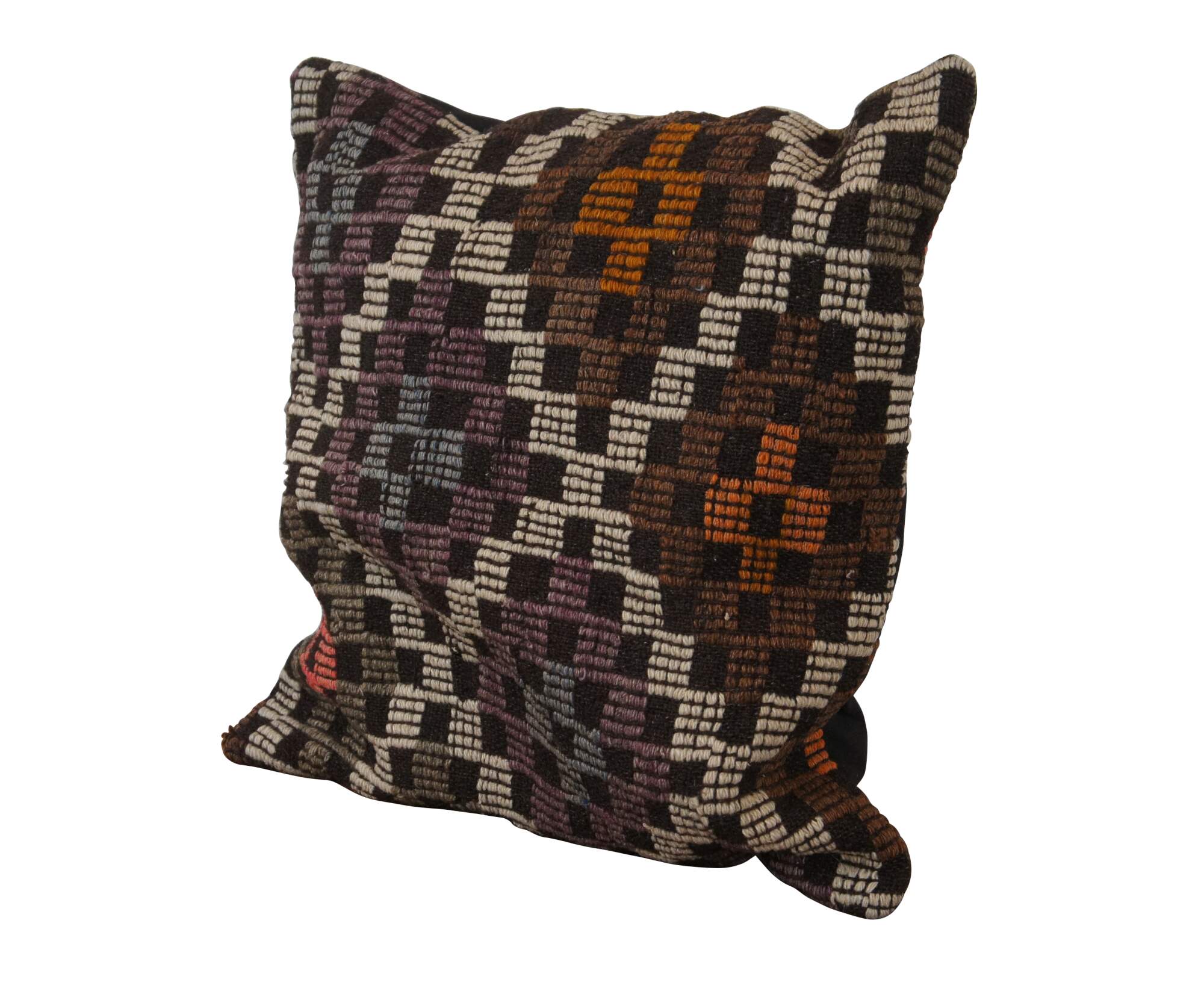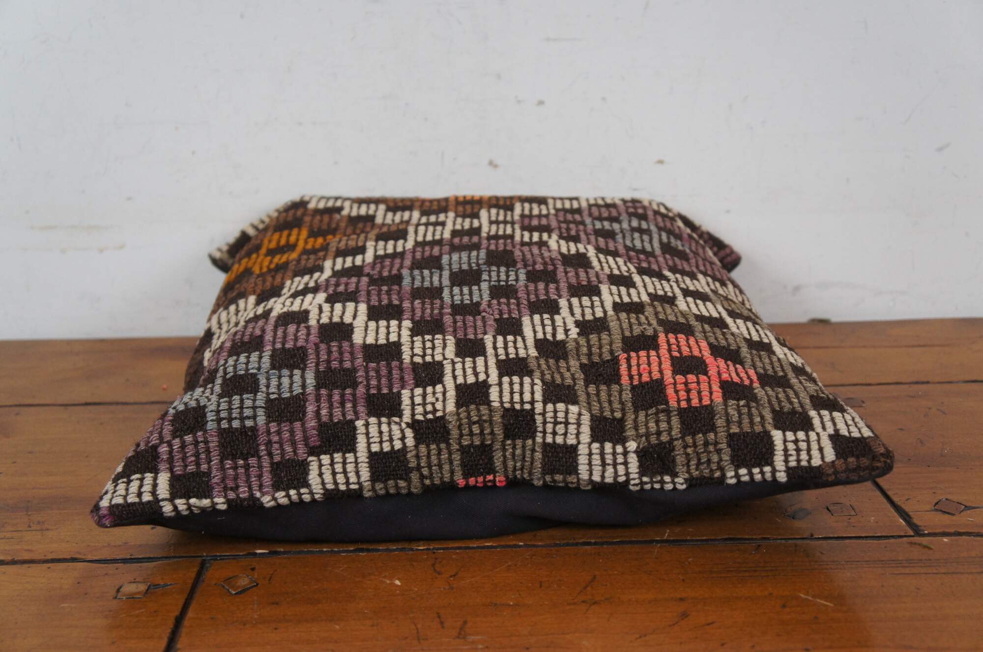 20th century square throw pillow, hand woven wool Oldkilim geometric diamond design in brown, white, gray, purple, orange and blue. Black cotton back with zipper closure. Bamboo fiber filled. Made in Turkey.