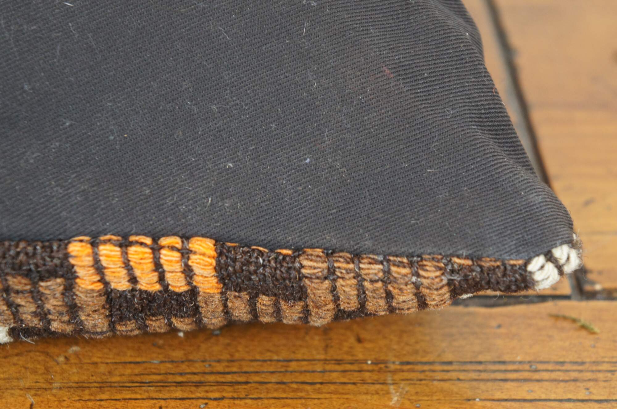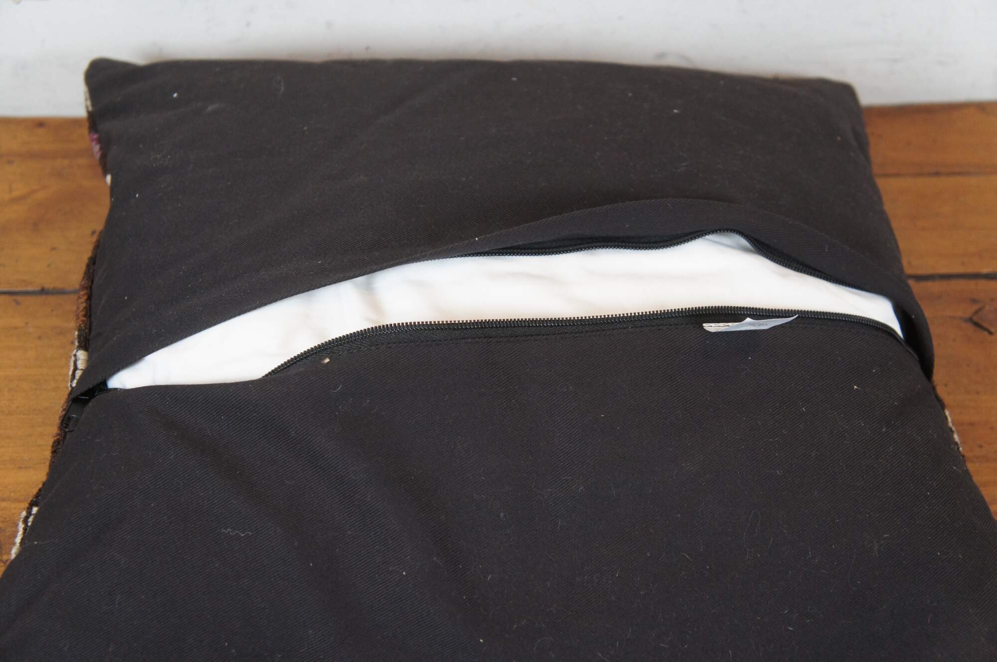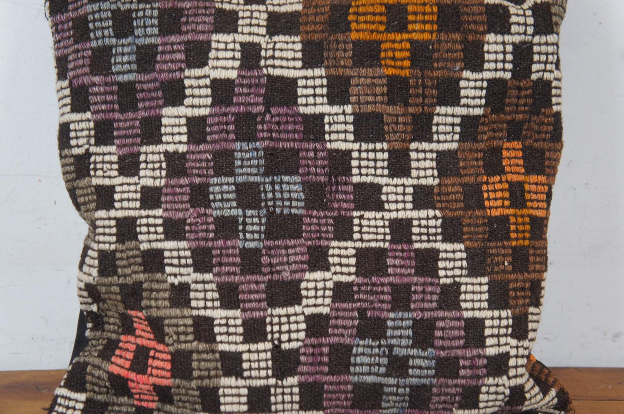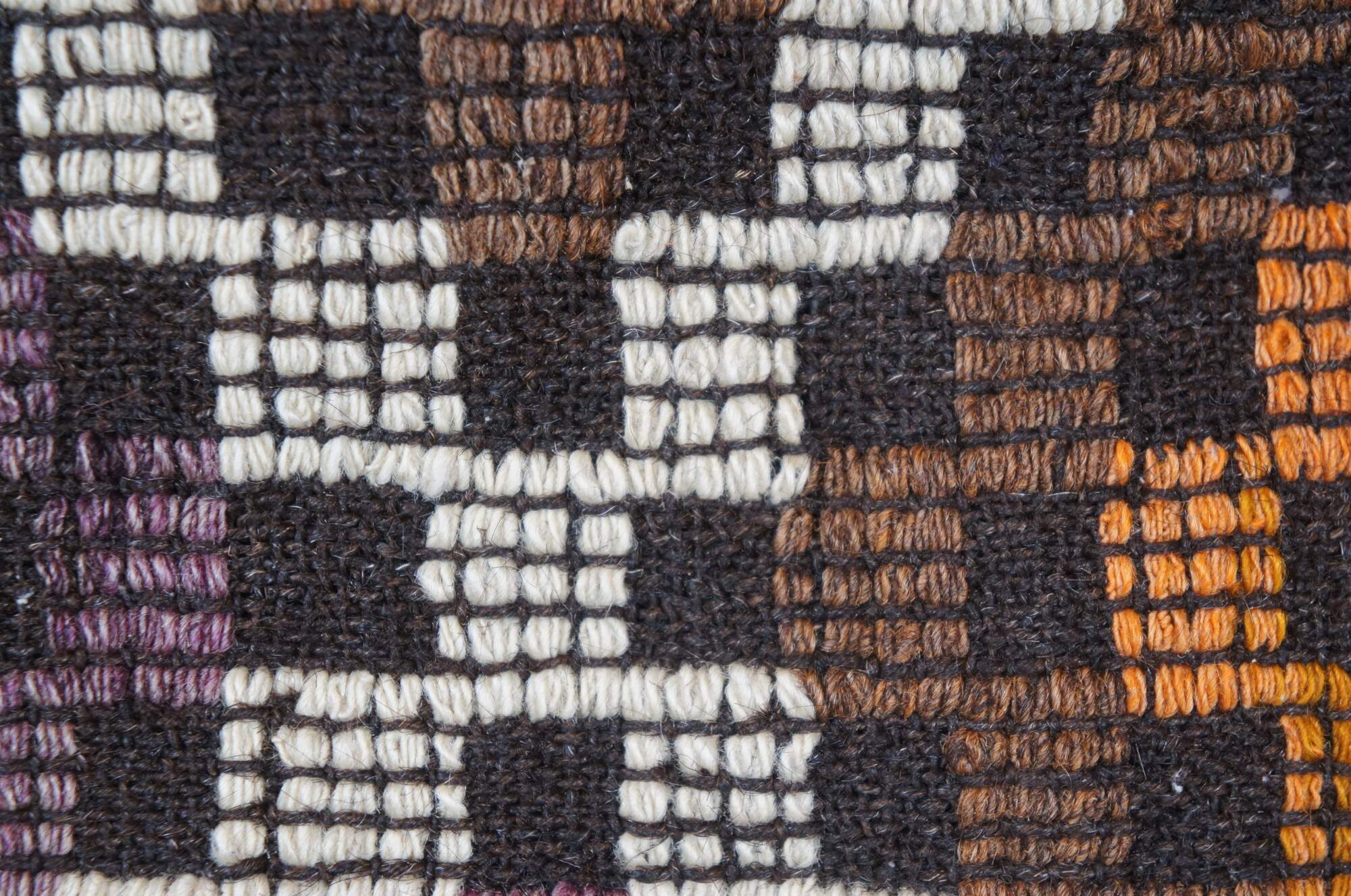 20th century square throw pillow, hand woven wool Oldkilim geometric diamond design in brown, white, gray, purple, orange and blue. Black cotton back with zipper closure. Bamboo fiber filled. Made in Turkey.