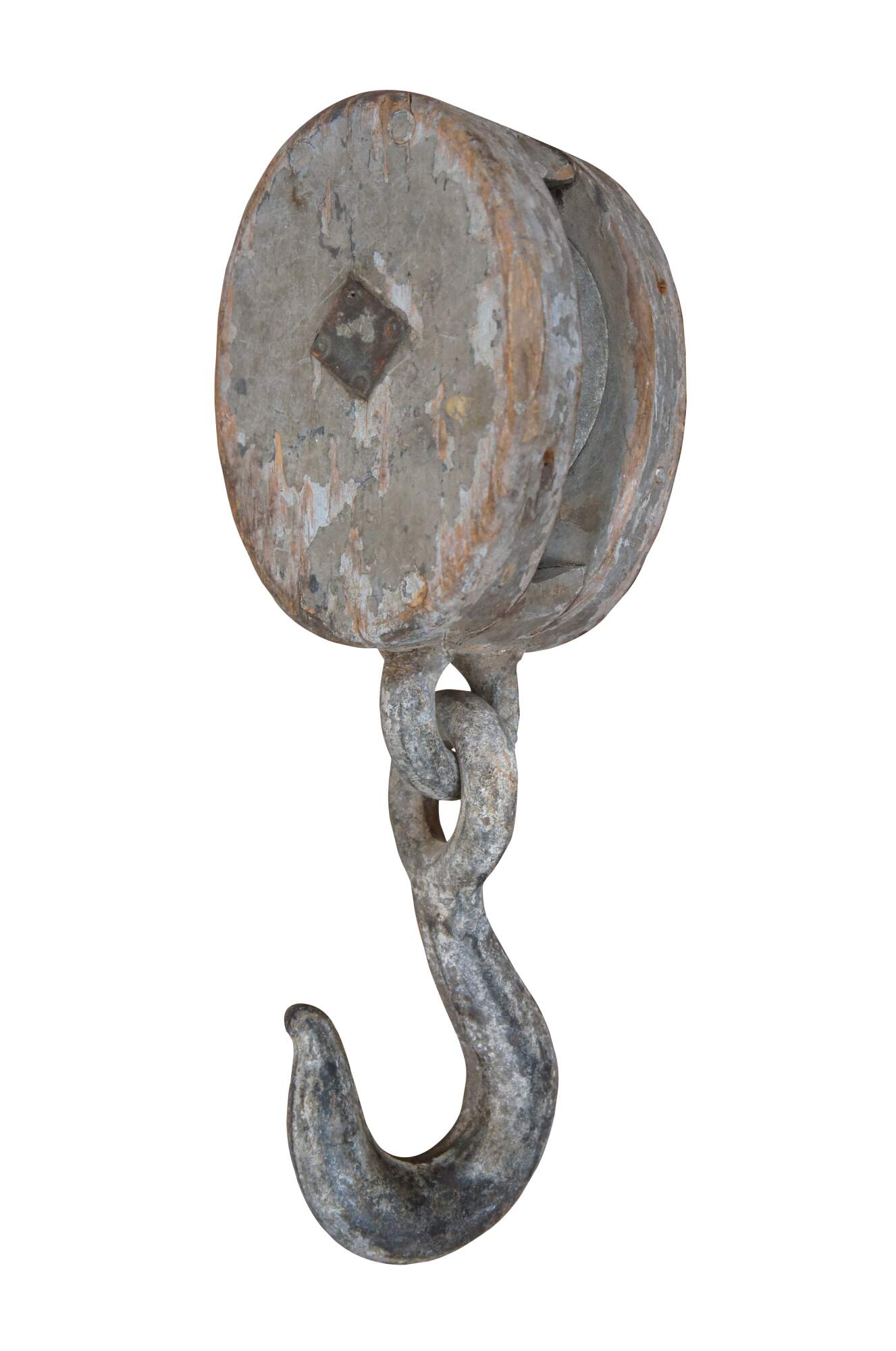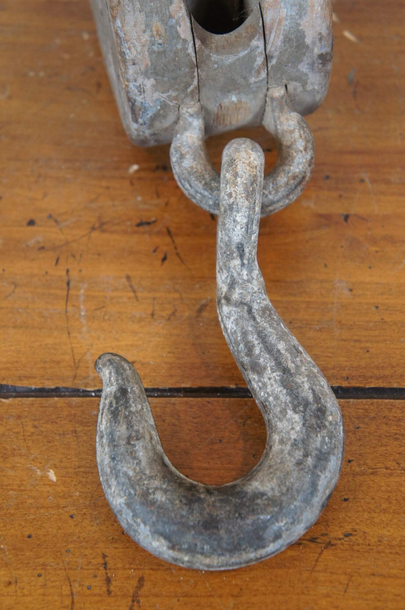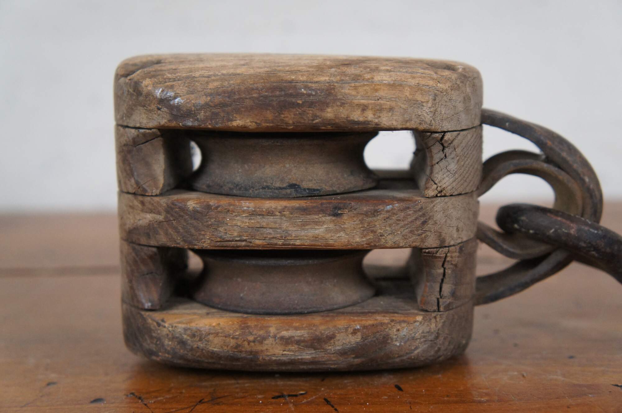 Pair of antique wood block and iron industrial pulley hooks. Larger has one pulley wheel, smaller contains two pulley wheels.